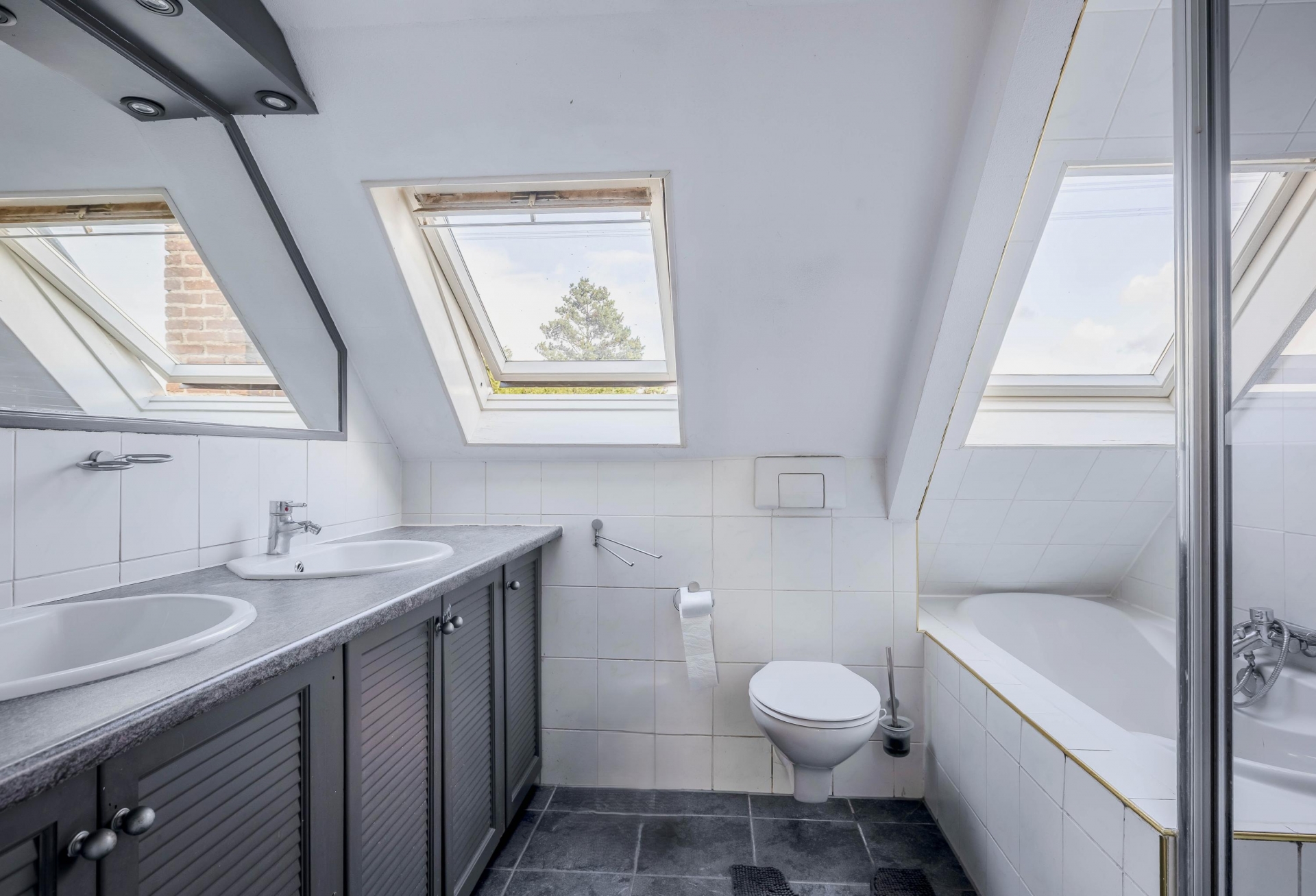 De badkamer (ca. 6 m²) is compleet uitgevoerd en voorzien van een inloopdouche, een ligbad, een toilet en een dubbel wastafelmeubel. De combinatie van comfort, ruimte en praktische indeling maakt deze verdieping uitermate functioneel én aangenaam om in te verblijven.