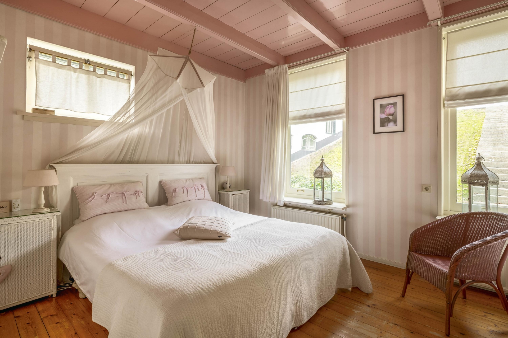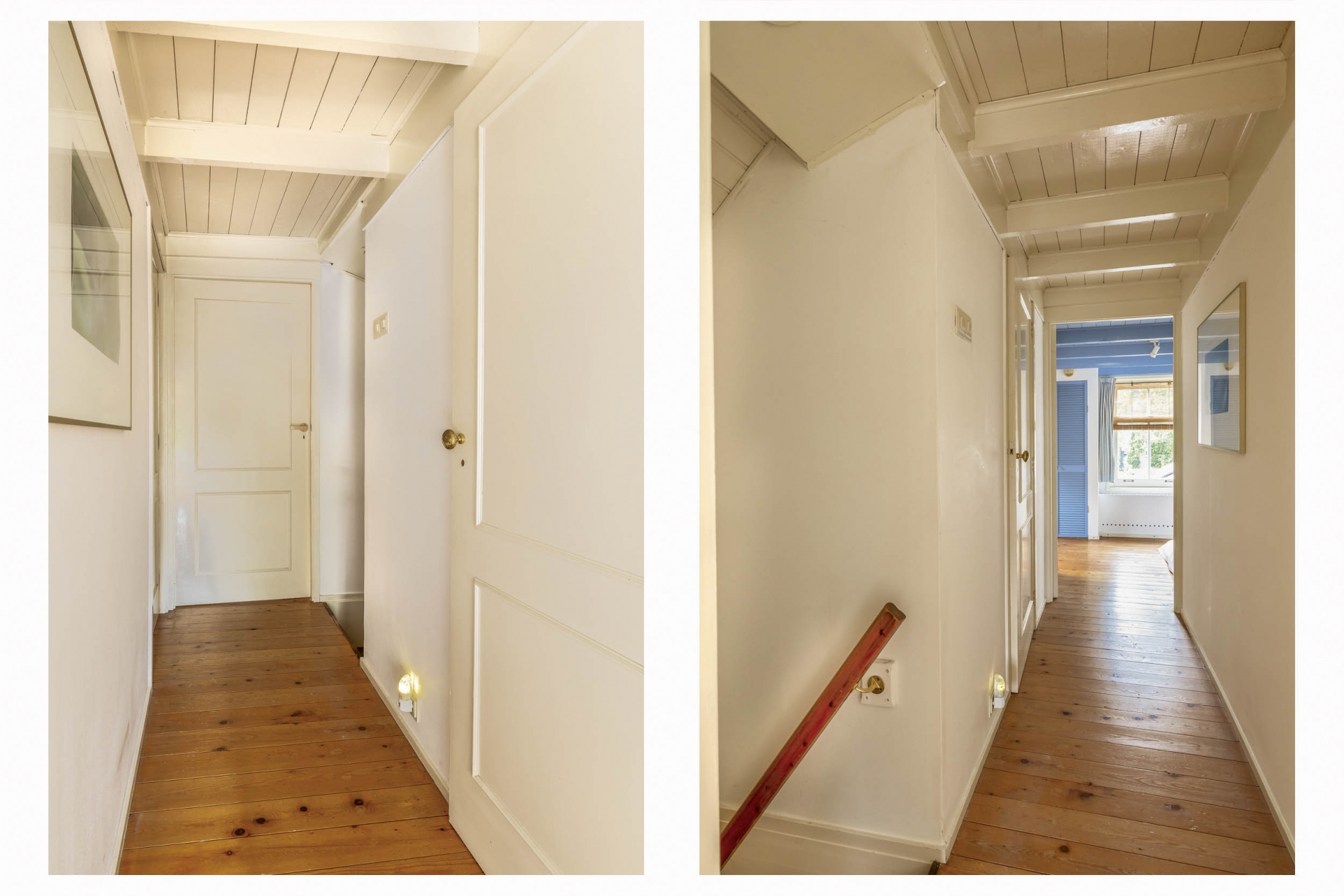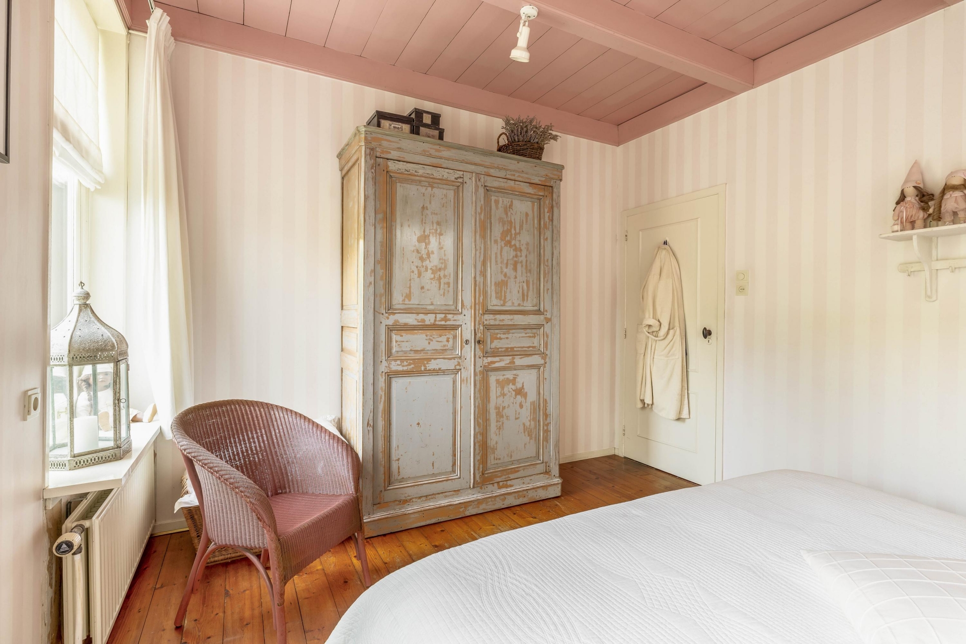 Op de verdieping bevinden zich drie charmante slaapkamers – elk met vaste kasten, bedstede-elementen of dakkapellen – en een overloop met voldoende bergruimte. Er is een aparte kast waar eventueel een tweede toilet gerealiseerd kan worden (waterafvoer aanwezig). Boven de verdieping bevindt zich nog een praktische bergvliering, bereikbaar via een losse trap.