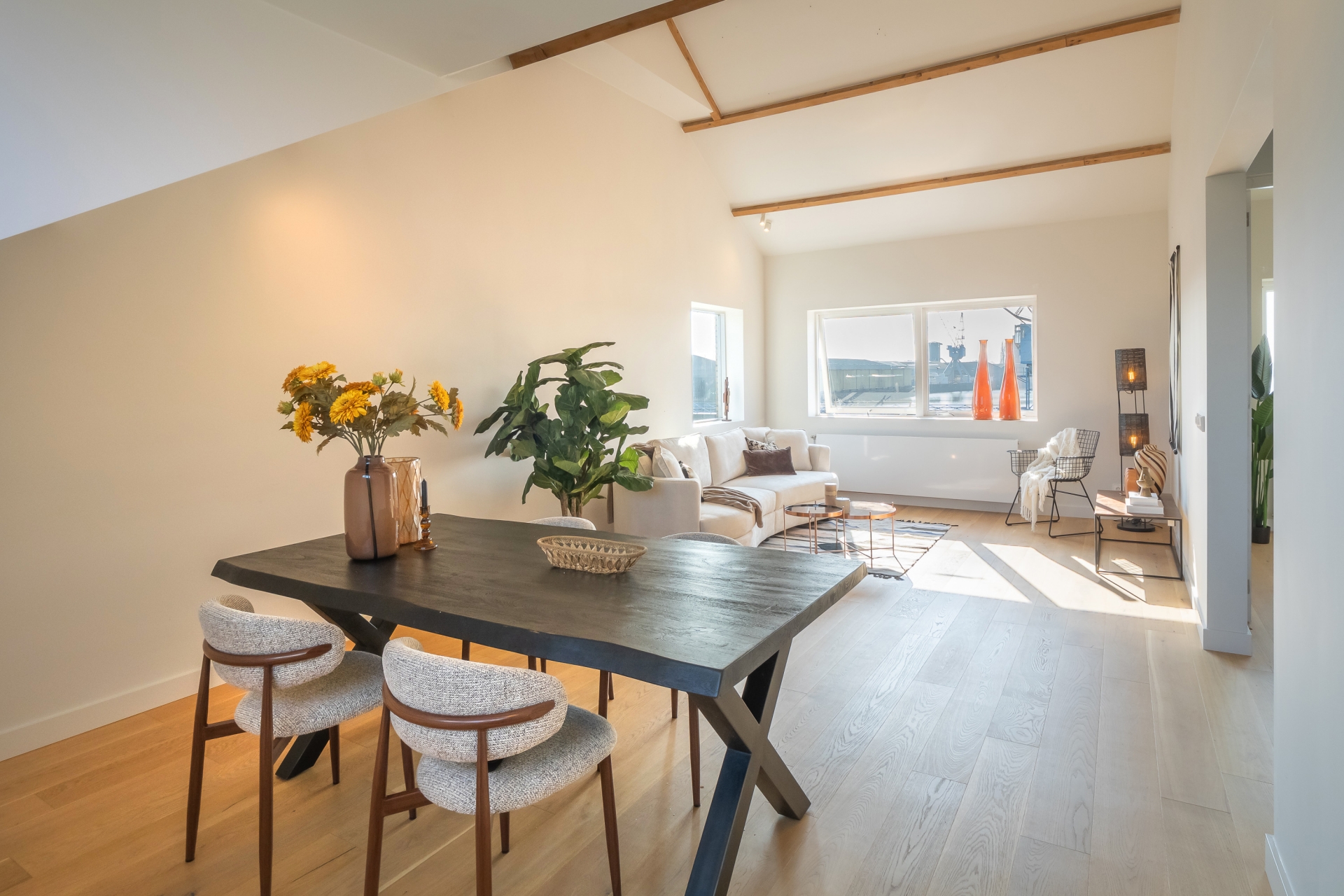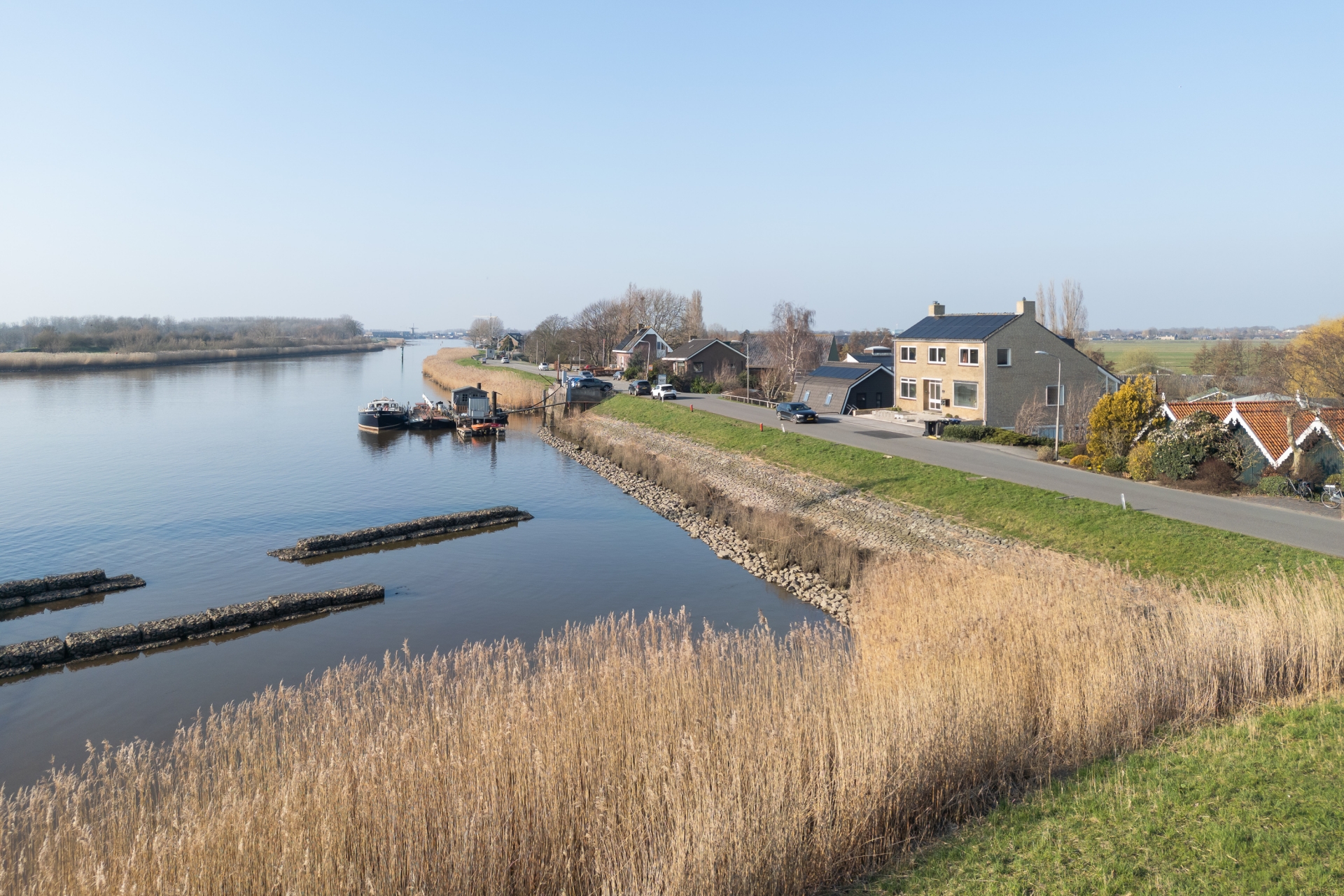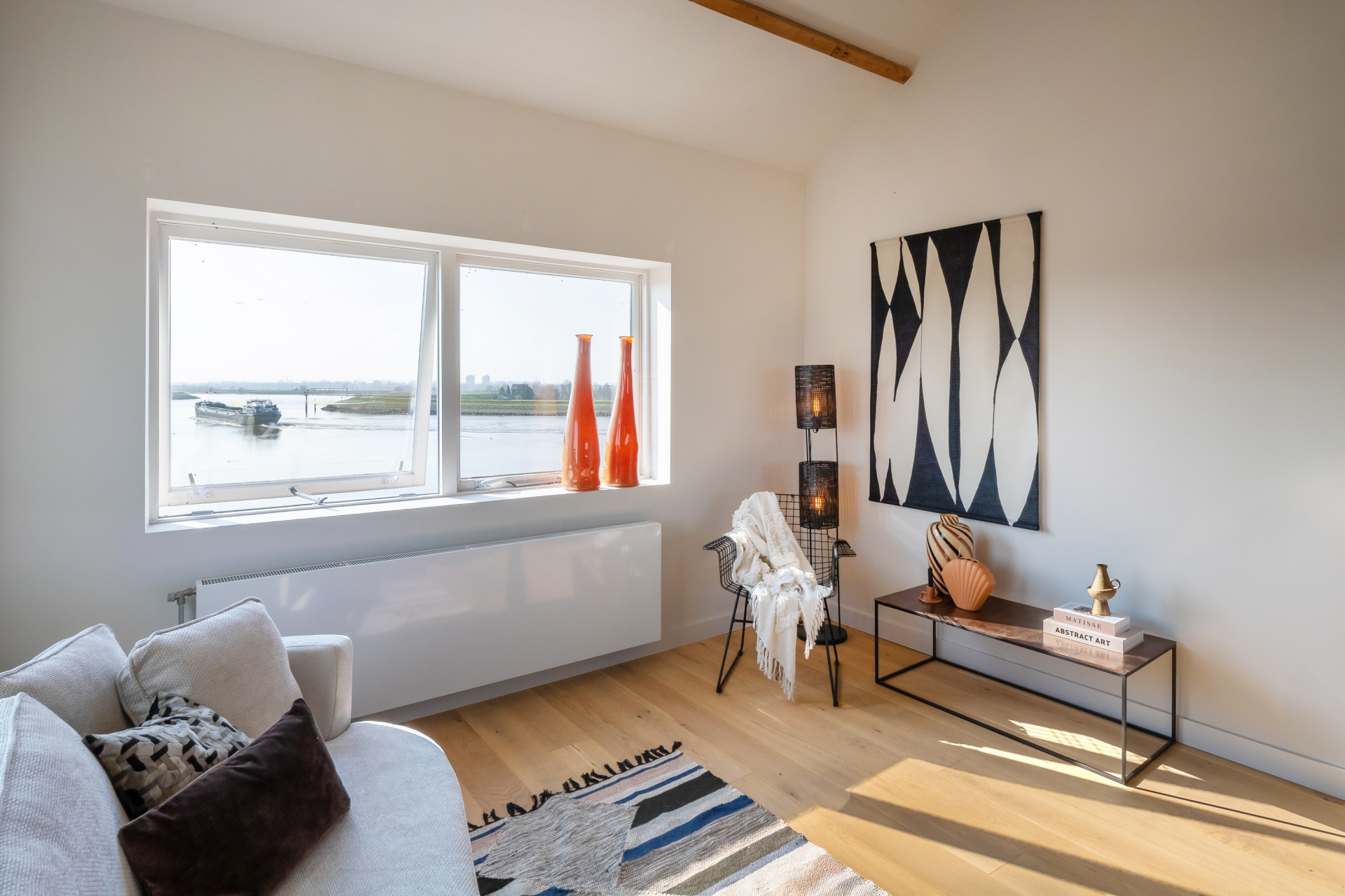De woonkamer is strak afgewerkt met gestucte wanden en is op te delen in een zit- en eetgedeelte. Aan de voorzijde kijk je uit over de IJssel en aan de achterzijde heb je zicht op het polderlandschap.