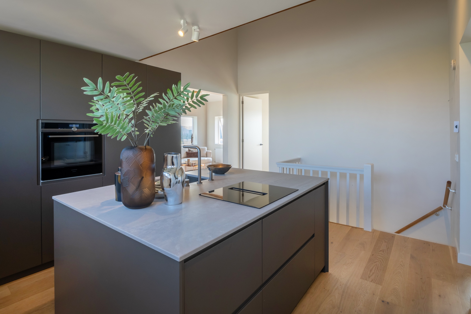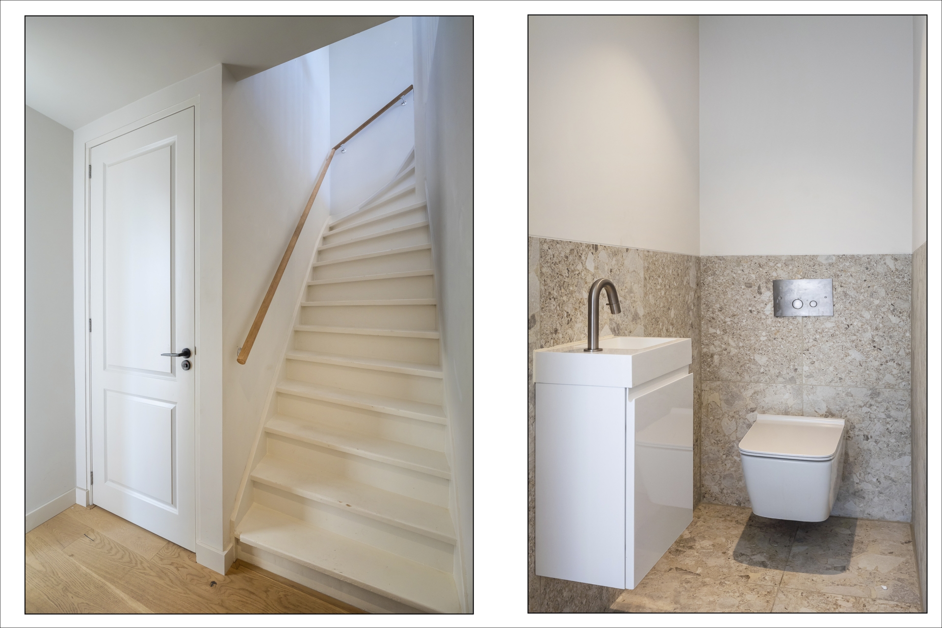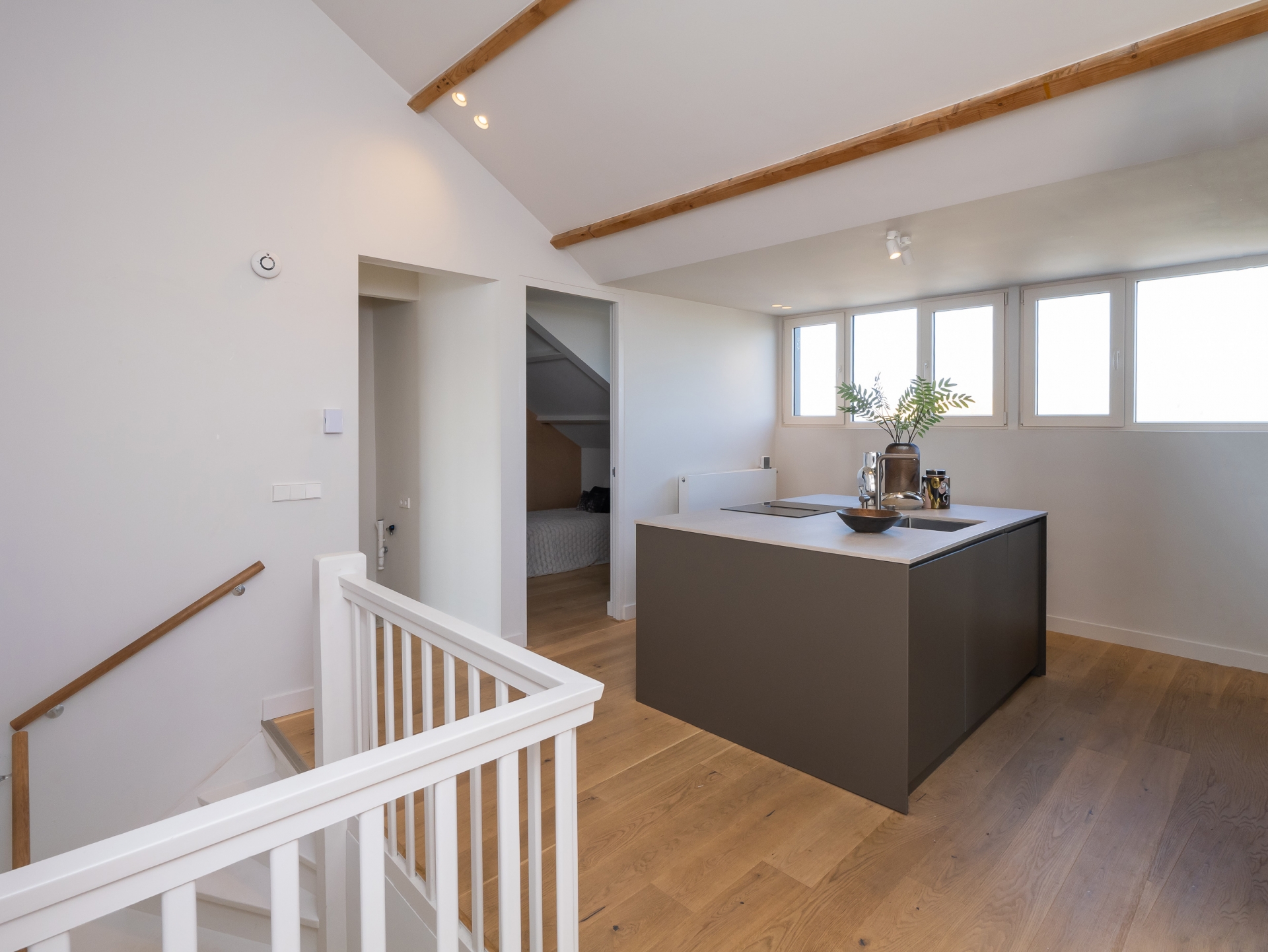 Via de ingang bovendijks kom je kom je in de gemeenschappelijke hal met meterkast. Vanuit de hal loop je door naar de trapopgang met separaat toilet. Via de trap kom je uit op de overloop met toegang tot alle ruimtes. Hier vallen meteen de prachtig hoge planfonds op. De woonkeuken beschikt over een kookeiland en alle benodigde inbouwapparatuur, zoals een inductiekookplaat met geïntegreerde afzuigkap, vaatwasser, combi-oven, koelkast, vriezer en voldoende opbergruimte.
