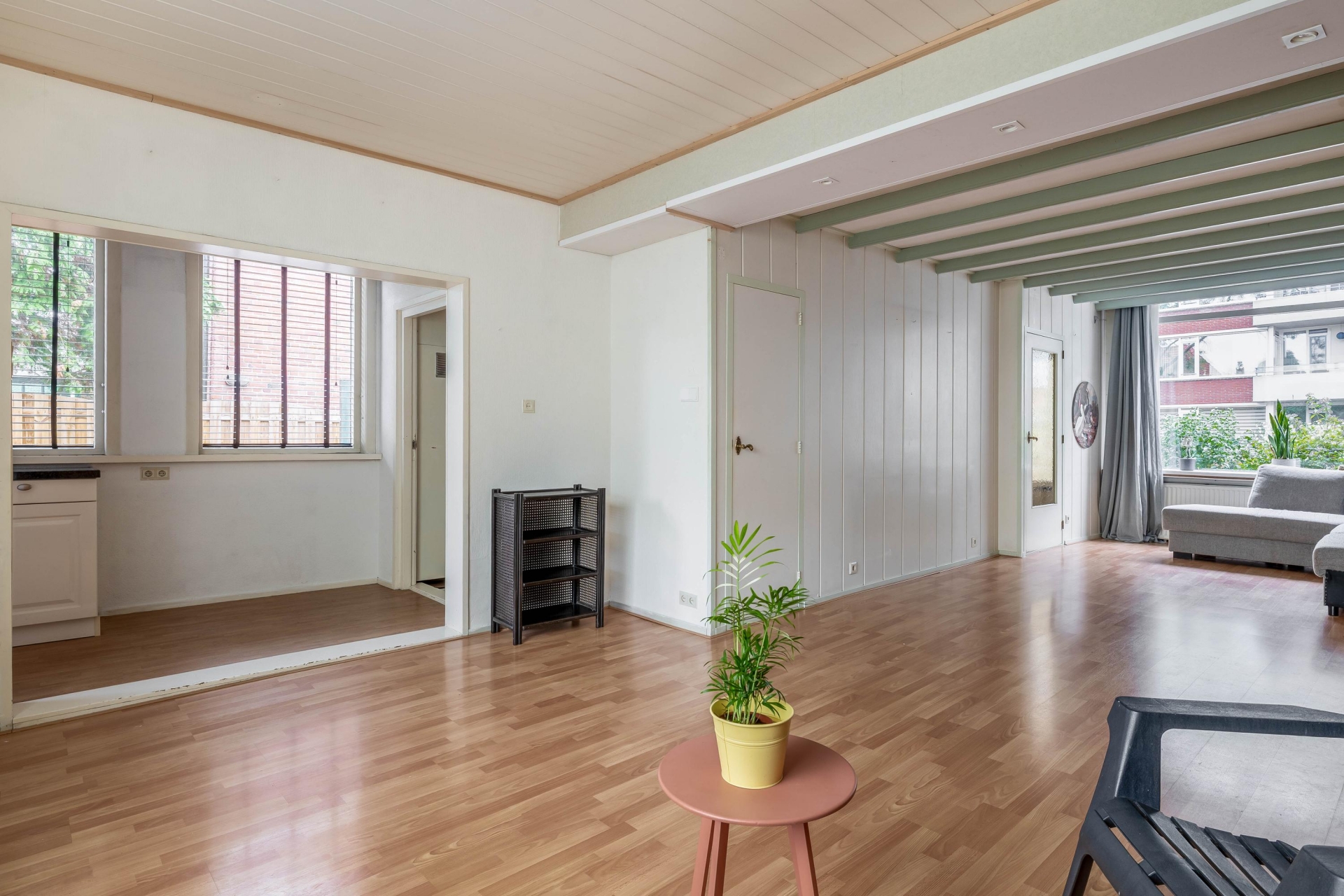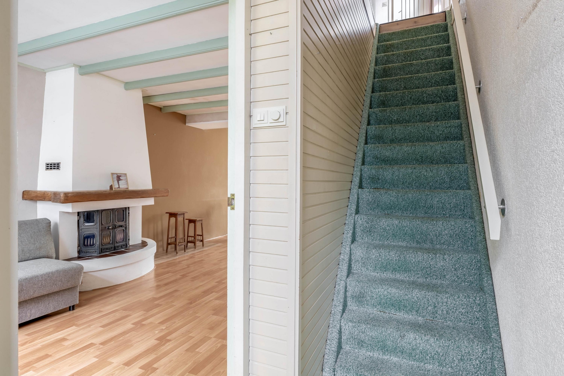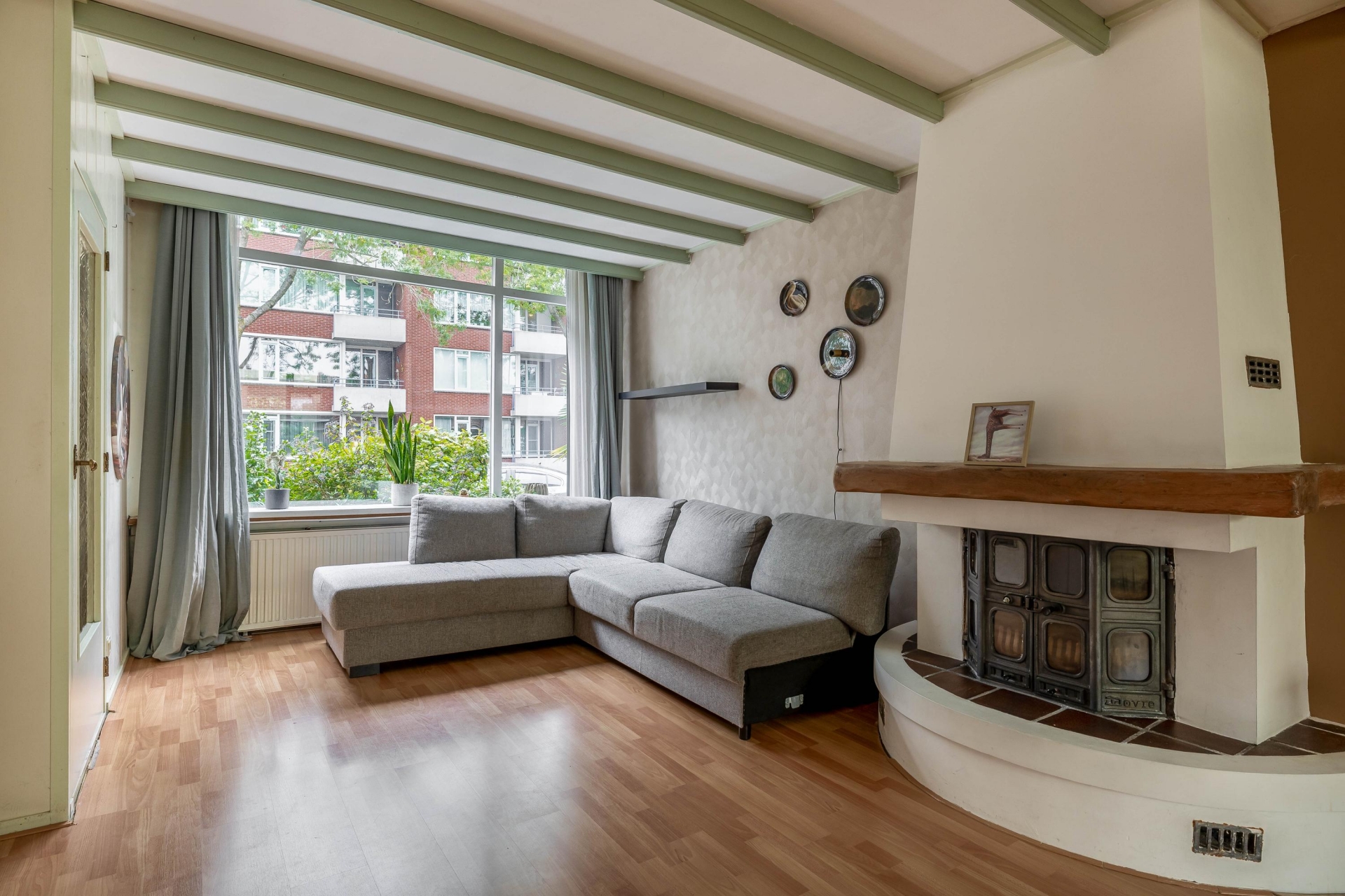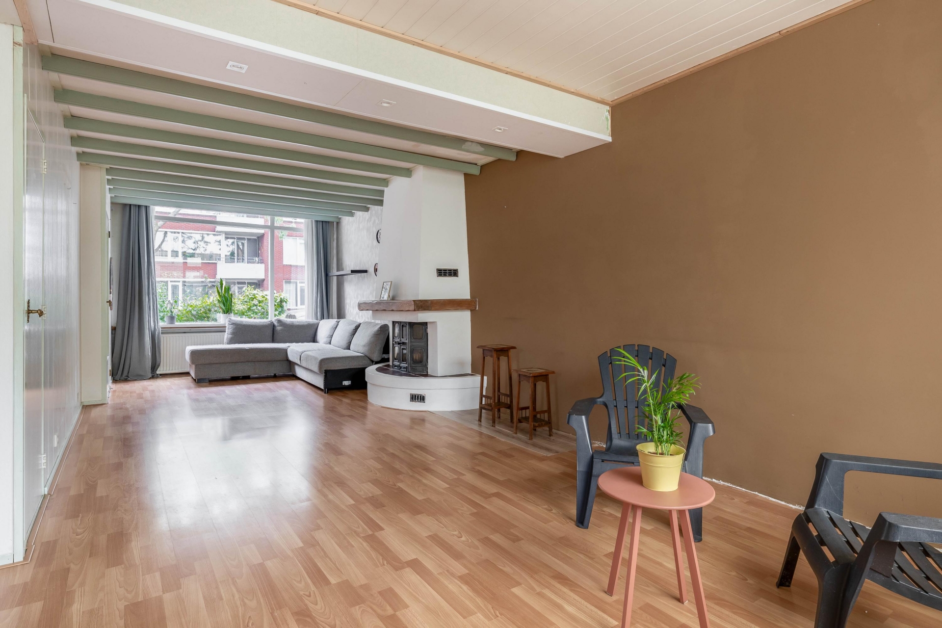De woonkamer is het hart van het huis. Grote ramen aan de voorzijde zorgen voor veel natuurlijk licht en een prettige verbinding met de straat. De zichtbare balken en karakteristieke houtkachel.