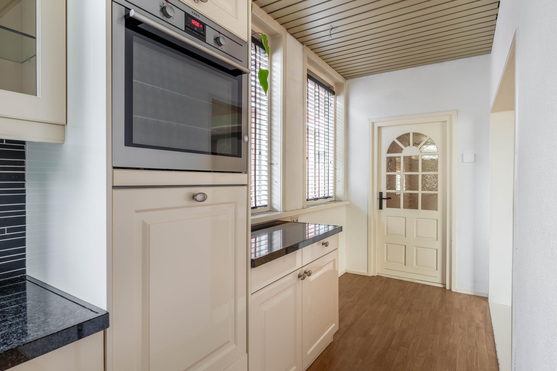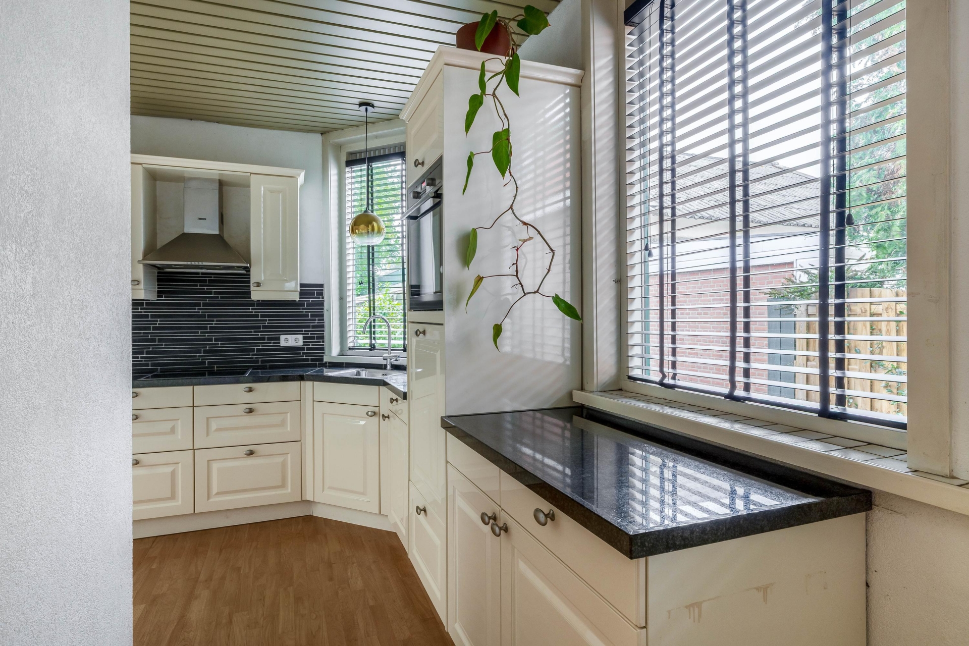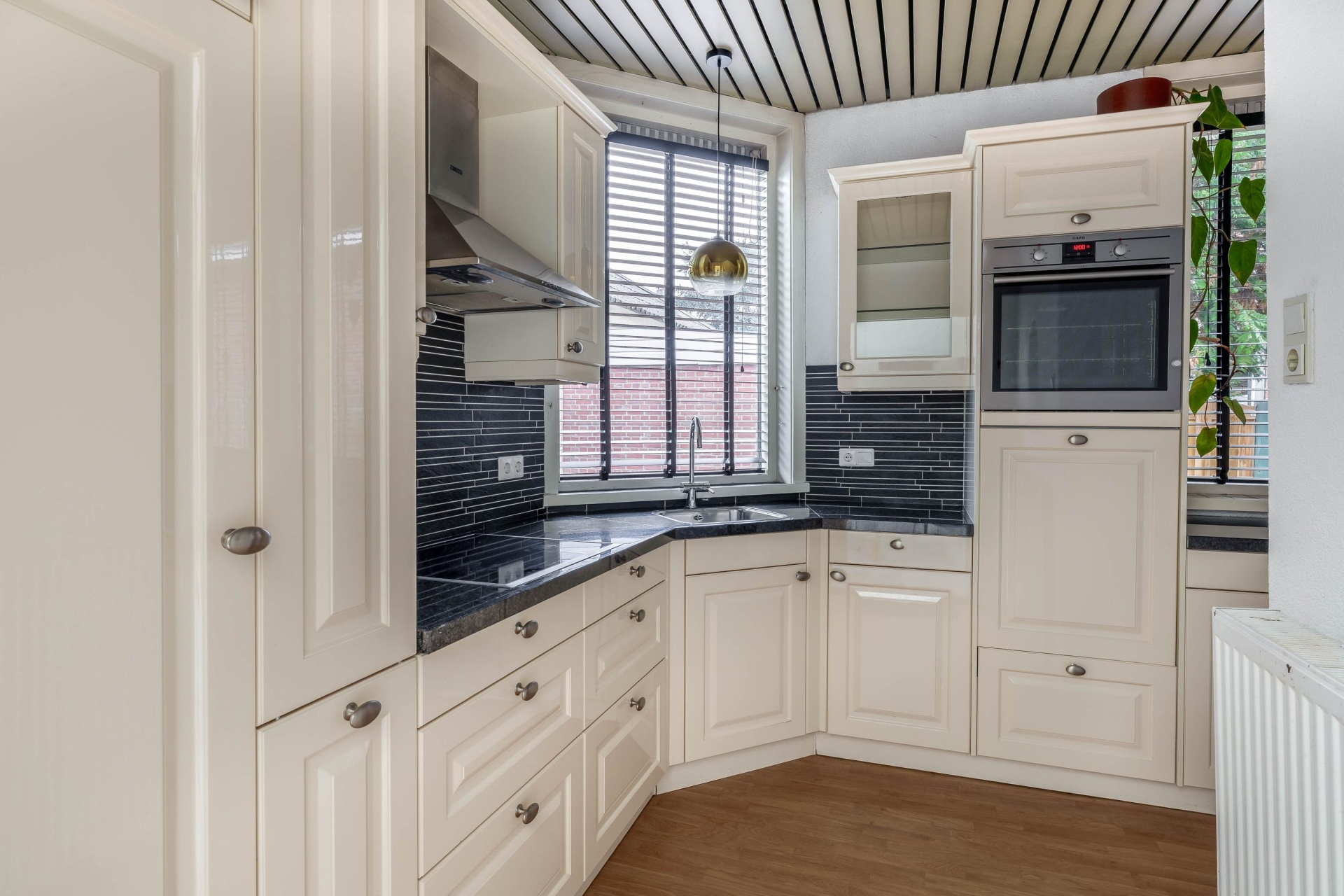 Aan de achterzijde bevindt zich de landelijke keuken in L-opstelling. Met lichte fronten, een zwart werkblad en voldoende kastruimte past deze stijl perfect bij het karakter van het huis. Vanuit de keuken loop je door naar de serre aan de achterzijde, een heerlijke plek om ’s ochtends een kop koffie te drinken of in de middag te genieten van het uitzicht op de tuin.