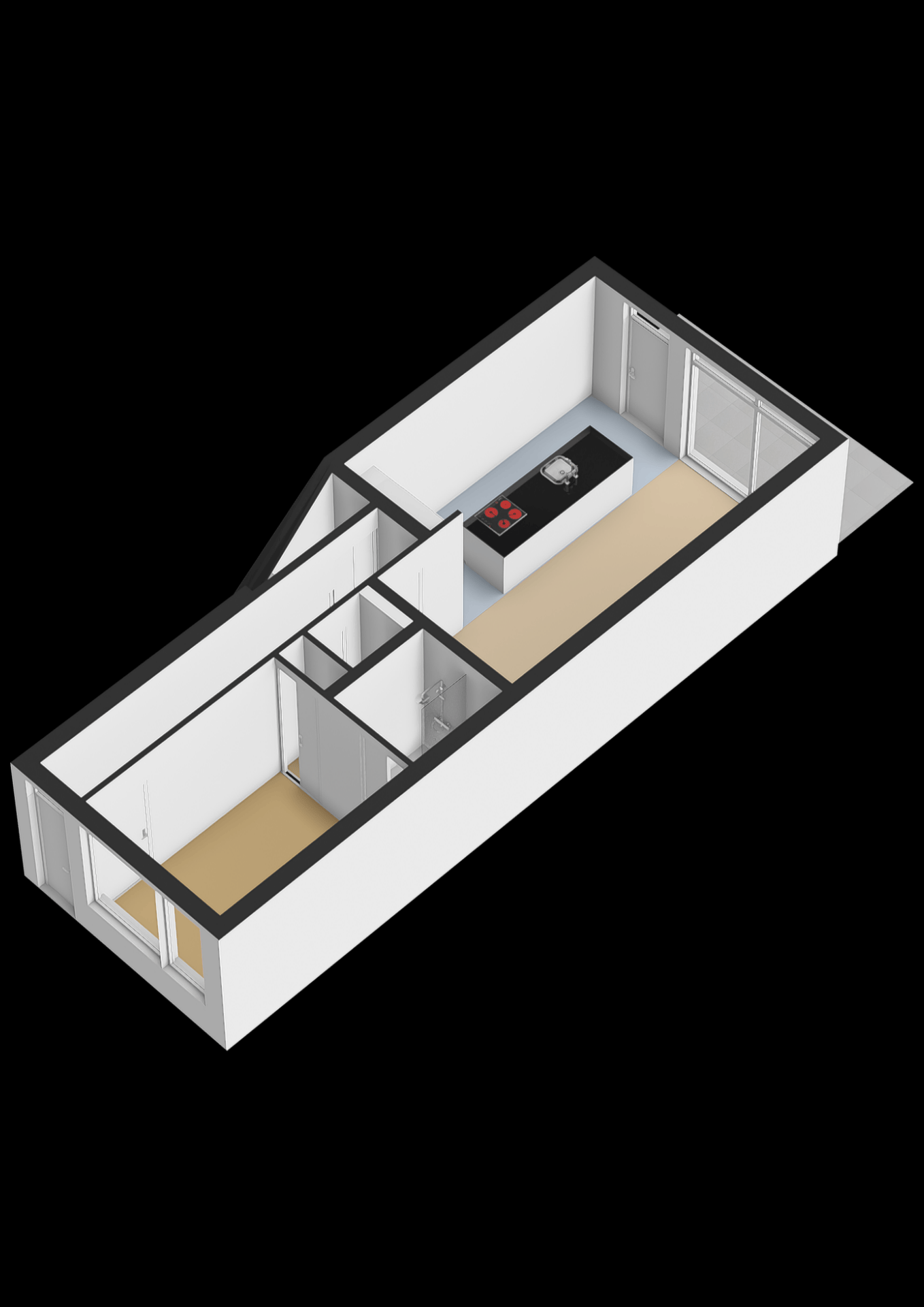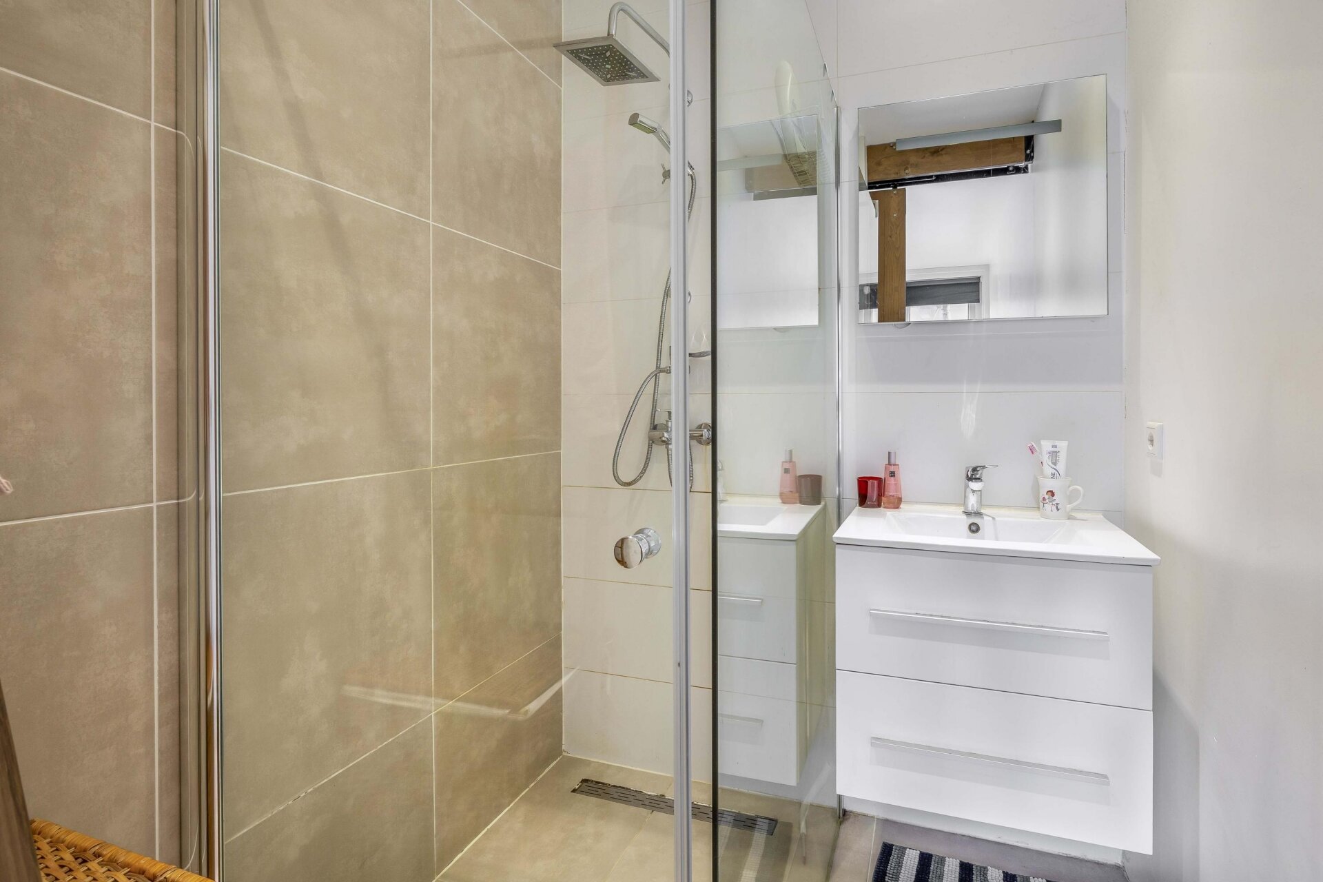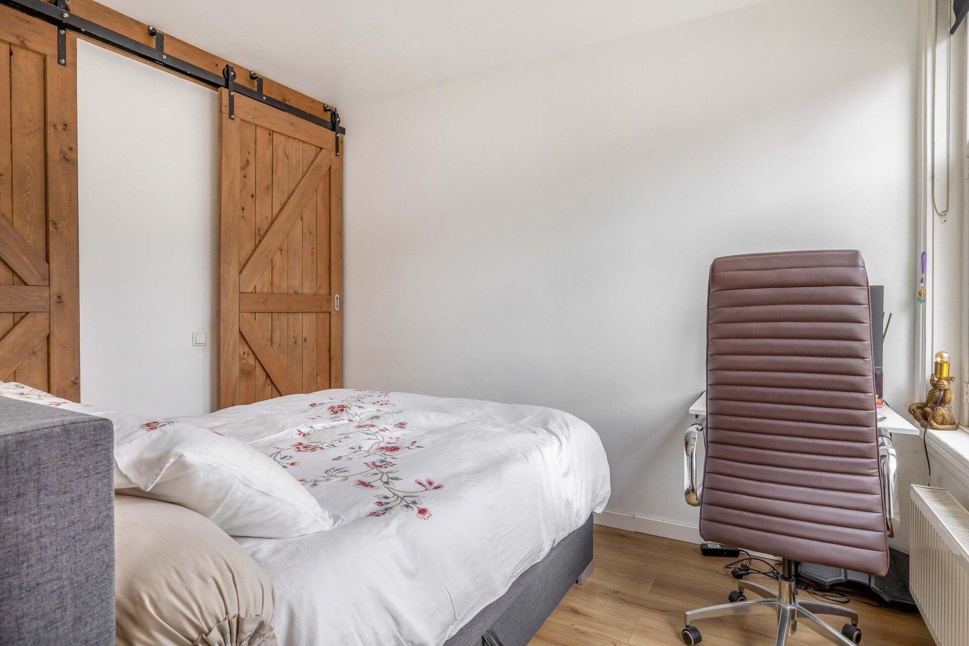Via je eigen voordeur stap je binnen op de begane grond. De hal verbindt alle ruimtes met elkaar. Aan de voorzijde ligt een rustige slaapkamer met inloopkast en handige badkamer en-suite. De badkamer is modern afgewerkt met een ruime inloopdouche, strak wastafelmeubel, inbouwspots en mechanische ventilatie – alles strak en fris. Het aparte toilet is in dezelfde stijl doorgetrokken, met een modern wandcloset en hoekfonteintje.