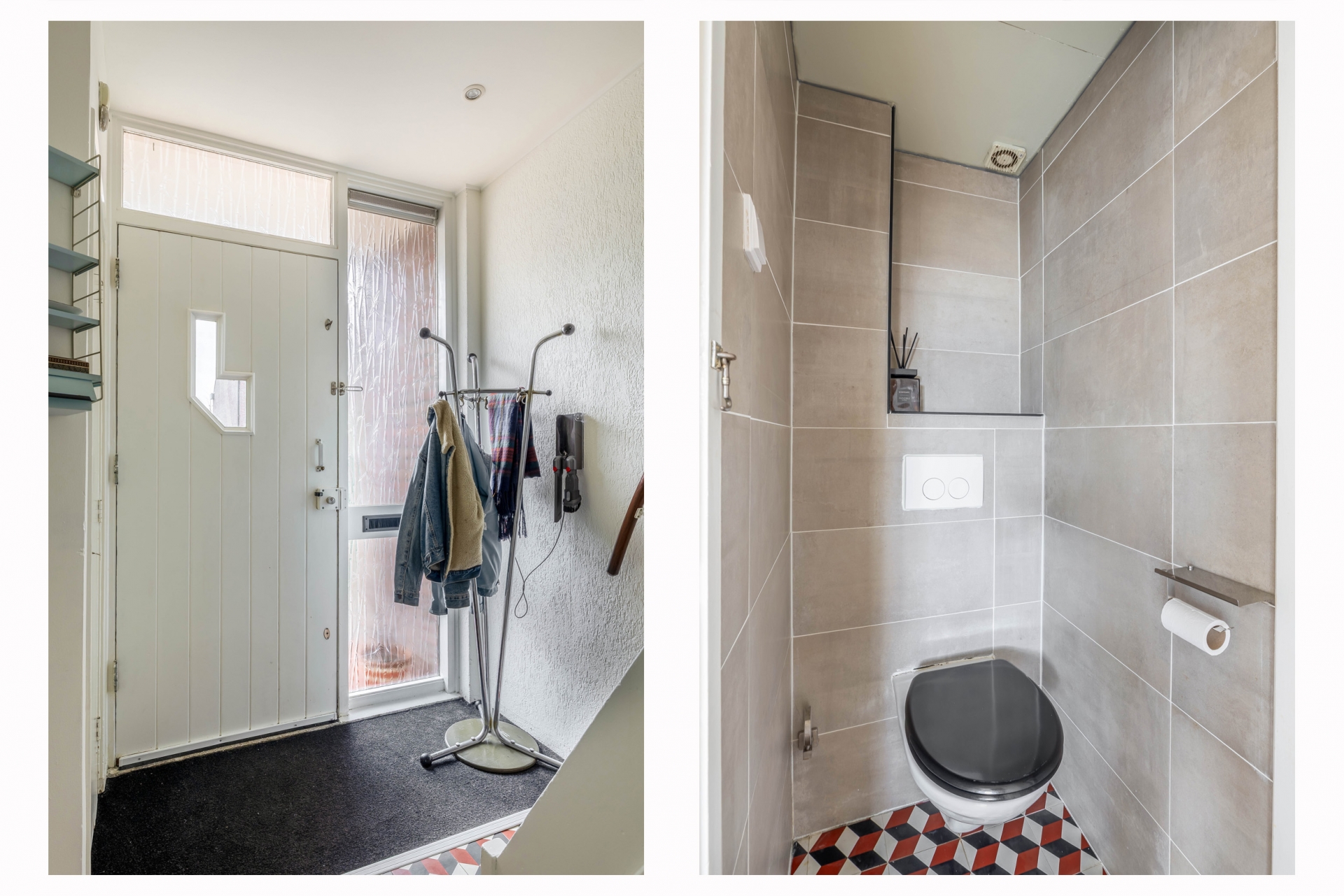 Entree/hal met vernieuwde meterkast, toilet, trapopgang naar de eerste verdieping en een trapkast.