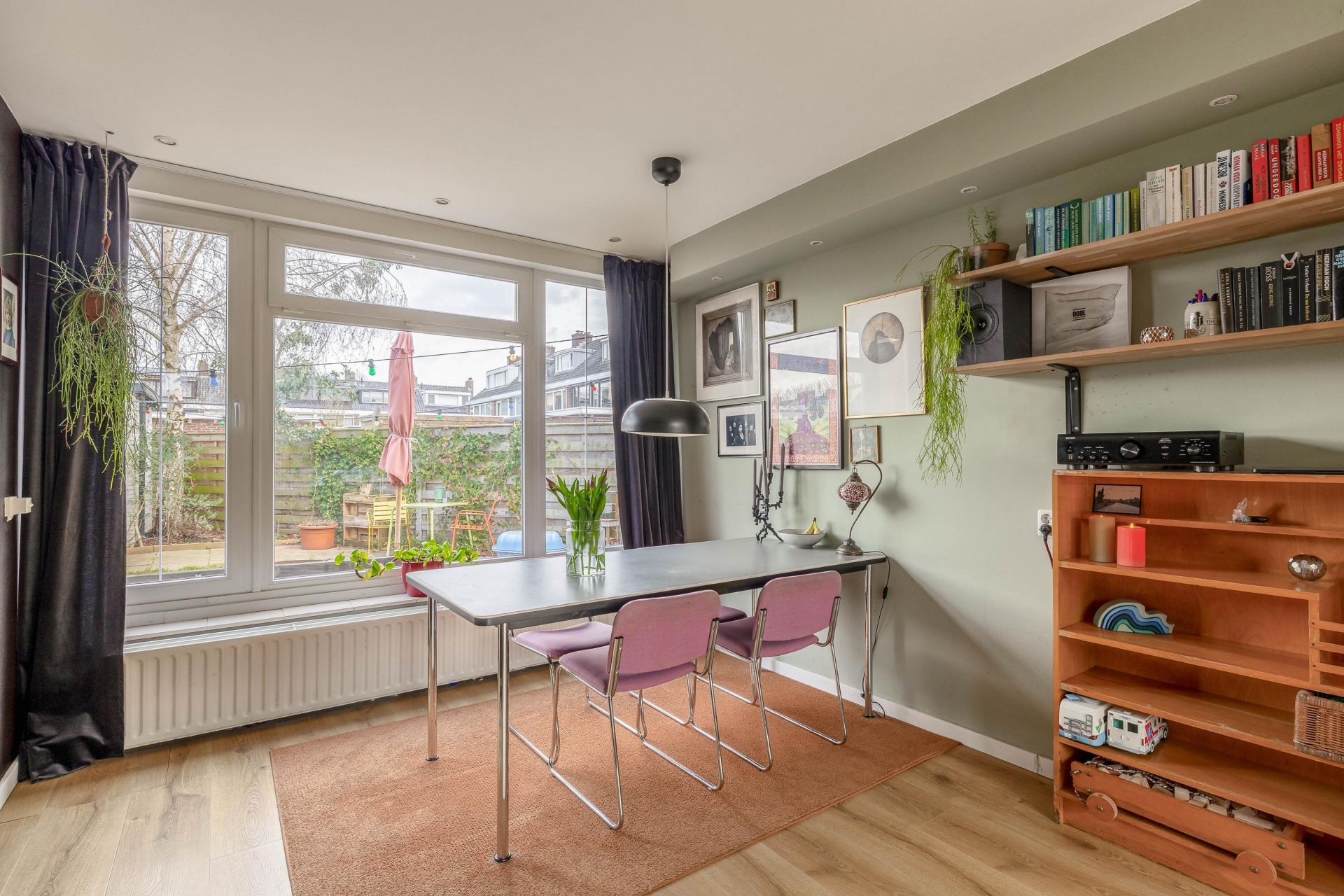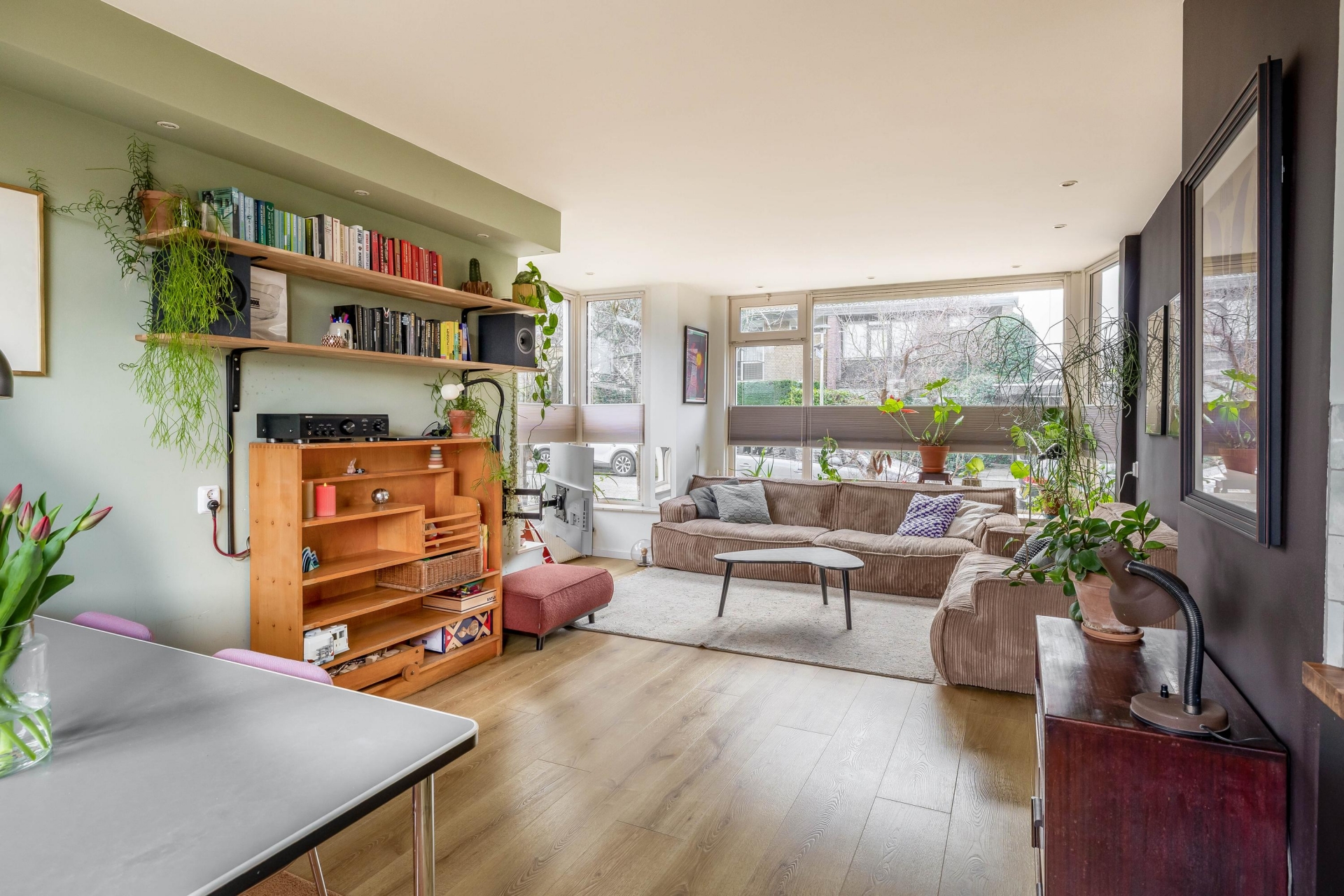 De woonkamer heeft een zeer goede lichtinval, mede dankzij de erker aan de zijkant, en biedt een mooi zicht over de tuin en op de straat.