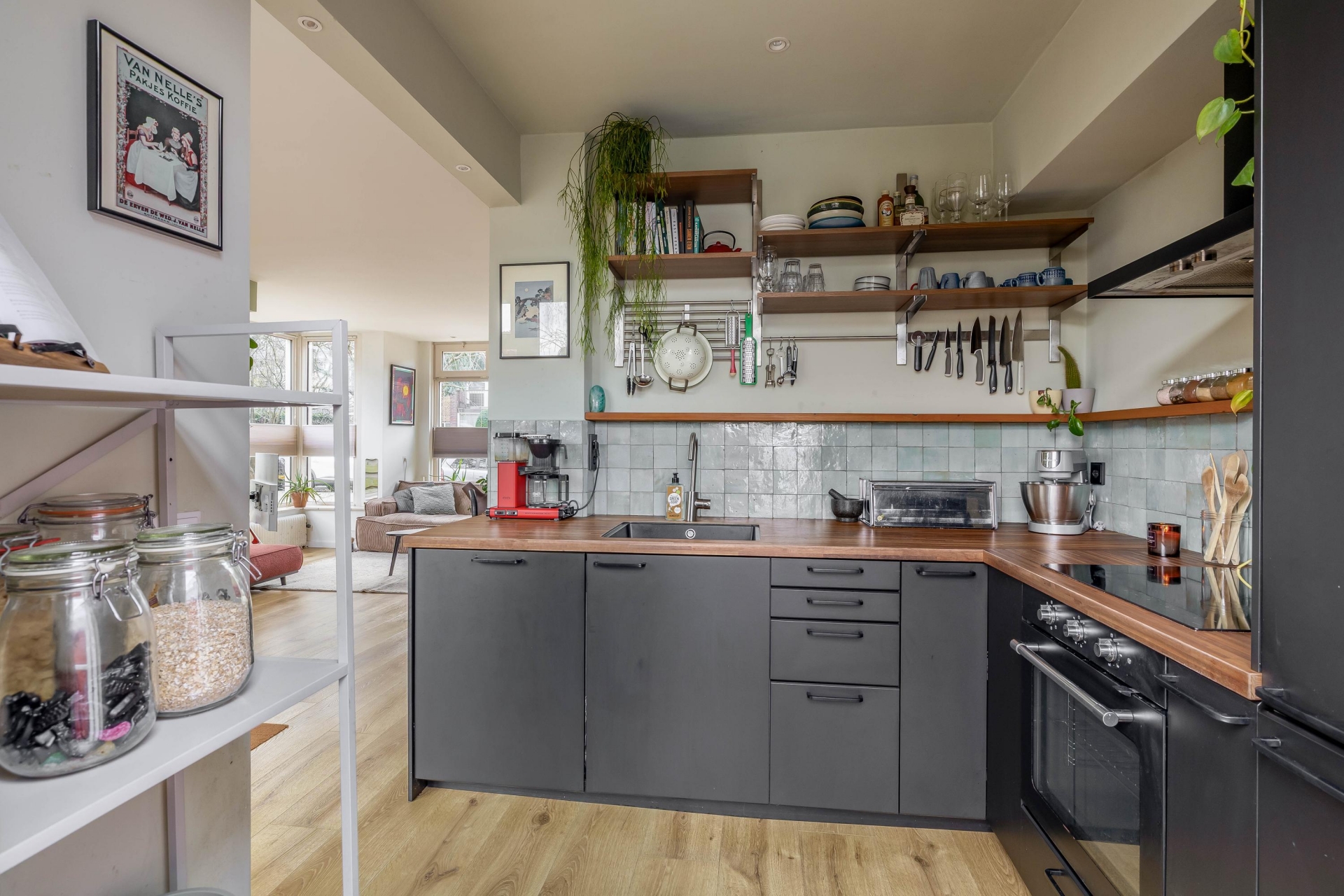 De keuken bevindt zich aan de achterzijde van de woning en is in een L-opstelling geplaatst. De keuken is onder meer voorzien van een 4 pits inductiekookplaat, afzuigkap, spoelbak en een koel-vriescombinatie. Vanuit de keuken is er tevens toegang tot de achtertuin.