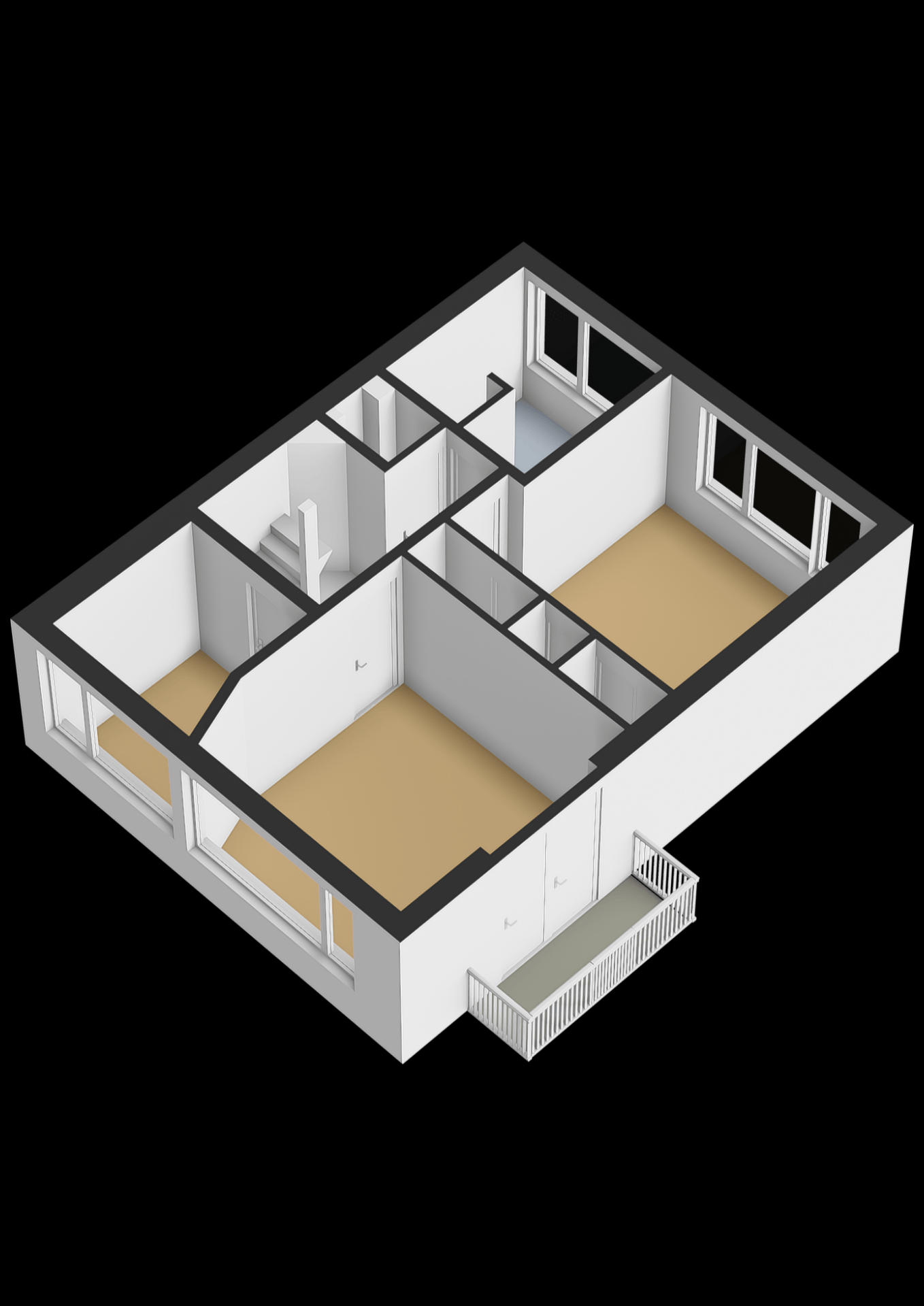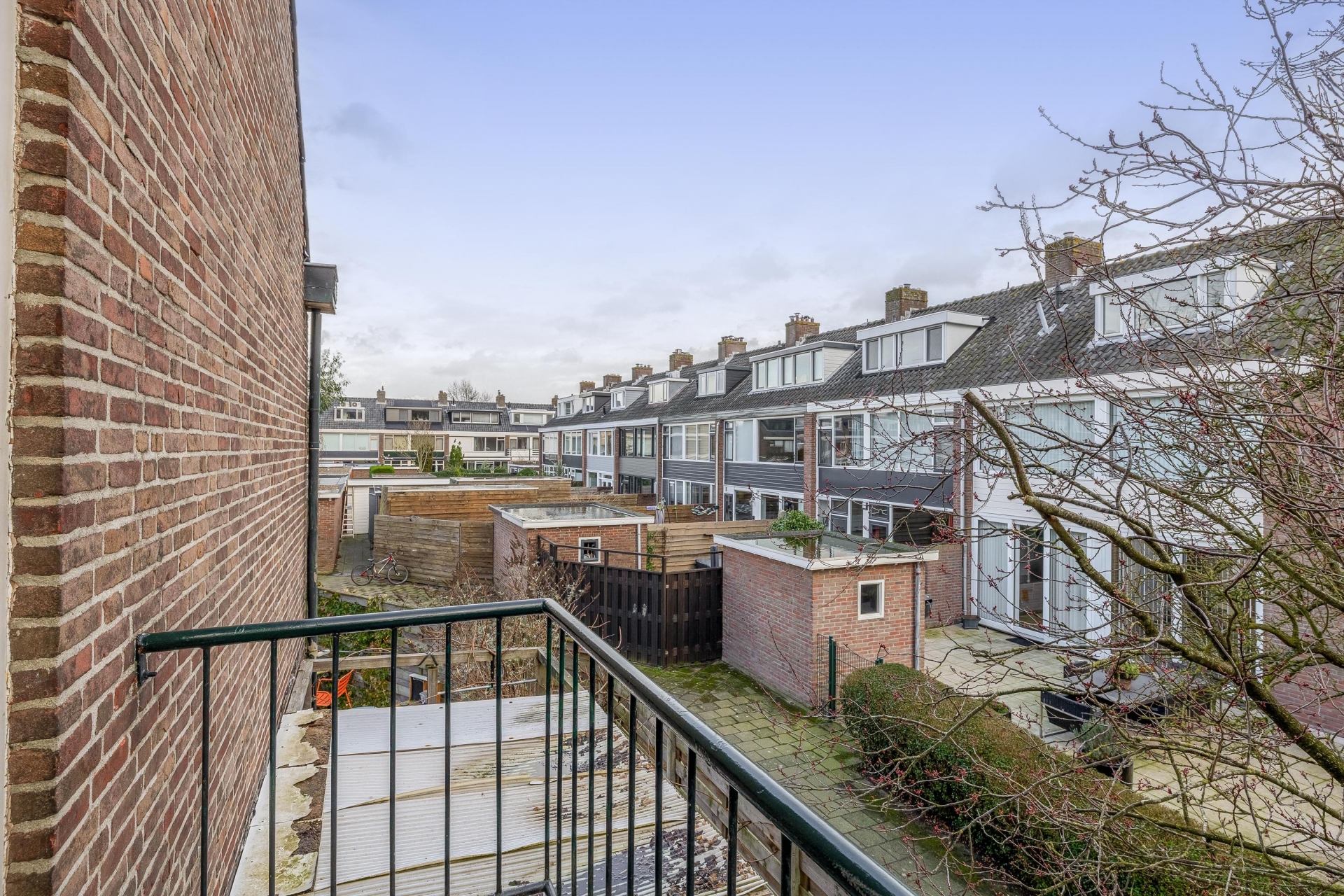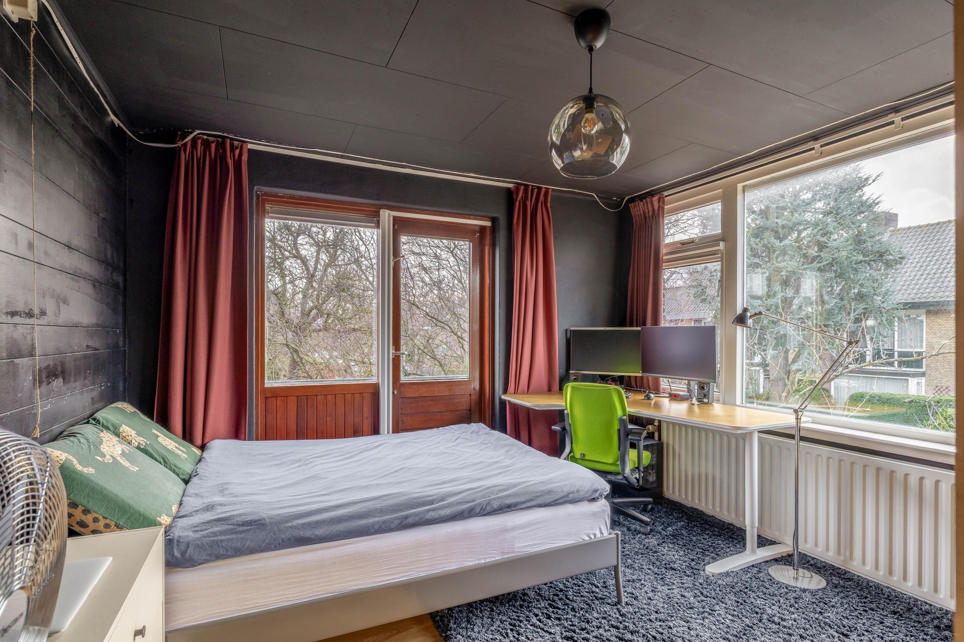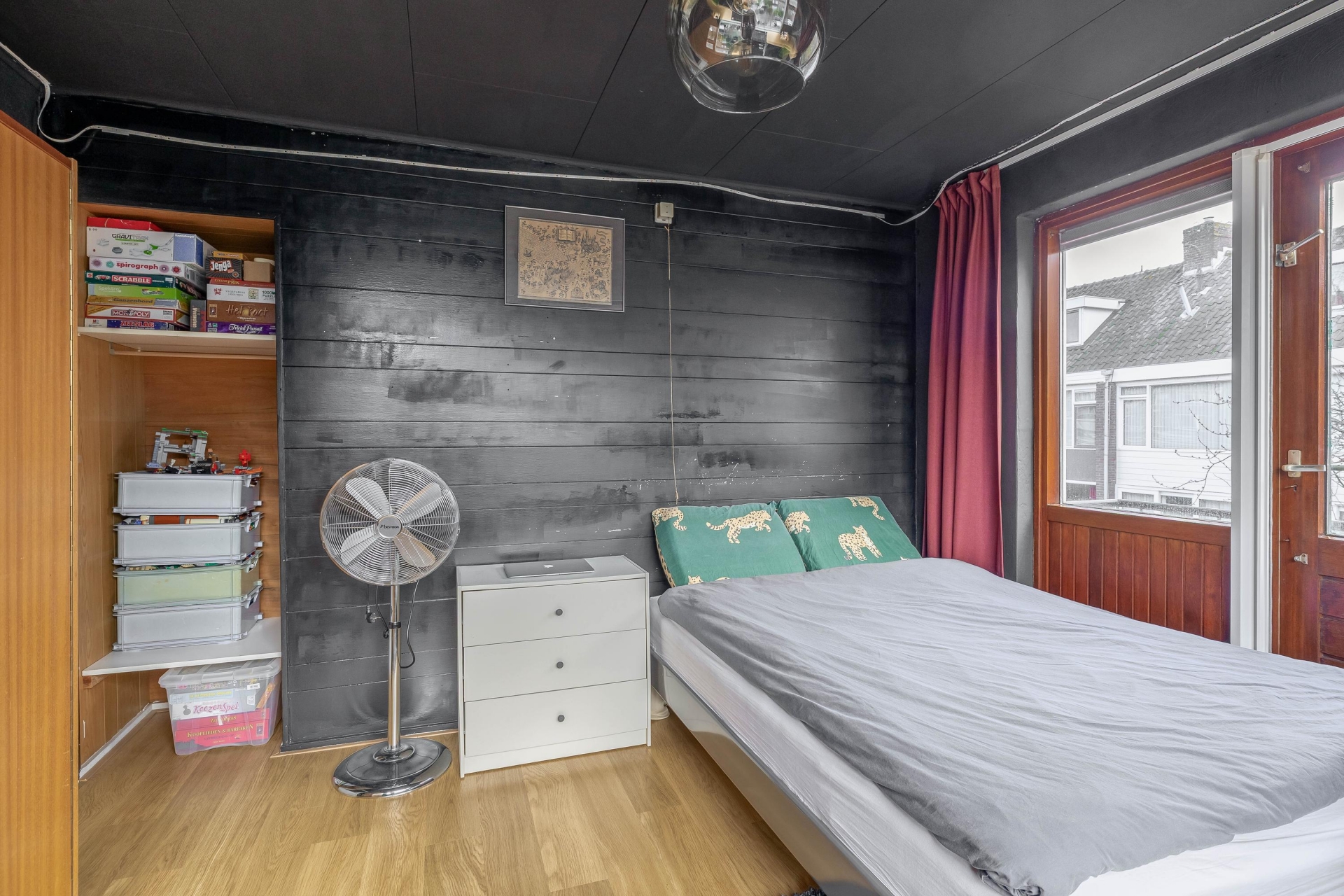 Aan de voorzijde van de woning bevindt zich de grote slaapkamer met een balkon aan de zijkant. De voormalige badkamer aan de voorzijde is thans in gebruik als kantoorruimte.