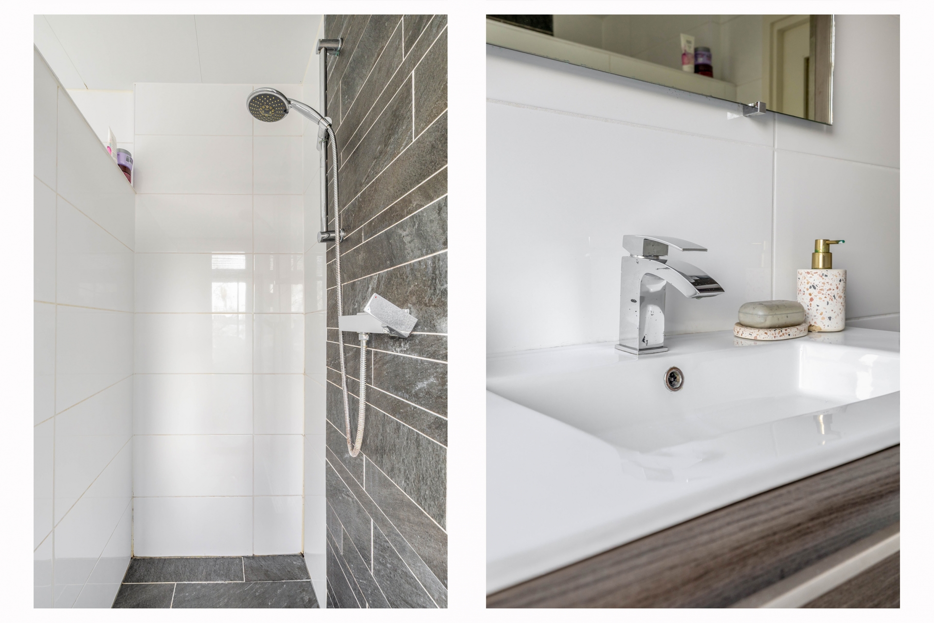 Aan de achterzijde van de woning bevinden zich nog een ruime slaapkamer voorzien van vaste kasten alsmede de badkamer welke is voorzien van een inloopdouche met drain en wastafelmeubel. Separaat is er nog een toilet aanwezig.