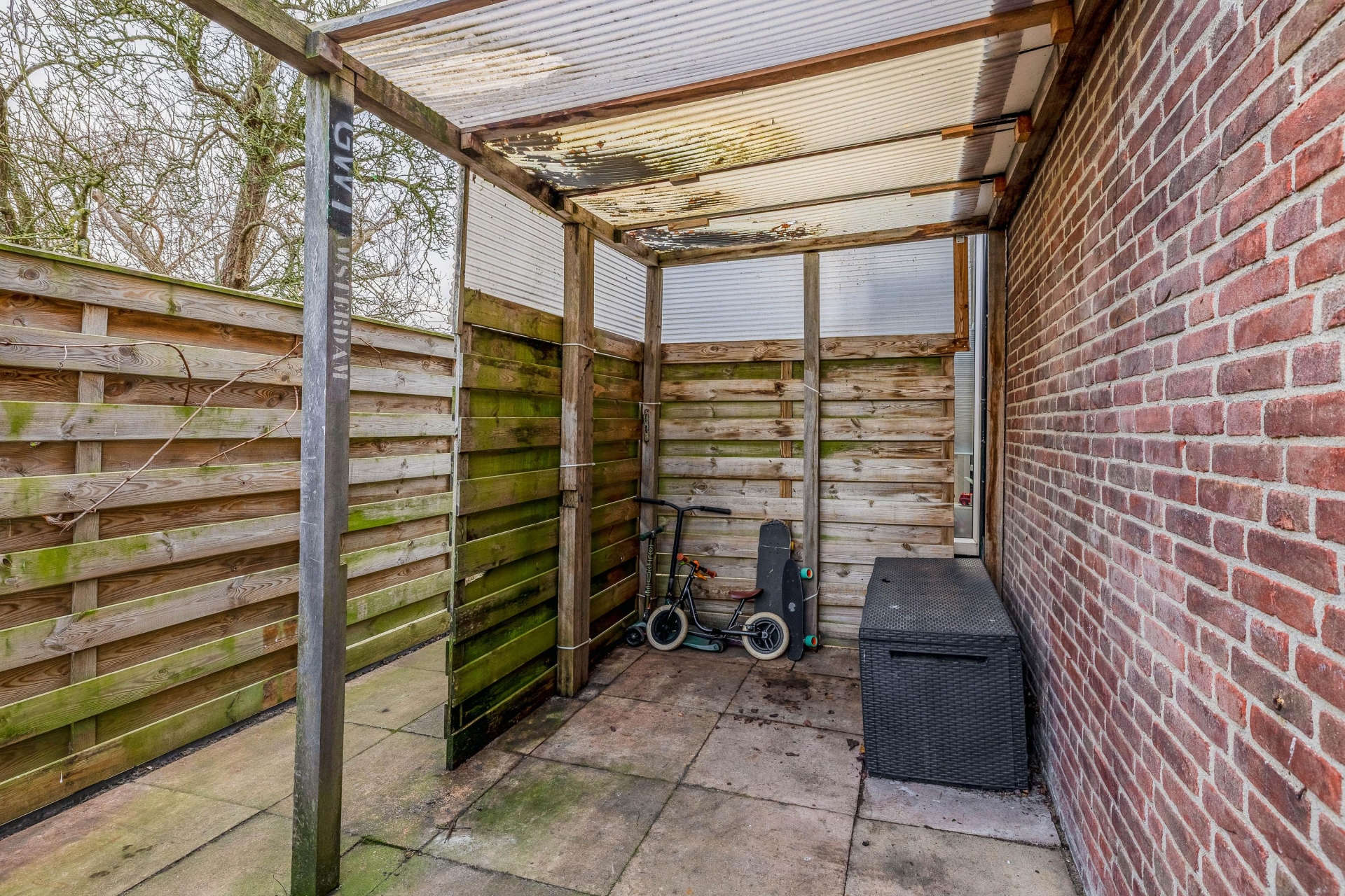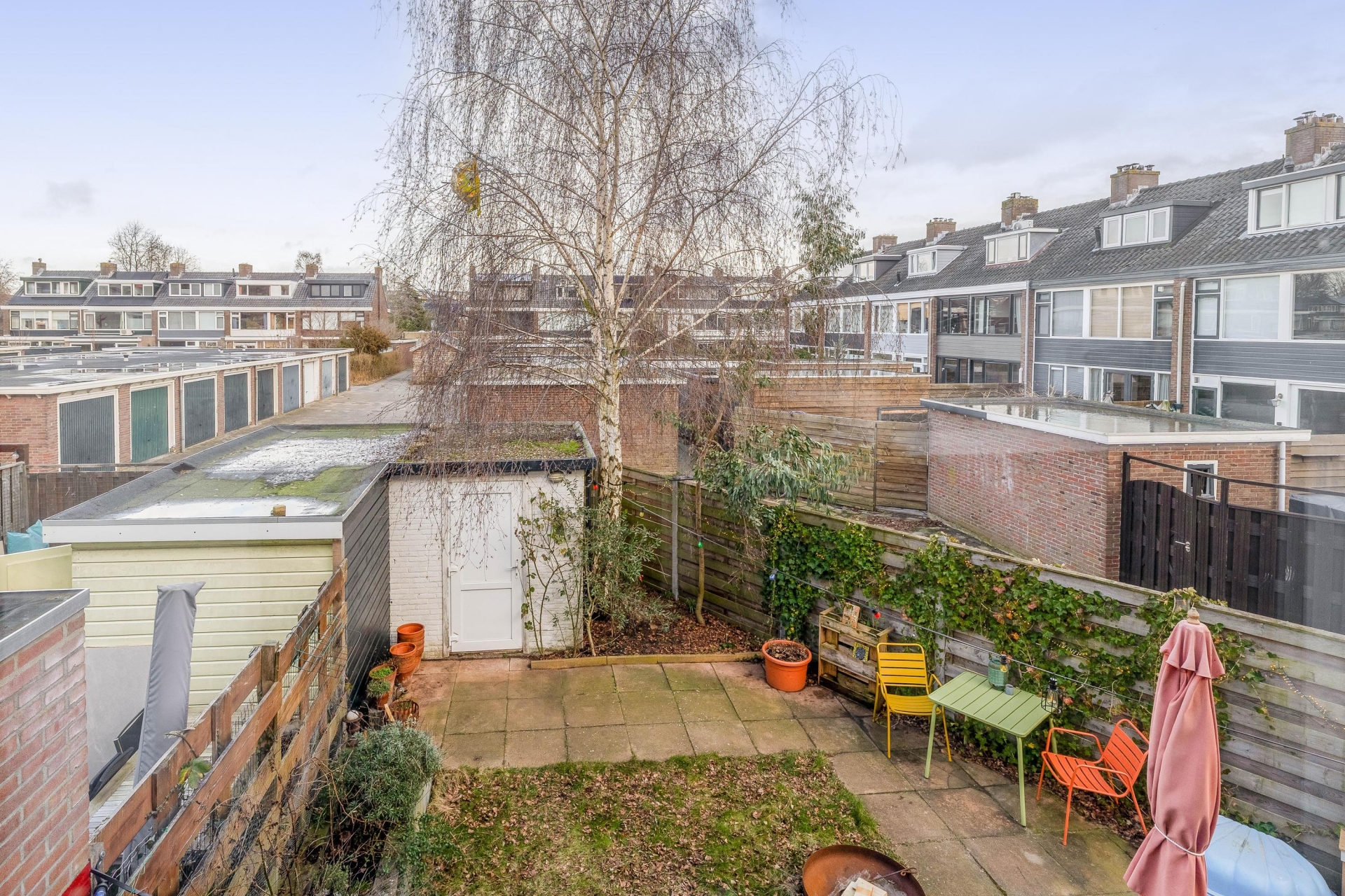 De achtertuin loopt in een punt weg maar is gemiddeld nog steeds 8 meter diep en maar liefst 9 meter breed. De houten schutting van wel 20 meter lang met betonpalen en een zijuitgang bieden u dan ook heel veel privacy.