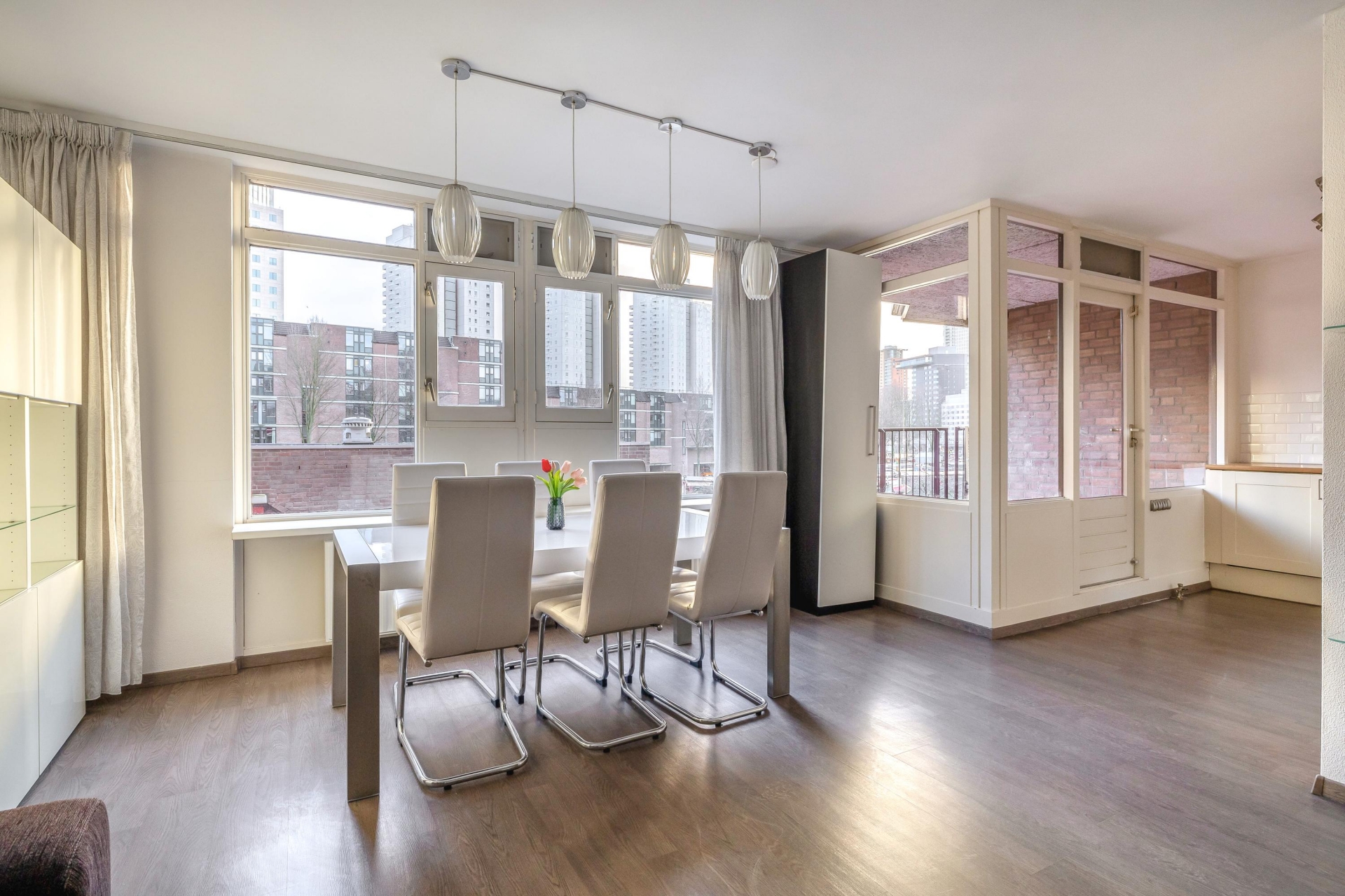 Wonen in hartje Rotterdam, maar dan wél met rust, uitzicht en comfort. Dit goed onderhouden 3-kamerappartement op de tweede verdieping biedt het allemaal. Vanuit de woonkamer, keuken en beide slaapkamers kijk je direct uit op de Leuvehaven, een levendig maar autovrij stukje stad. De royale woonkamer is speels ingedeeld en voorzien van een moderne laminaatvloer. Dankzij de grote raampartijen valt het daglicht mooi naar binnen en vormt het balkon op het zuiden een verlengstuk van je leefruimte. Hier geniet je tot in de avond van de zon en het uitzicht op het water.