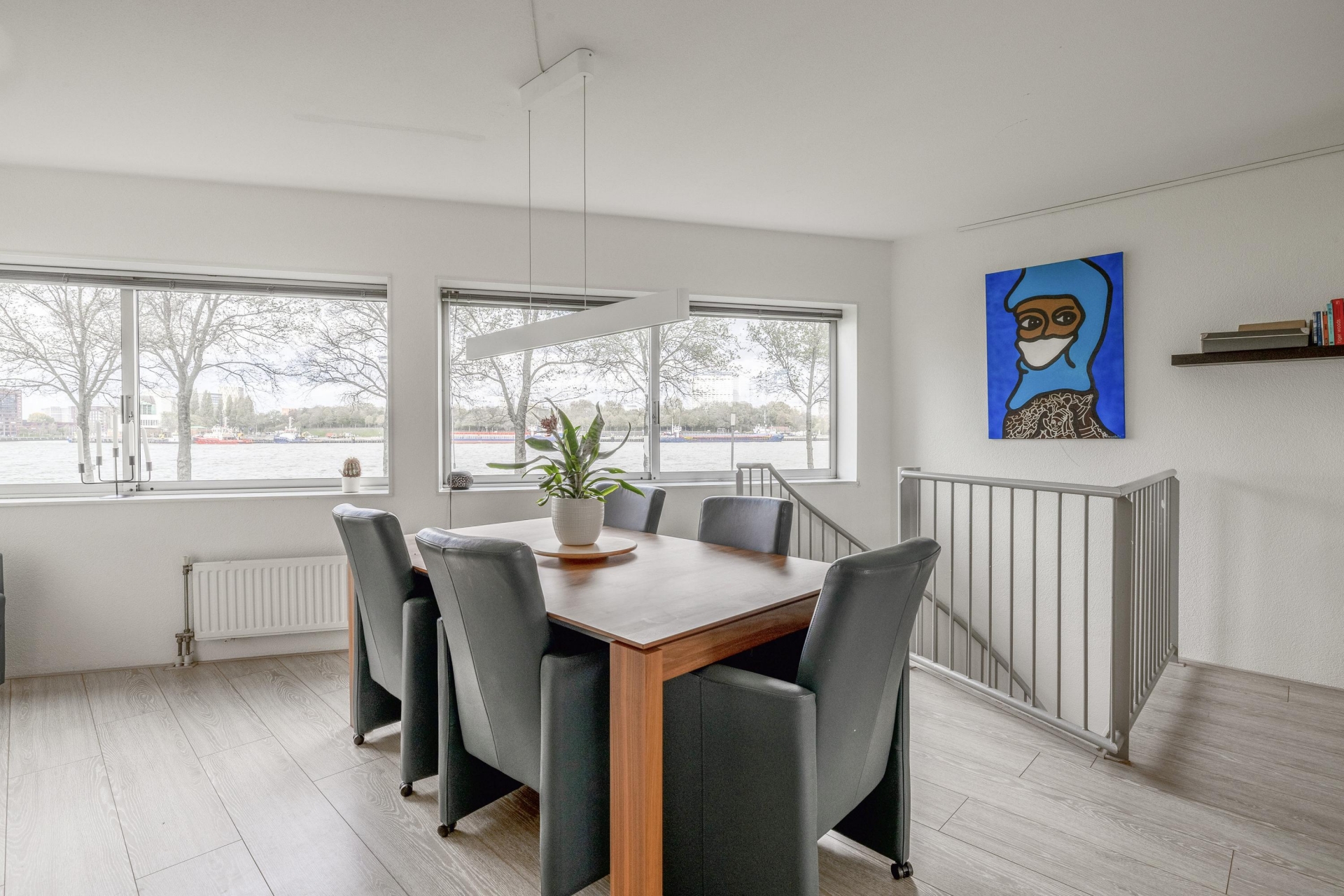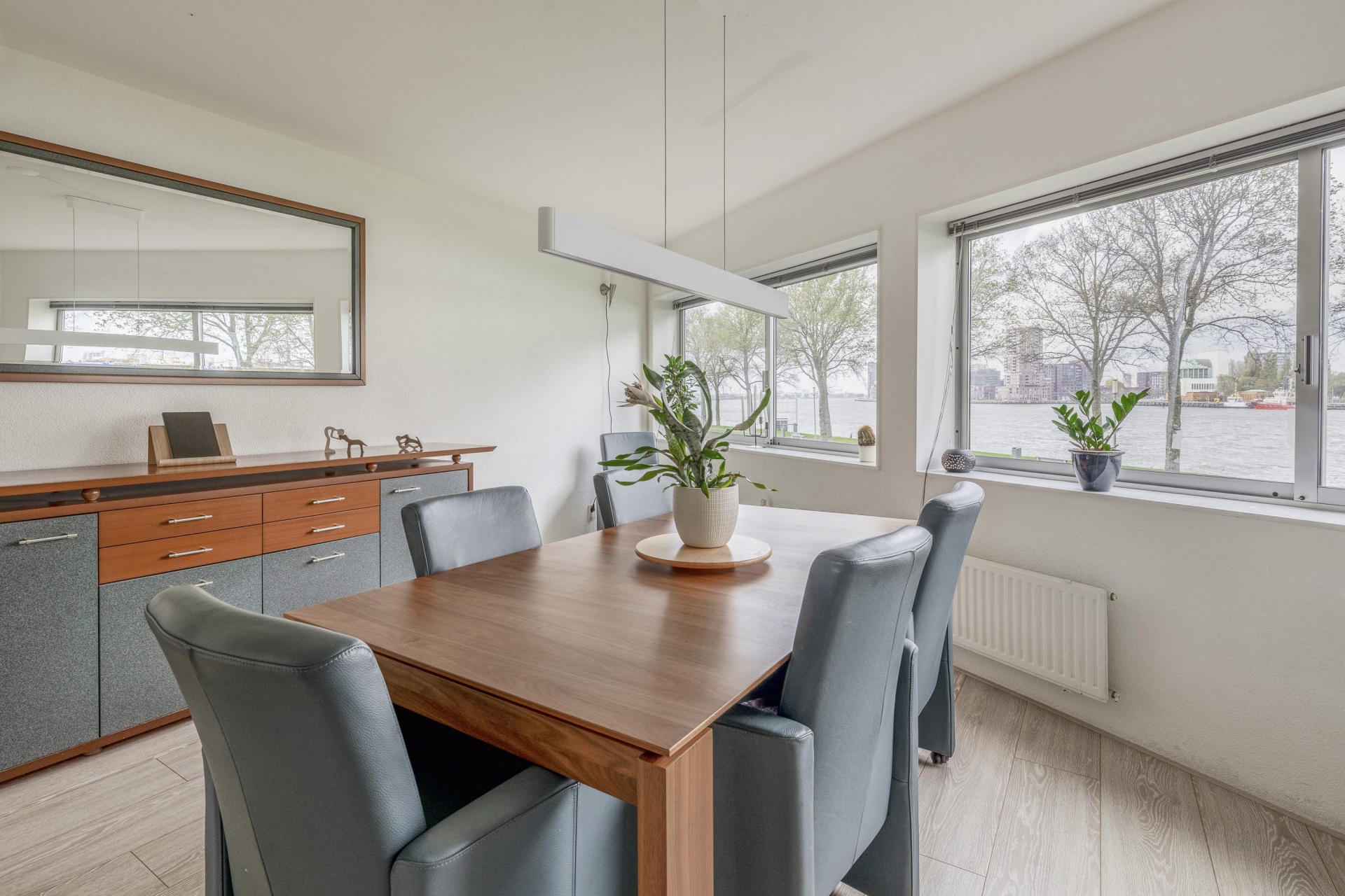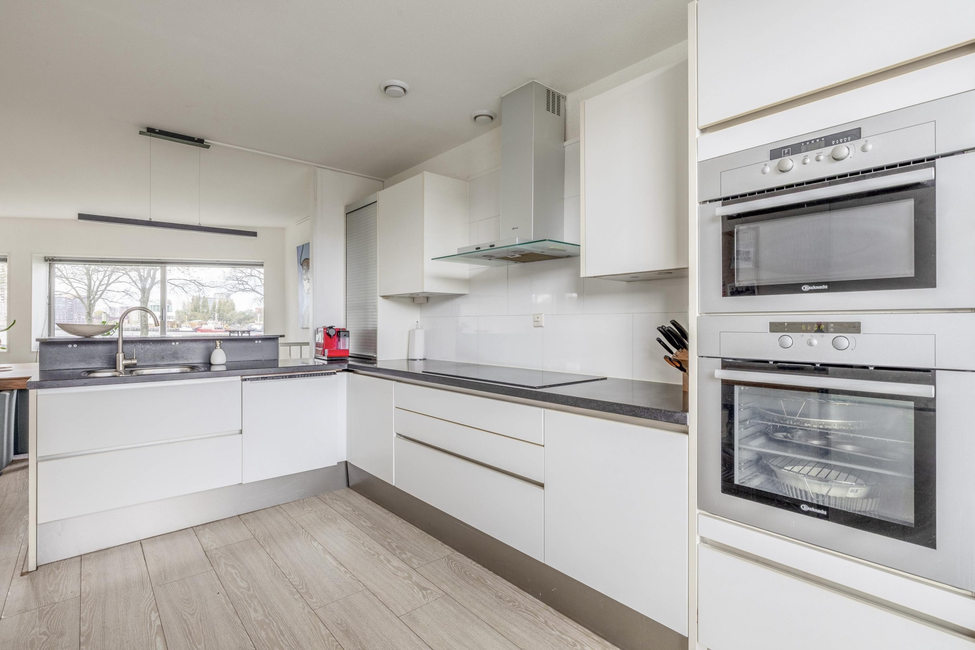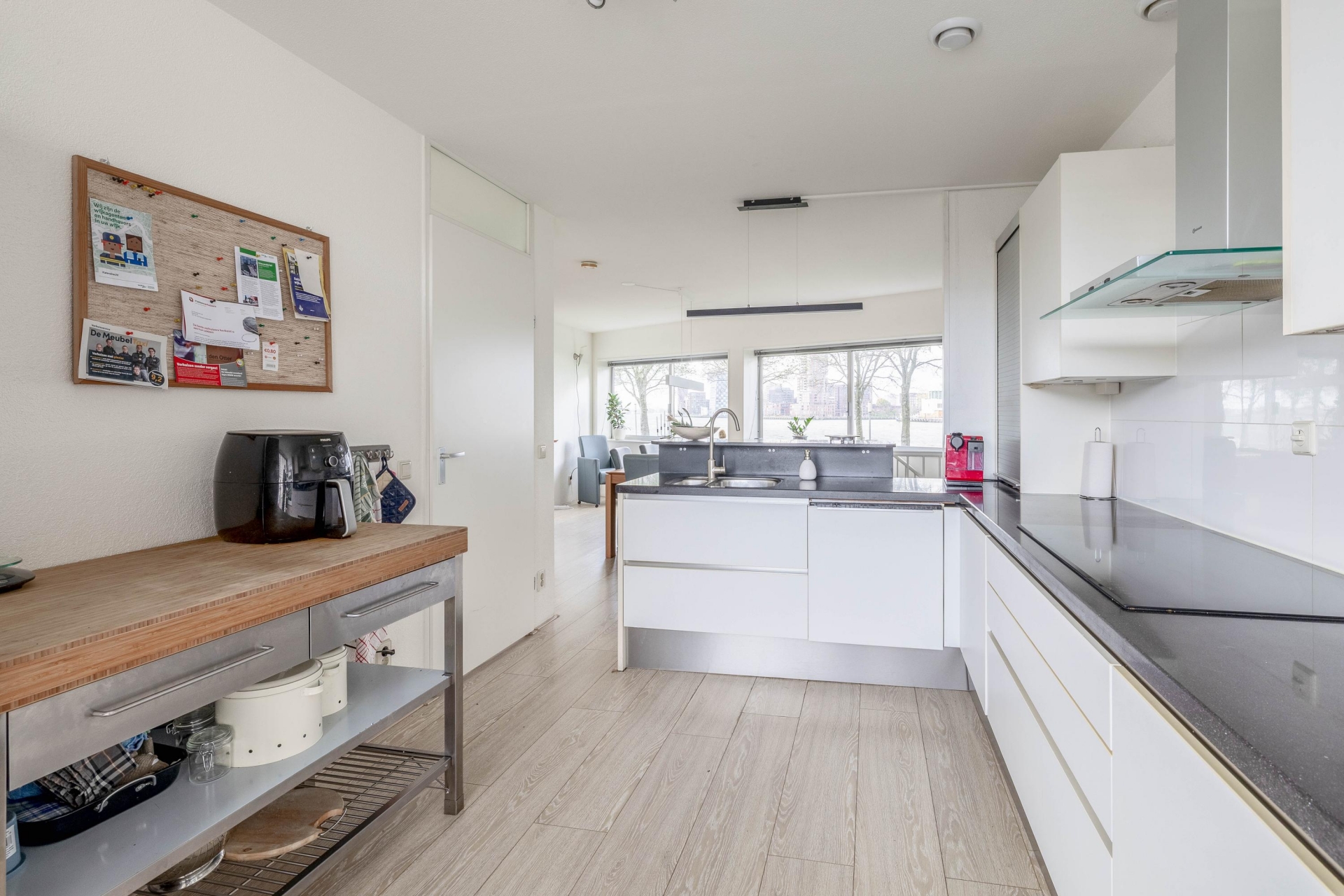 Aan de achterzijde ligt de sfeervolle eetkamer met volop ruimte voor een grote tafel. Hier kijk je tijdens het koken én dineren uit over de Maas en de voorbij varende schepen. De hoekkeuken is modern, compleet uitgerust en precies waar je wil staan als je graag kookt en gasten ontvangt: veel werkruimte, een fijne indeling en alles binnen handbereik.