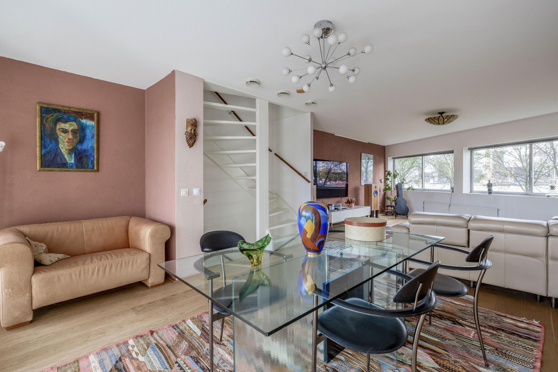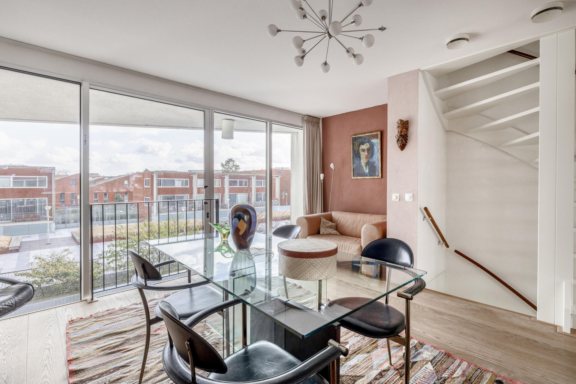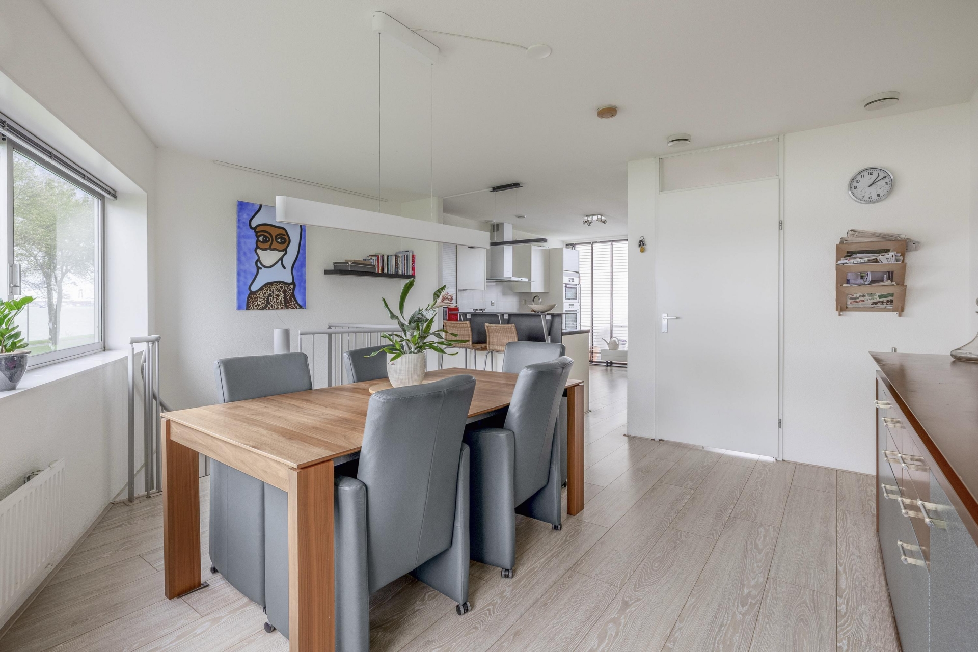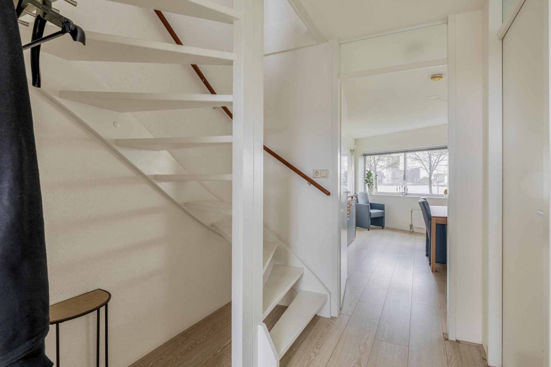 Aan de achterzijde ligt de sfeervolle eetkamer met volop ruimte voor een grote tafel. Hier kijk je tijdens het koken én dineren uit over de Maas en de voorbij varende schepen. De hoekkeuken is modern, compleet uitgerust en precies waar je wil staan als je graag kookt en gasten ontvangt: veel werkruimte, een fijne indeling en alles binnen handbereik.