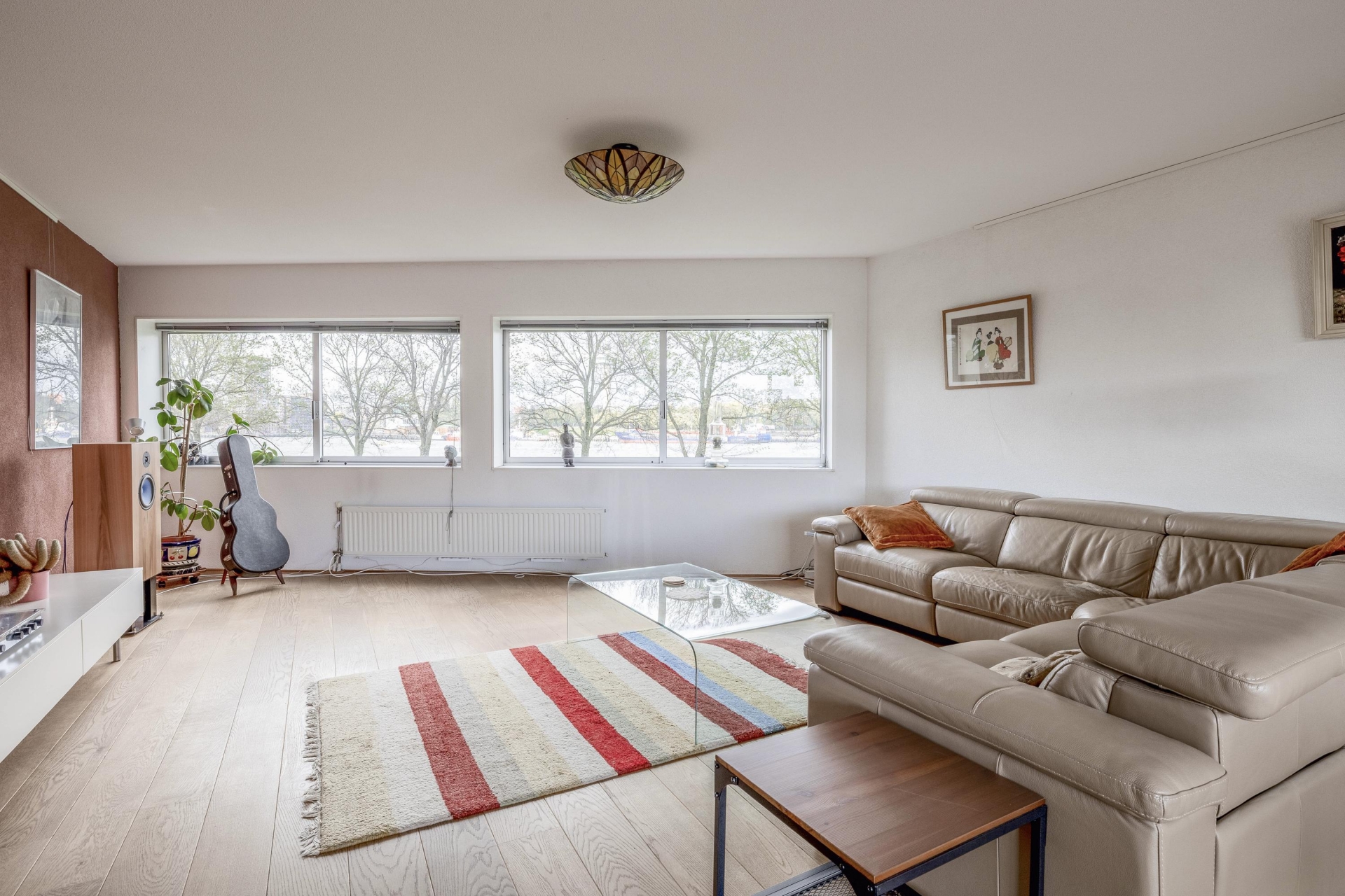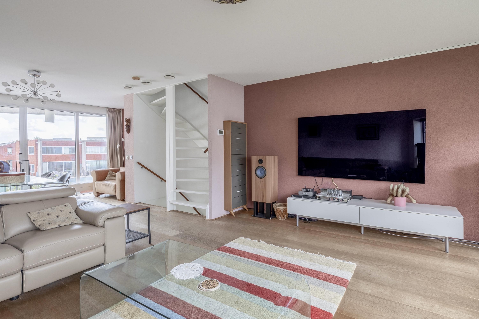 Een verdieping hoger vind je de woonkamer. Licht, ruim en door de grote raampartijen prachtig verbonden met buiten. Hier is plek voor een grote zithoek, een werkplek, kunst aan de wand, de ruimte werkt mee en voelt uitnodigend. Dit is een living die leeft.