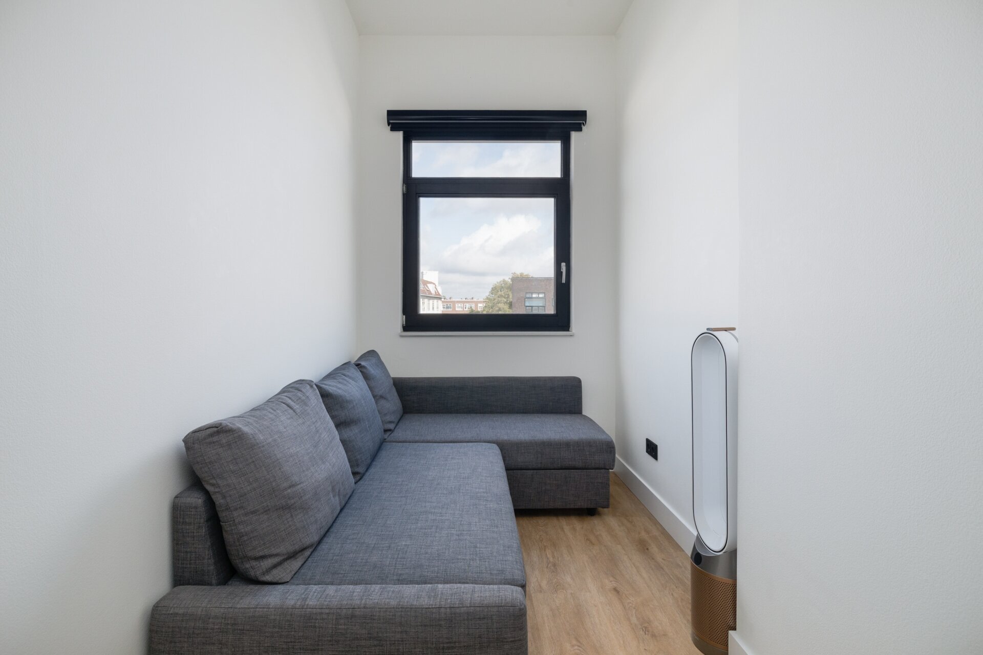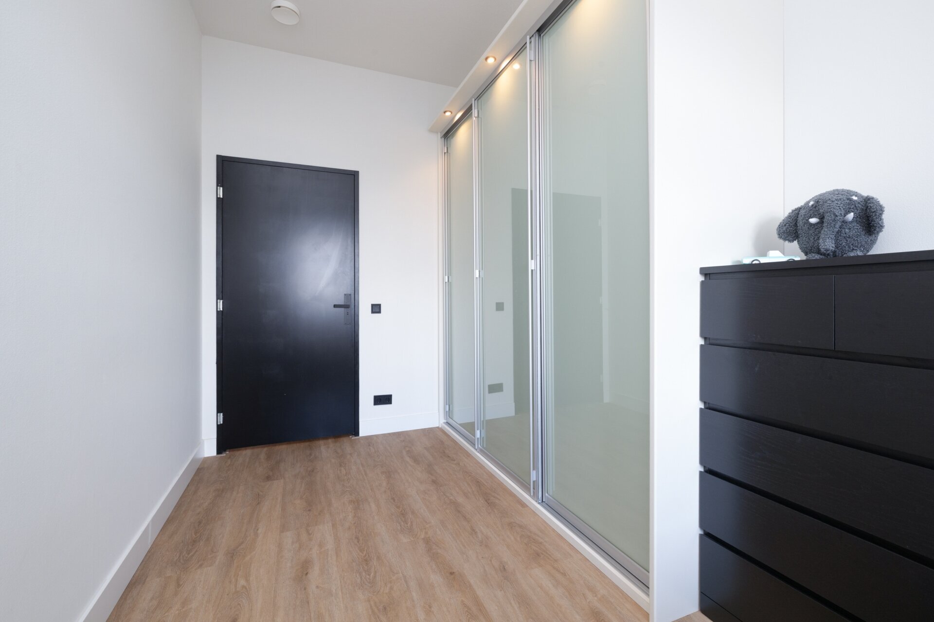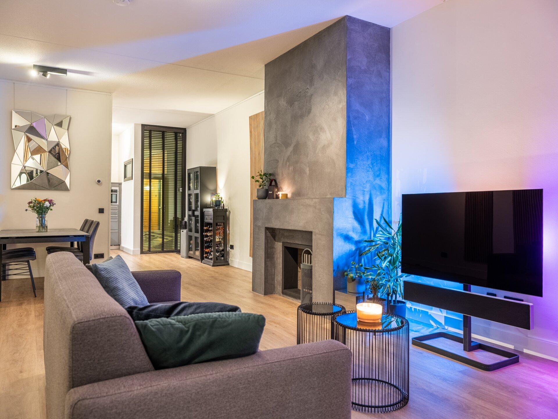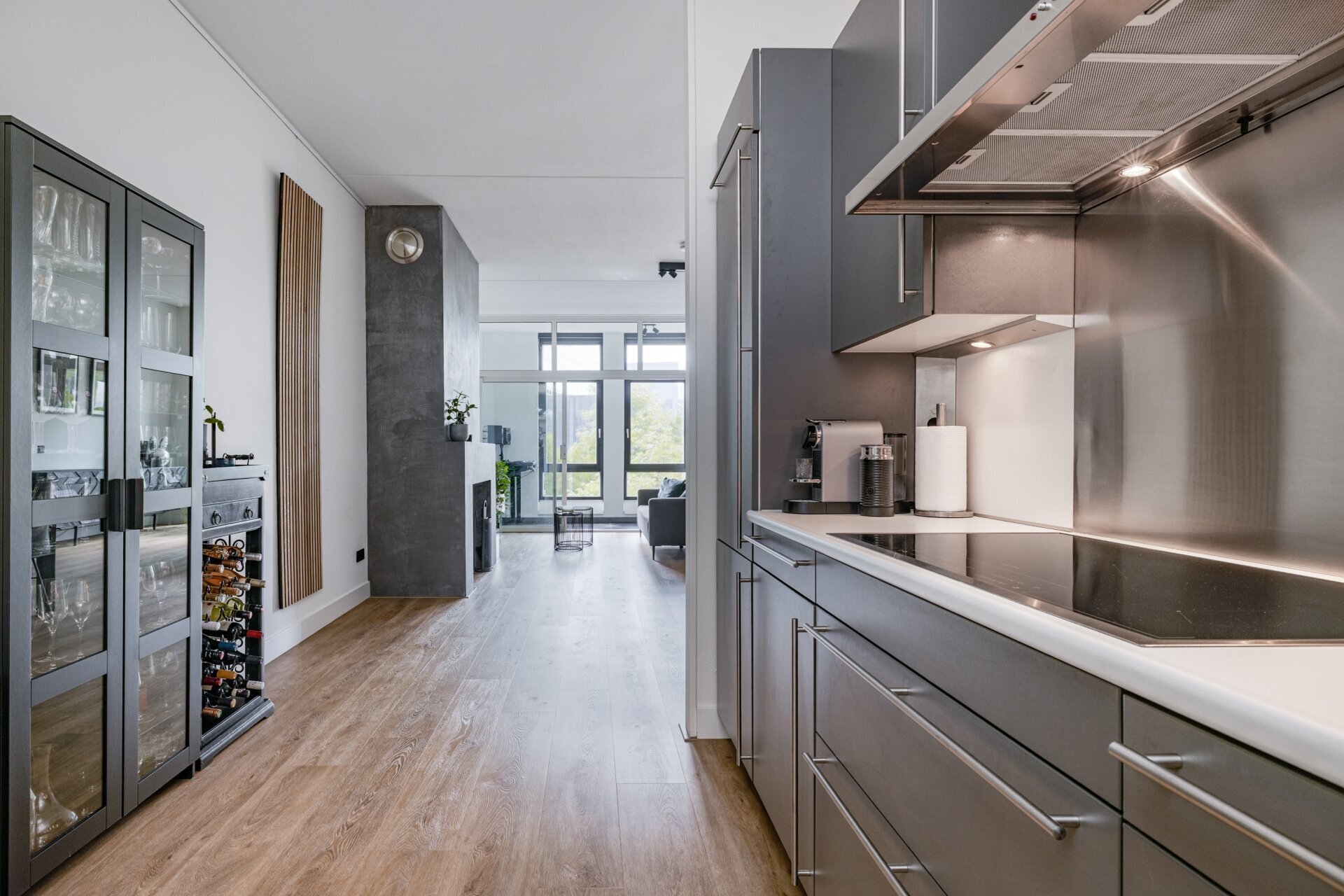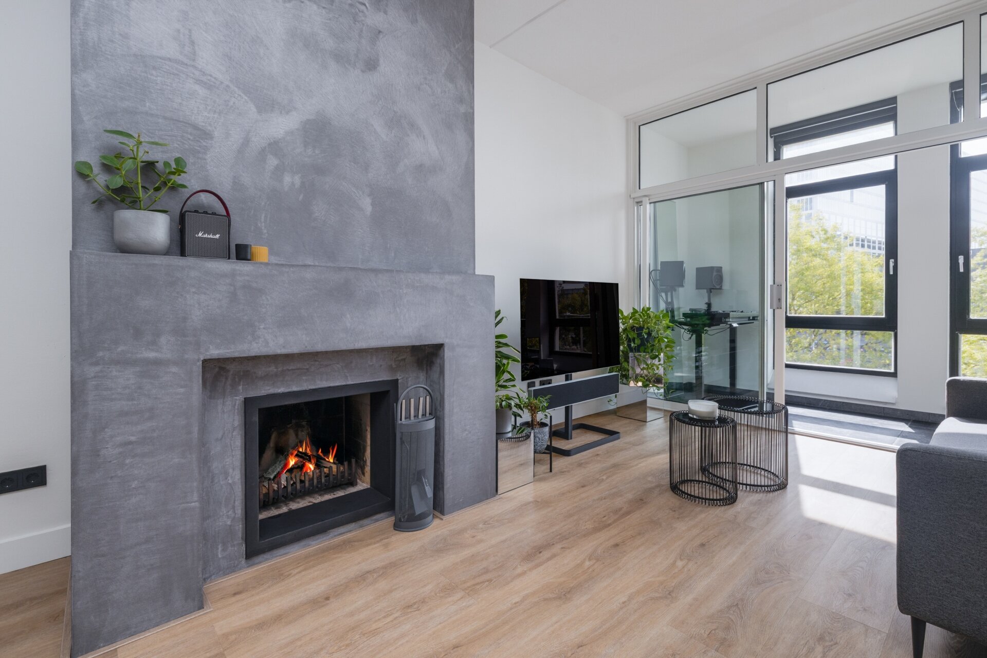 Zodra je de woonkamer betreedt, word je overvallen door een gevoel van ruimte en rust. De 3 meter hoge plafonds geven niet alleen letterlijk lucht, maar zorgen ook voor een indrukwekkend gevoel van grandeur. Het daglicht stroomt royaal binnen via de grote raampartijen, waardoor elke hoek van de kamer baadt in een zachte, natuurlijke gloed. De moderne afwerking met bijvoorbeeld een PVC vloer (gelegd in 2021 met vloerverwarming) maakt dit een interieur waar je niet snel op uitgekeken raakt. En wanneer de dagen korter worden? Dan zorgt de open haard, houtgestookt en sfeervol, voor knusse avonden met een goed glas wijn en het knisperen van vuur op de achtergrond. Het comfort wordt gecompleteerd door vloerverwarming in het hele appartement (behoudens de badkamer): aangenaam warm zonder radiatoren die het zicht verstoren.