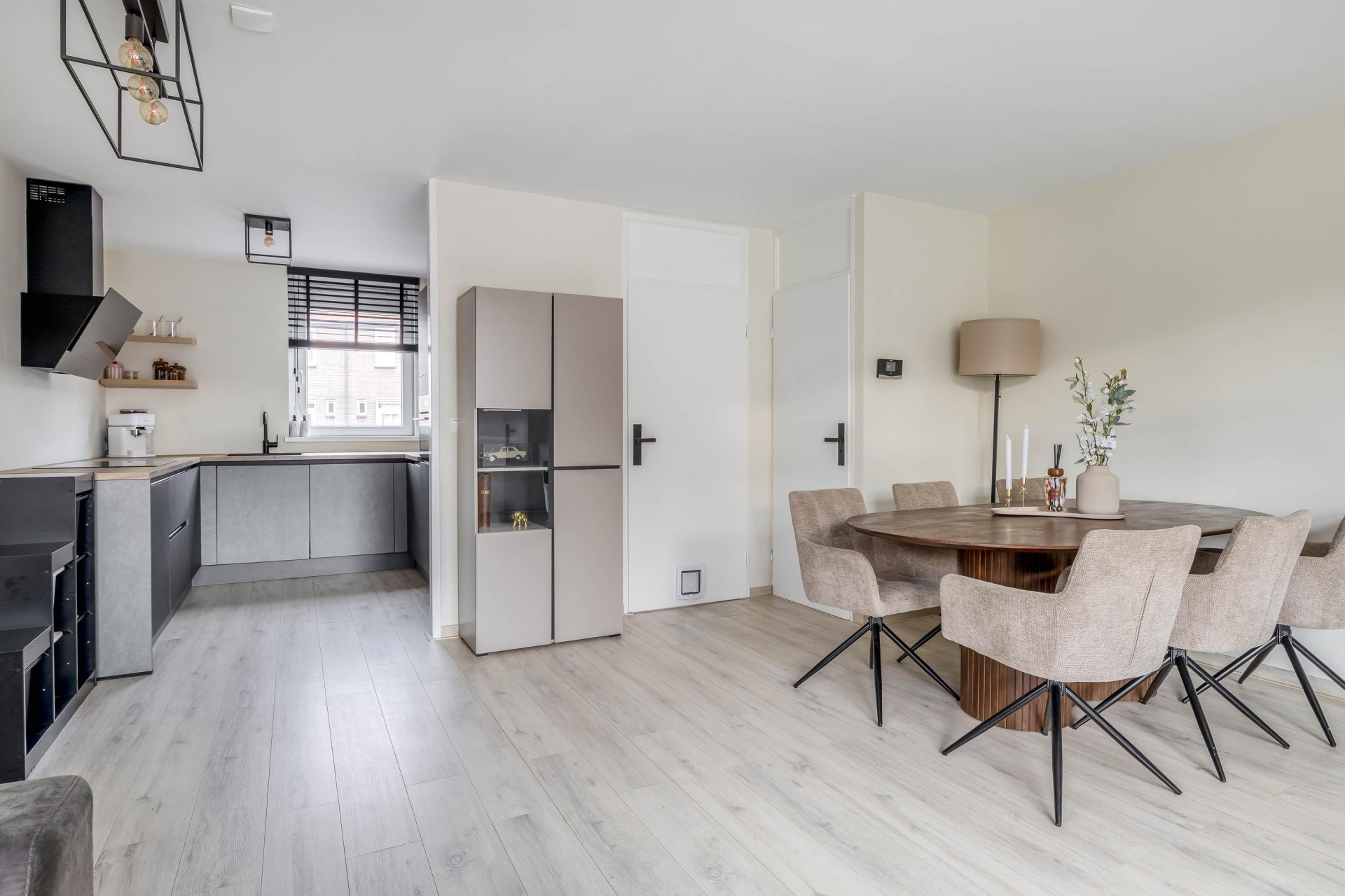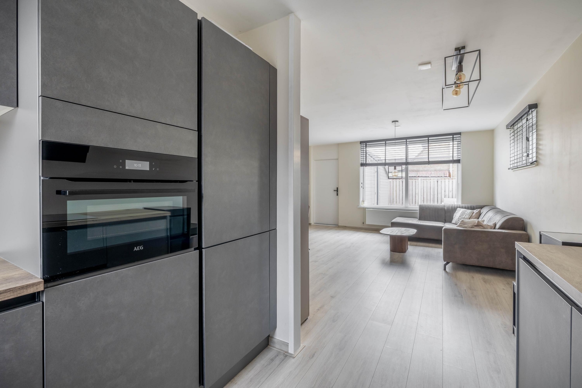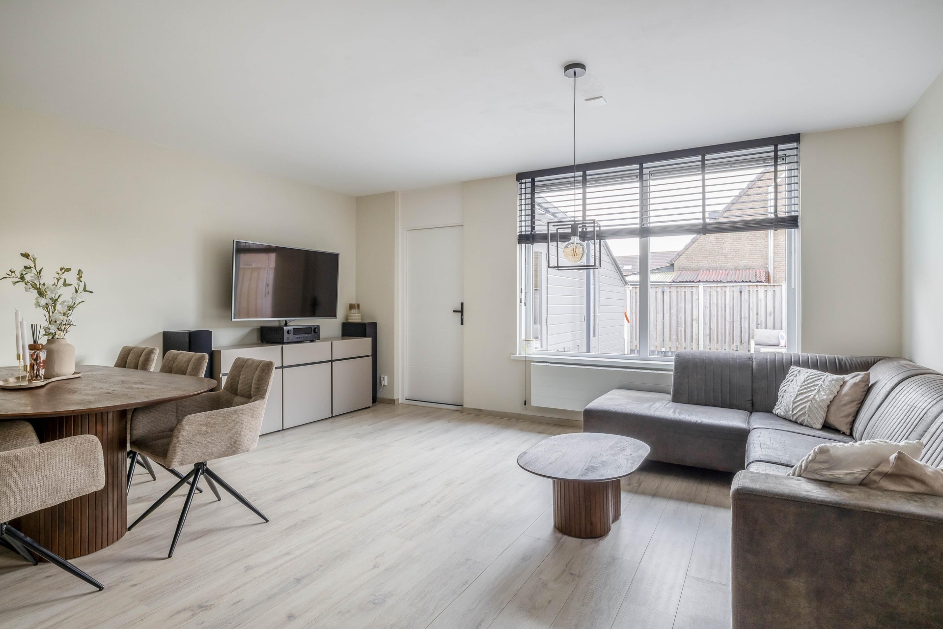 De woonkamer heeft een praktische indeling met ruimte voor een comfortabele zithoek en een ruime eettafel. De moderne vloer en lichte afwerking maken het geheel rustig en eigentijds. Vanuit de woonkamer heb je direct zicht op de achtertuin, waardoor binnen en buiten mooi met elkaar verbonden zijn.