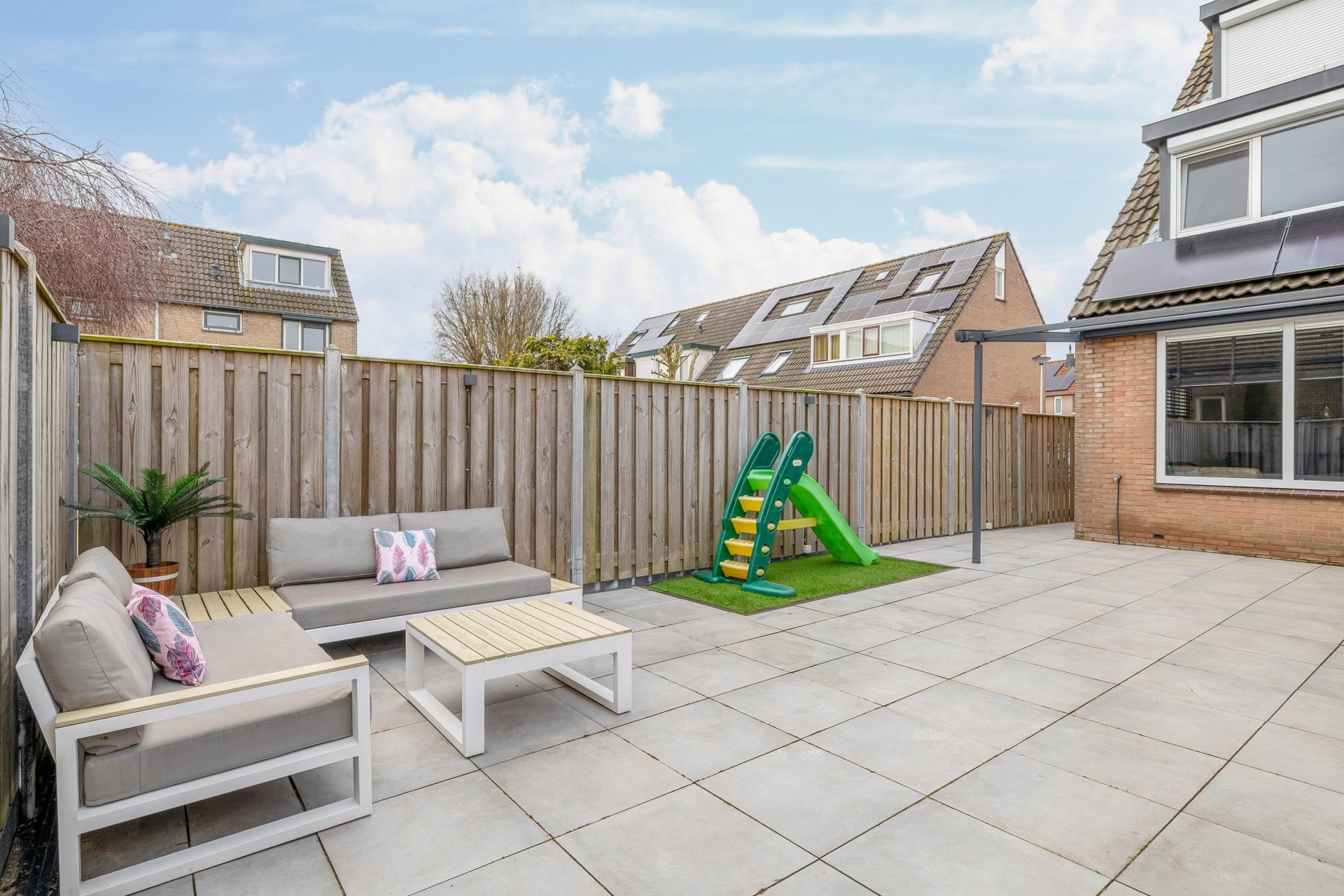 De tuin is ruim genoeg voor een gezellige loungehoek, een eettafel en speelruimte voor kinderen. Er is een praktische aangebouwde berging voor fietsen en tuinspullen.