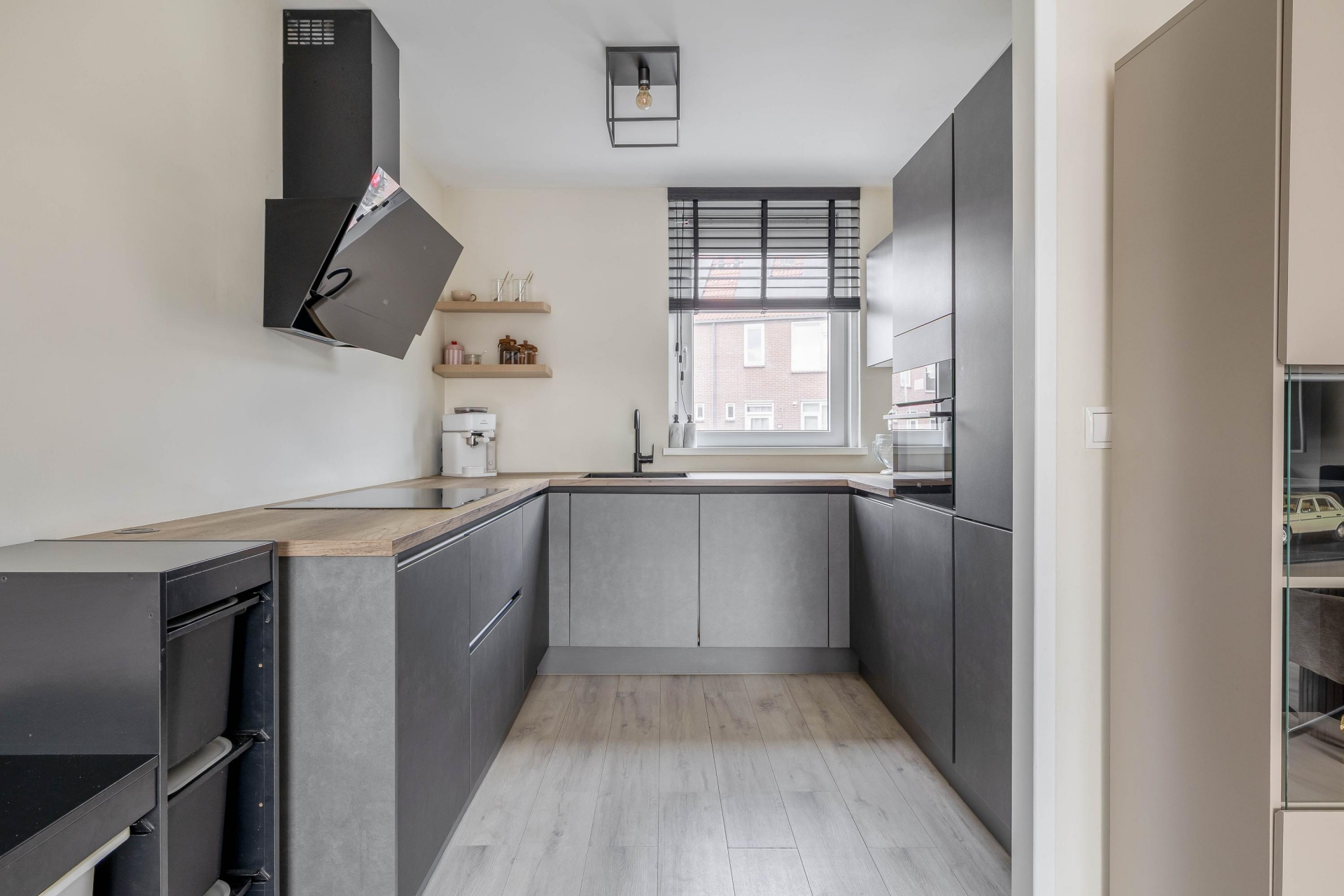 Aan de voorzijde van het huis bevindt zich de keuken. Deze is in 2023 vernieuwd en uitgevoerd in een moderne stijl met donkere fronten en een houtlook werkblad. De keuken beschikt over diverse inbouwapparatuur en voldoende werk- en bergruimte. Hier kook je met gemak terwijl je in contact blijft met de rest van de leefruimte.