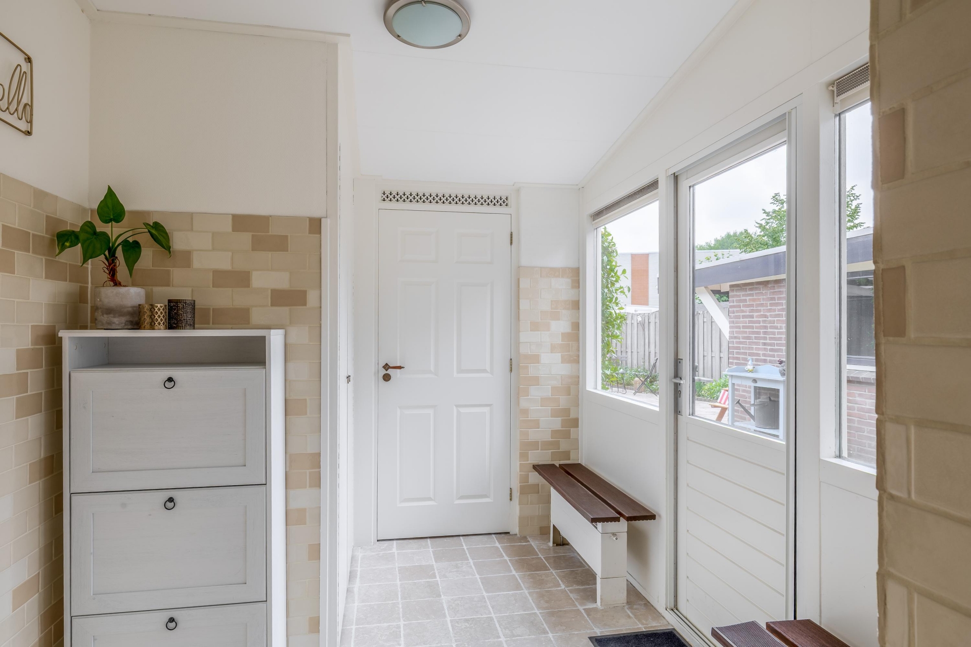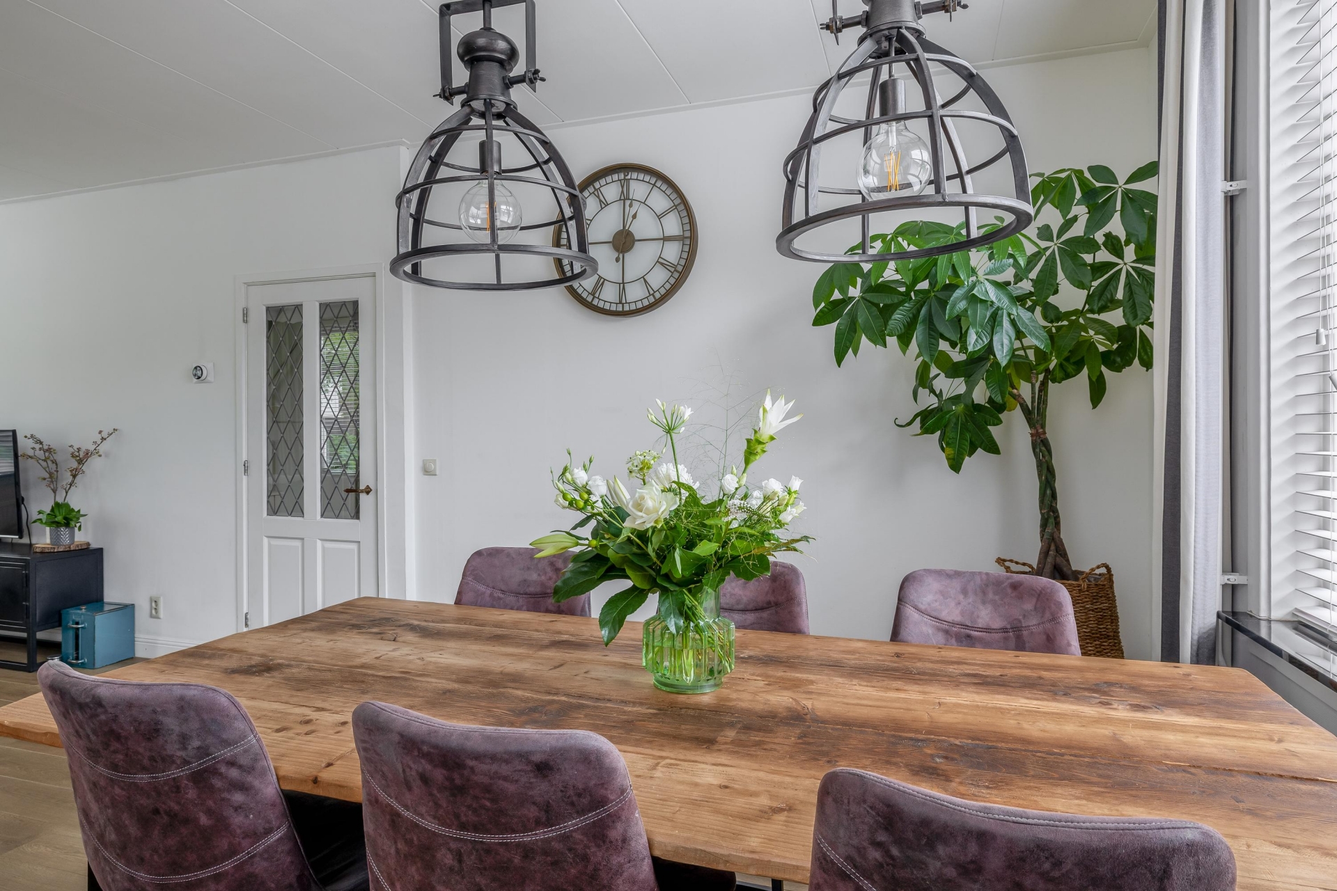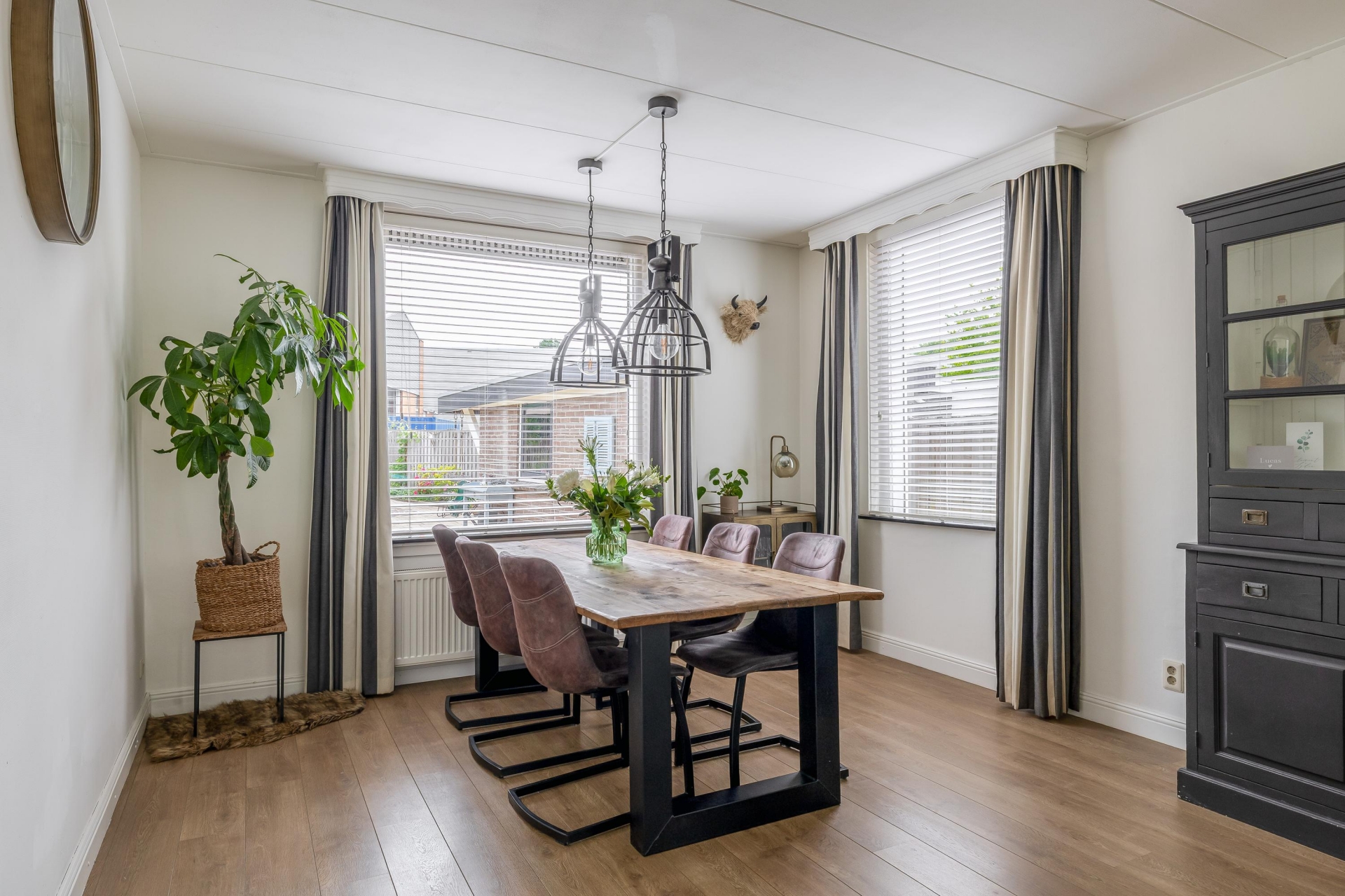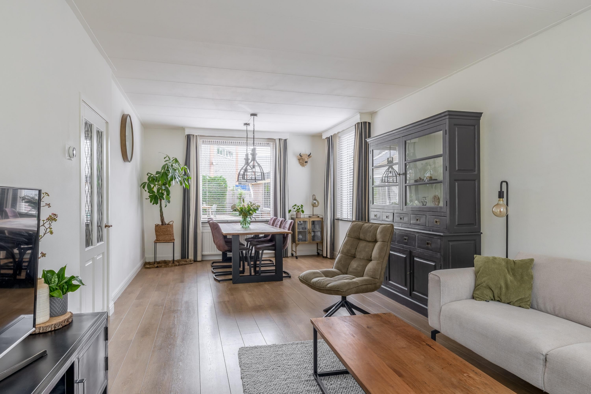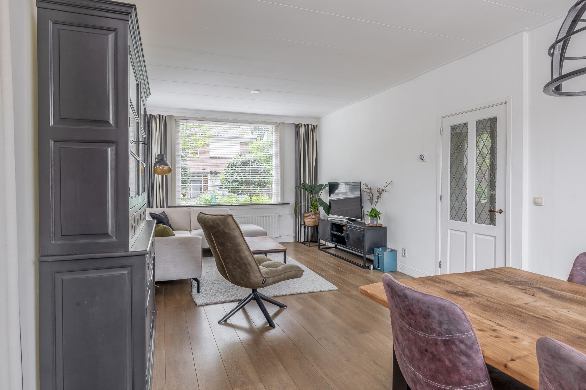 Zodra je de woonkamer binnenstapt, valt het warme en verzorgde karakter meteen op. Grote ramen aan voor- en zijkant zorgen voor veel daglicht, en het uitzicht op het groen in de straat maakt het plaatje compleet. De ruimte is praktisch ingedeeld, met een comfortabele zithoek en een gezellige eethoek bij het raam. De afwerking is keurig, met een strakke vloer, lichte wanden en een prettige, neutrale stijl: instap klaar dus.