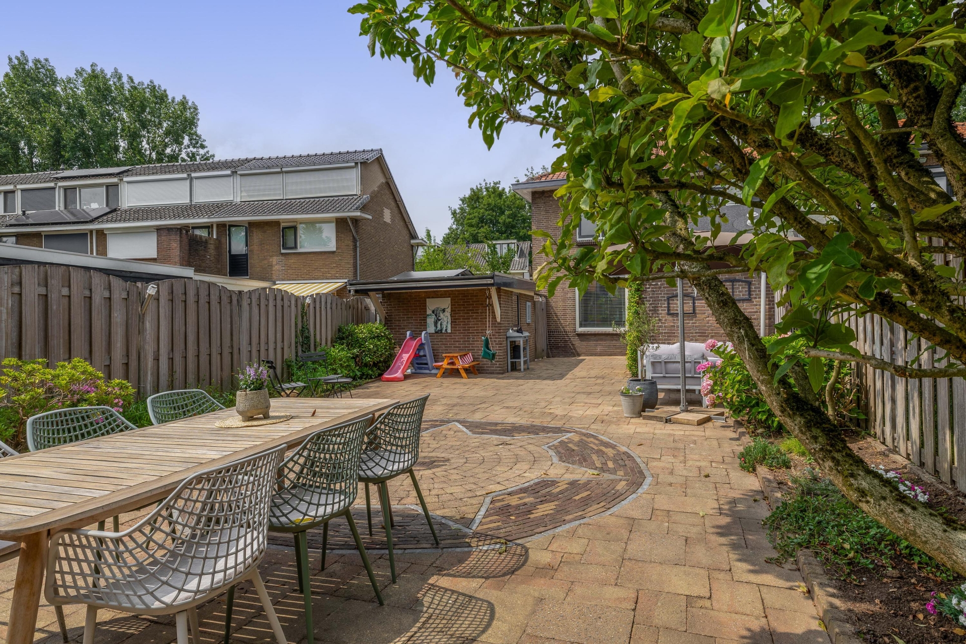 Achter het huis ligt een diepe tuin op het zuidoosten. Dankzij de lengte van het perceel geniet je hier vrijwel de hele dag van de zon. Er is meer dan genoeg ruimte voor een eettafel, loungehoek én speelplek voor kinderen.