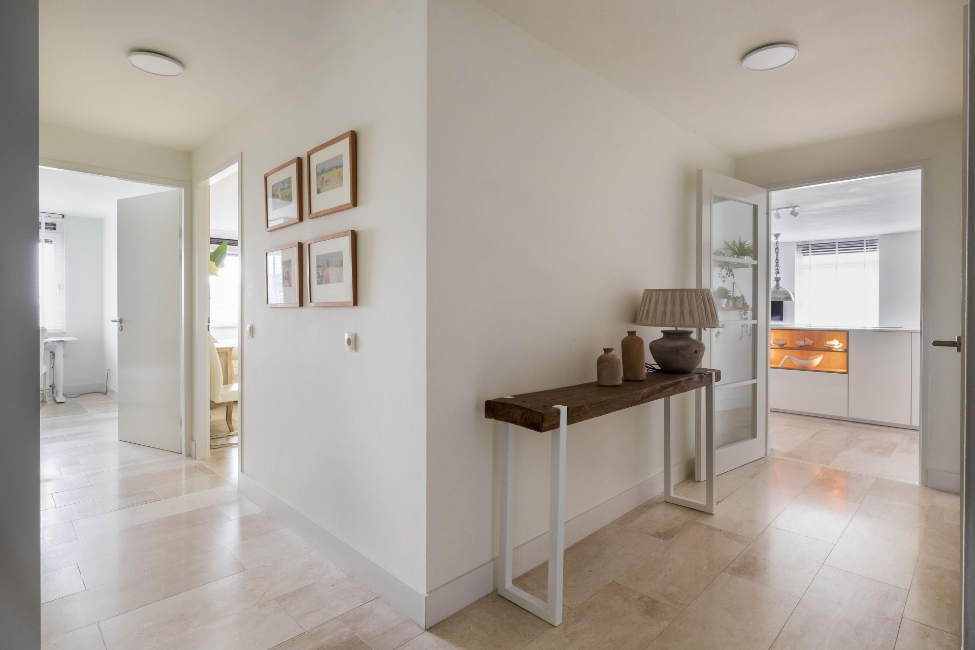 De combinatie van strakke lijnen, moderne apparatuur en warme materialen past perfect bij de rest van het appartement. Alles is logisch ingedeeld en praktisch in gebruik, zonder dat het zijn uitstraling verliest. Vanuit de keuken kijk je mooi de woonruimte in, wat het geheel extra ruimtelijk maakt.