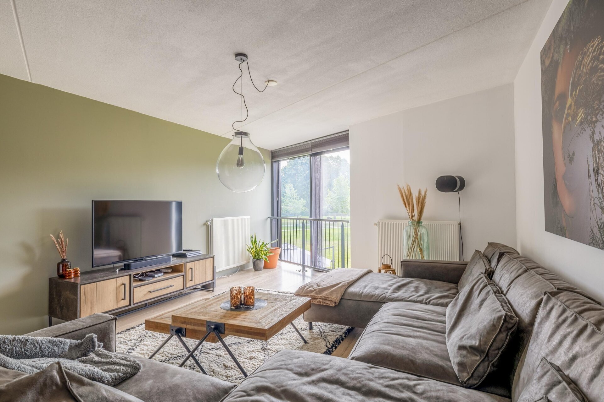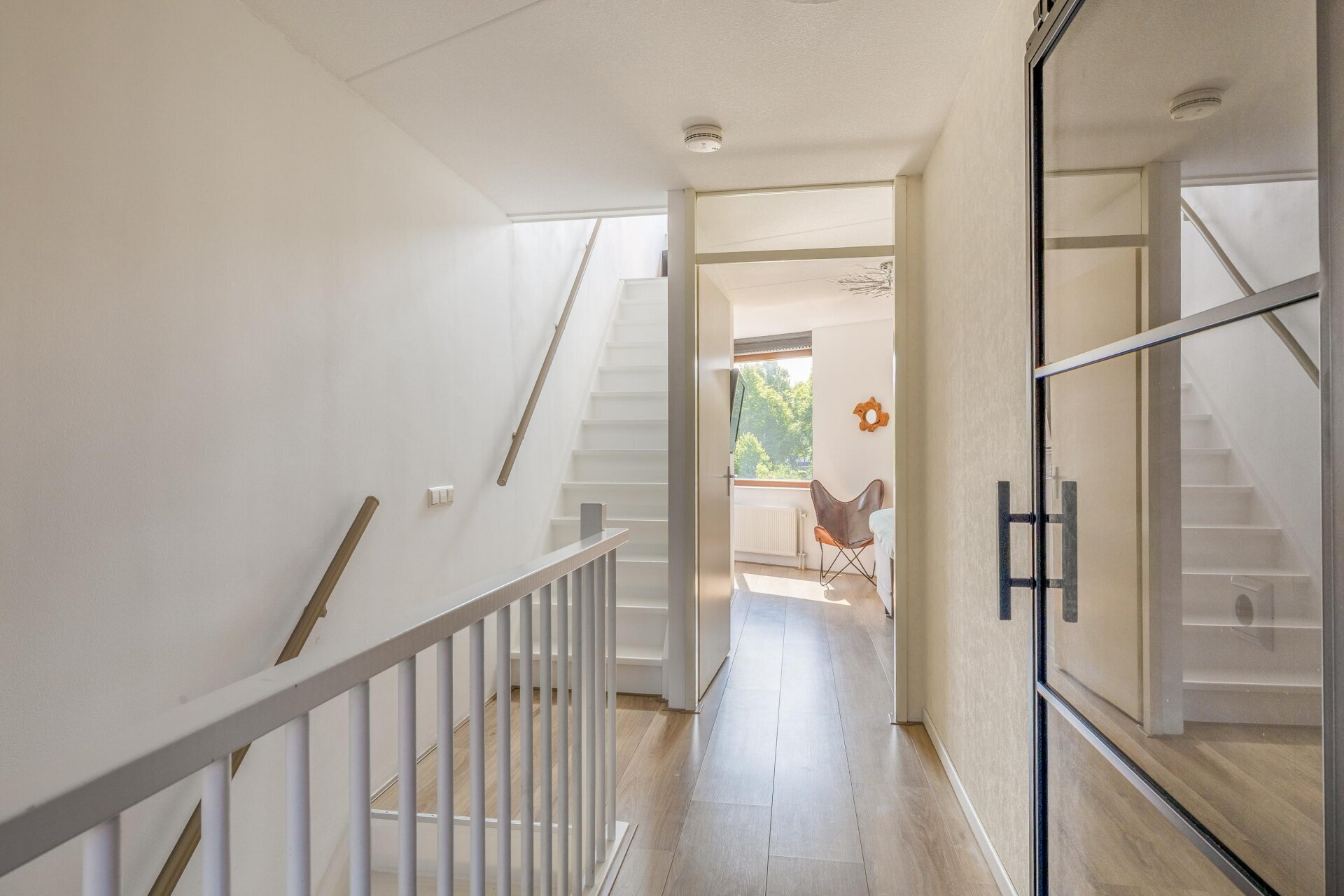 Op de eerste verdieping bevindt zich de doorzon woonkamer van maar liefst 44 m². Dankzij de glazen pui aan de voorzijde en de schuifpui aan de achterzijde (Frans balkon) komt het daglicht hier van twee kanten binnen. De woonkamer biedt volop ruimte voor een royale zithoek en een grote eettafel. Hier woon je letterlijk boven het groen, met een prachtig uitzicht over het park.
