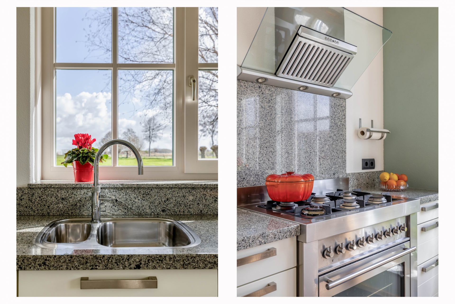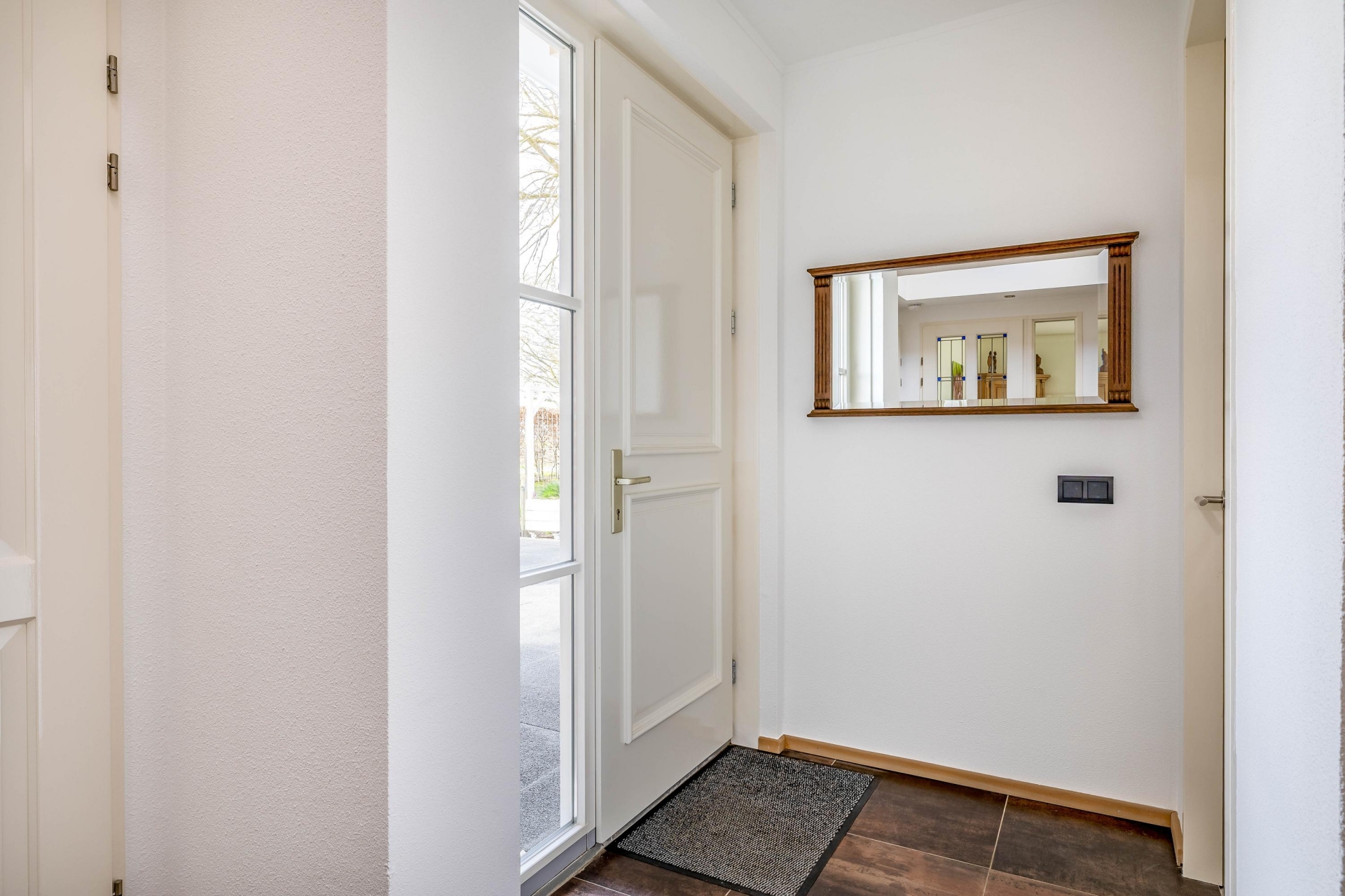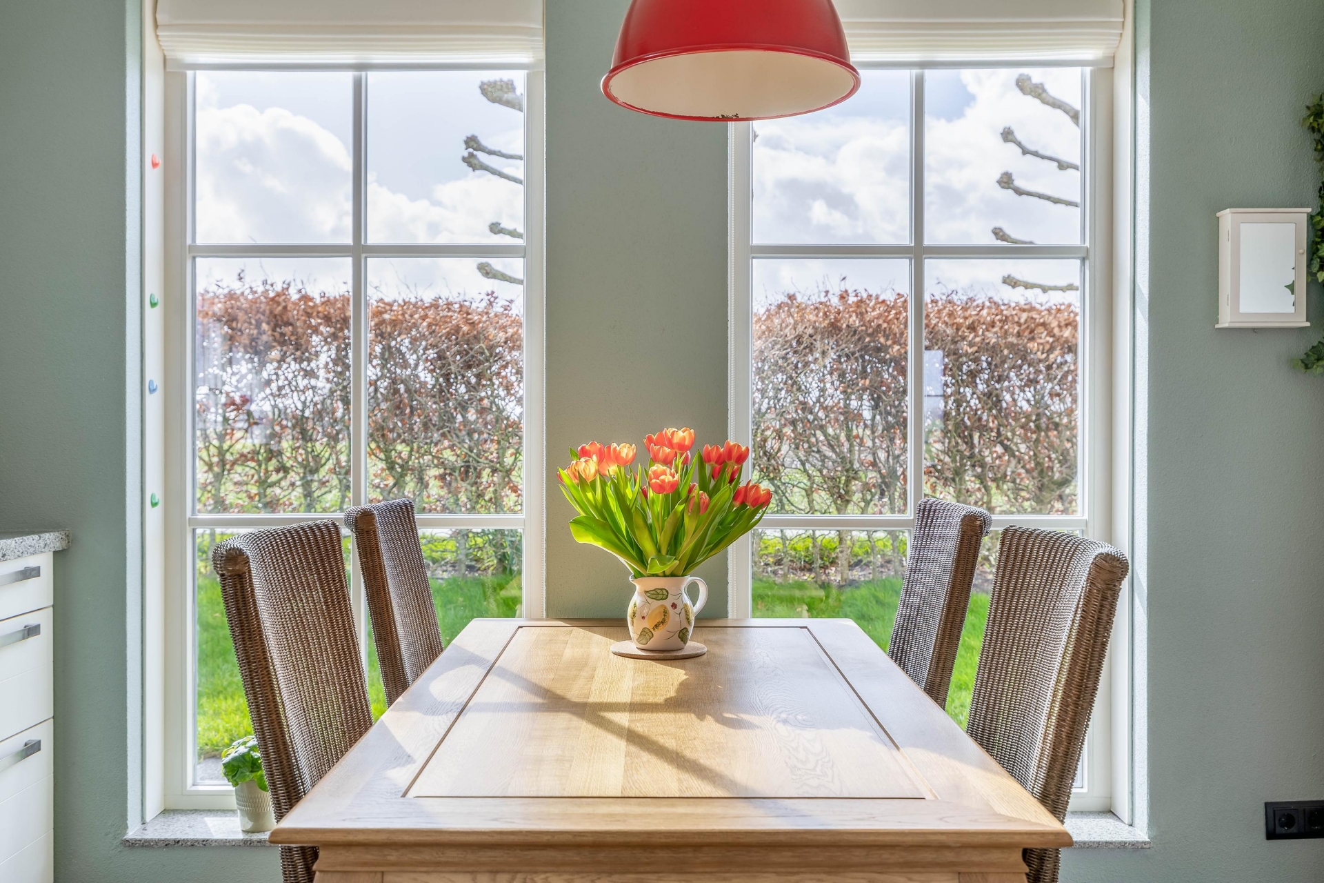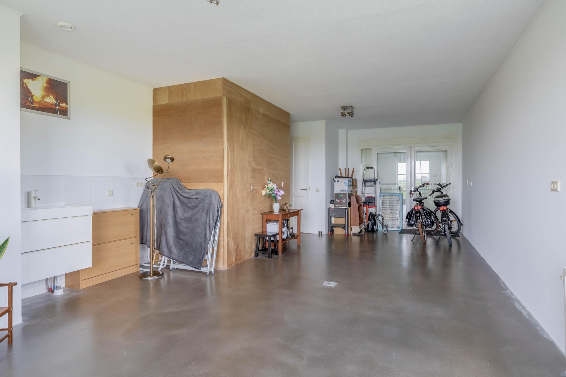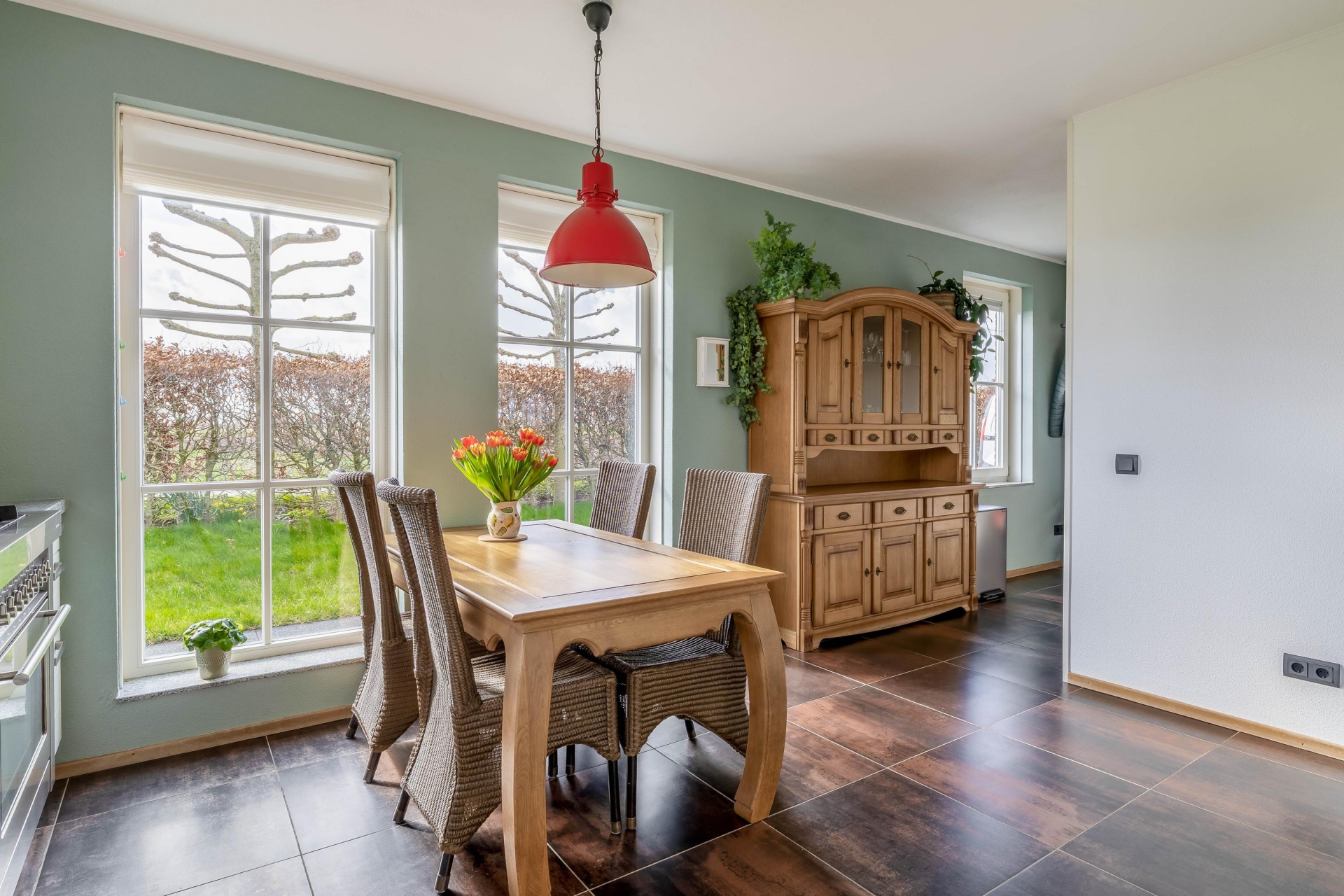 Aan de voorzijde vind je de woonkeuken, die praktisch is ingericht en voldoende ruimte biedt om uitgebreid te koken en samen te komen. Aansluitend is de praktische bijkeuken met vaste schuifkastenwand en aansluitingen voor wasmachine en droger.