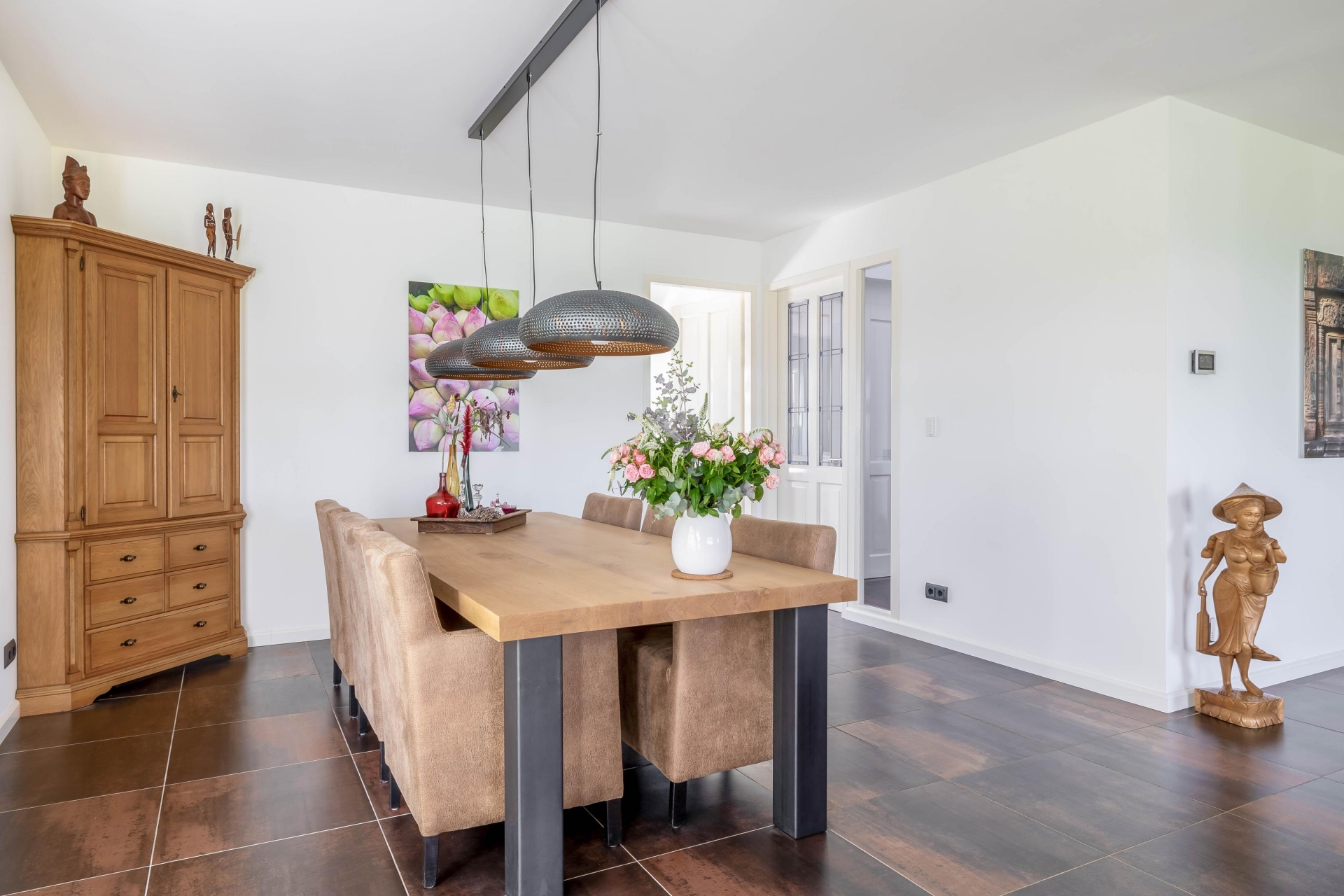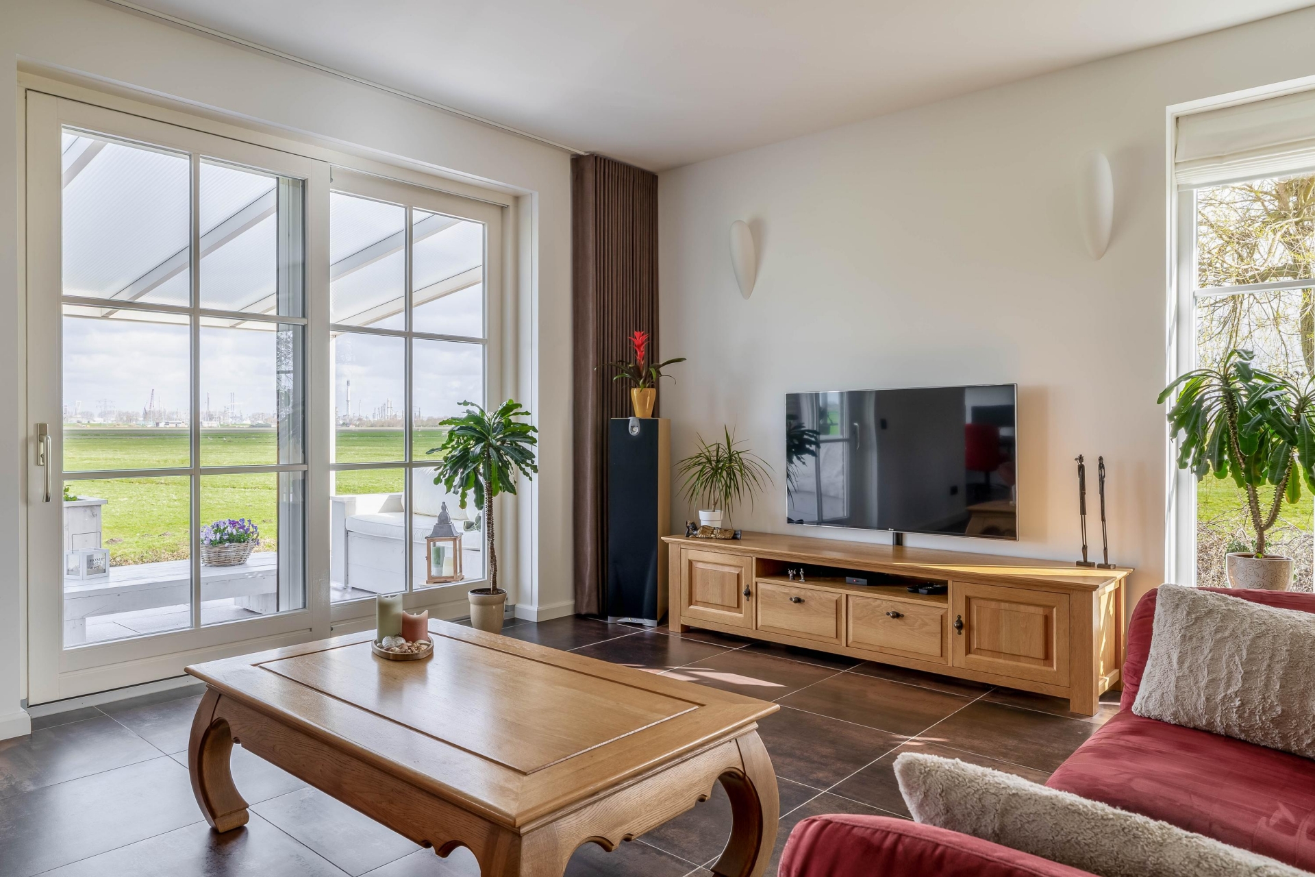 De woonkamer is met circa 63 m² een echte eyecatcher en vormt het hart van het huis. Dankzij de grote raampartijen en de ligging rondom geniet je hier de hele dag van licht en een prachtig vrij uitzicht over de omliggende weilanden. De ruimte voelt open en comfortabel aan, met volop mogelijkheden voor een royale zithoek en een grote eettafel. Vanuit de leefruimte heb je direct toegang tot de aangebouwde overkapping, een plek waar binnen en buiten naadloos in elkaar overlopen. Hier zit je beschut en geniet je optimaal van het buitenleven, ongeacht het seizoen.