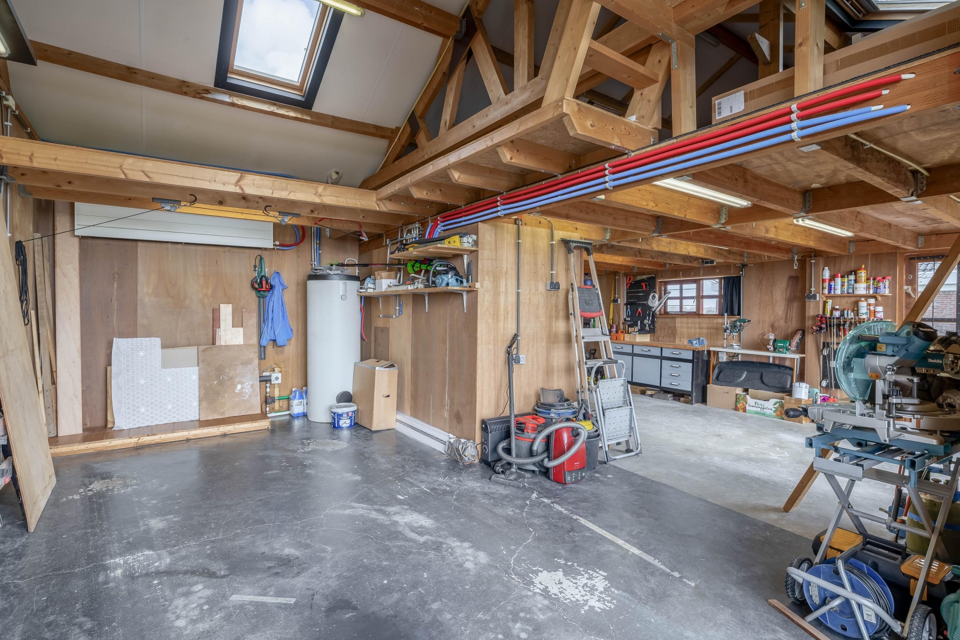 De vrijstaande dubbele garage van circa 47 m² is meer dan alleen een plek voor auto’s. Deze ruimte is volledig uitgerust met elektra, water, een pantry en een eigen douche met toilet. In combinatie met de aanwezige zolder biedt dit volop mogelijkheden voor bijvoorbeeld een zelfstandige ruimte voor kinderen, een gastenverblijf of een combinatie van hobby en werk aan huis.