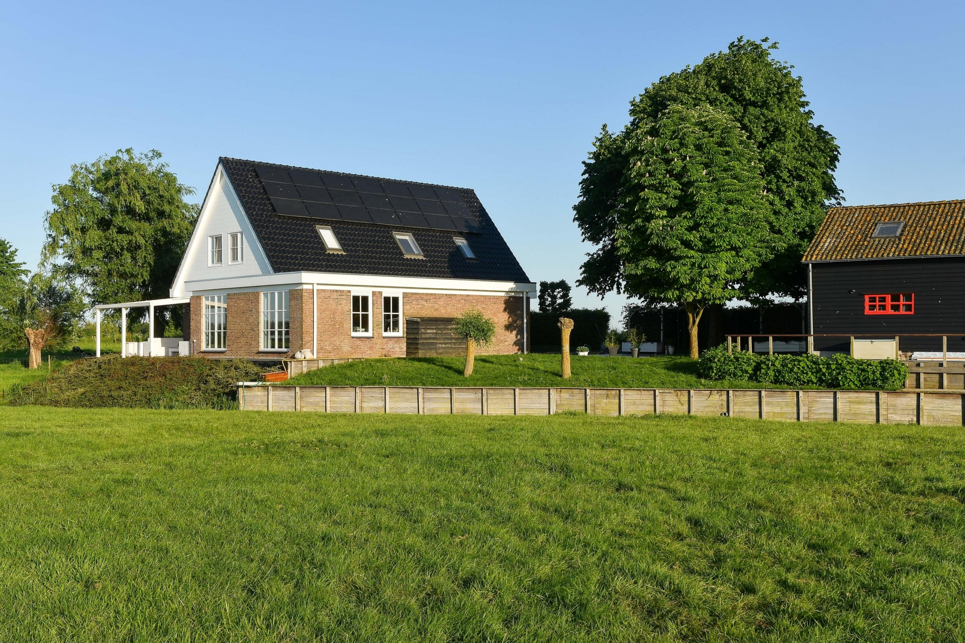 Het perceel van 1.280 m² biedt een gevoel van vrijheid dat je zelden tegenkomt. De tuin ligt rondom het huis en is verzorgd aangelegd, met meerdere plekken om te genieten van zon, rust en uitzicht. De ligging aan het water en het open landschap versterken het gevoel van exclusiviteit.