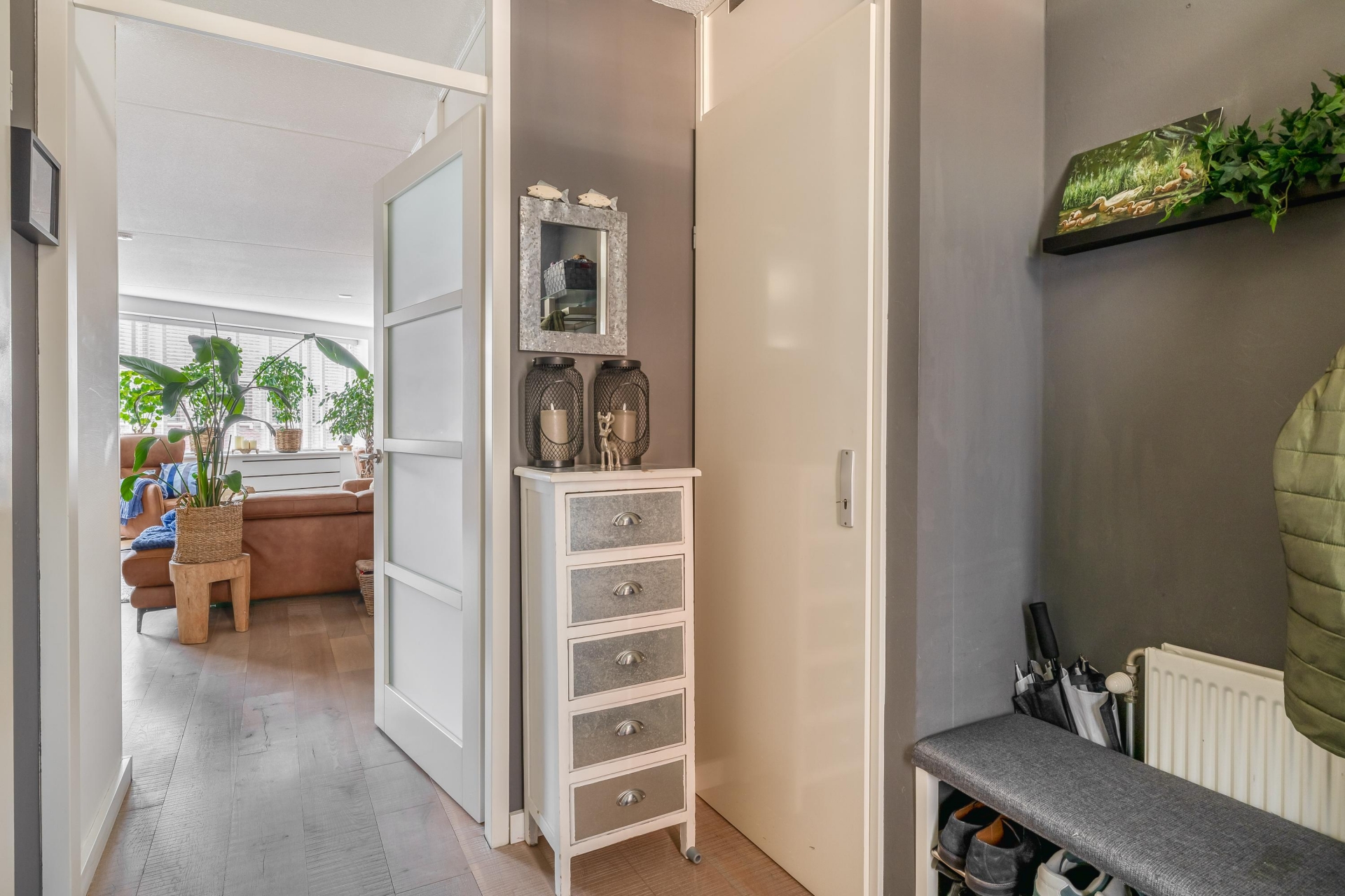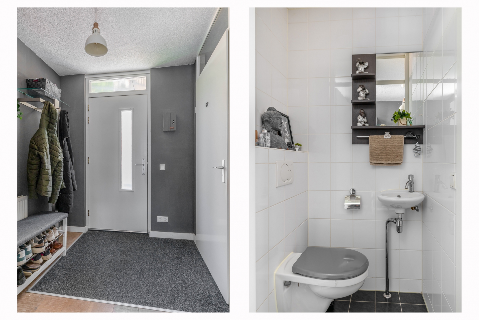 Binnenkomst in de ruime hal, waar zich de meterkast (met 8 groepen), een separaat toilet met zwevend closet en een bergruimte bevinden. In deze bergkast is tevens de aansluiting voor de wasmachine en de opstelplaats voor de CV-ketel aanwezig.