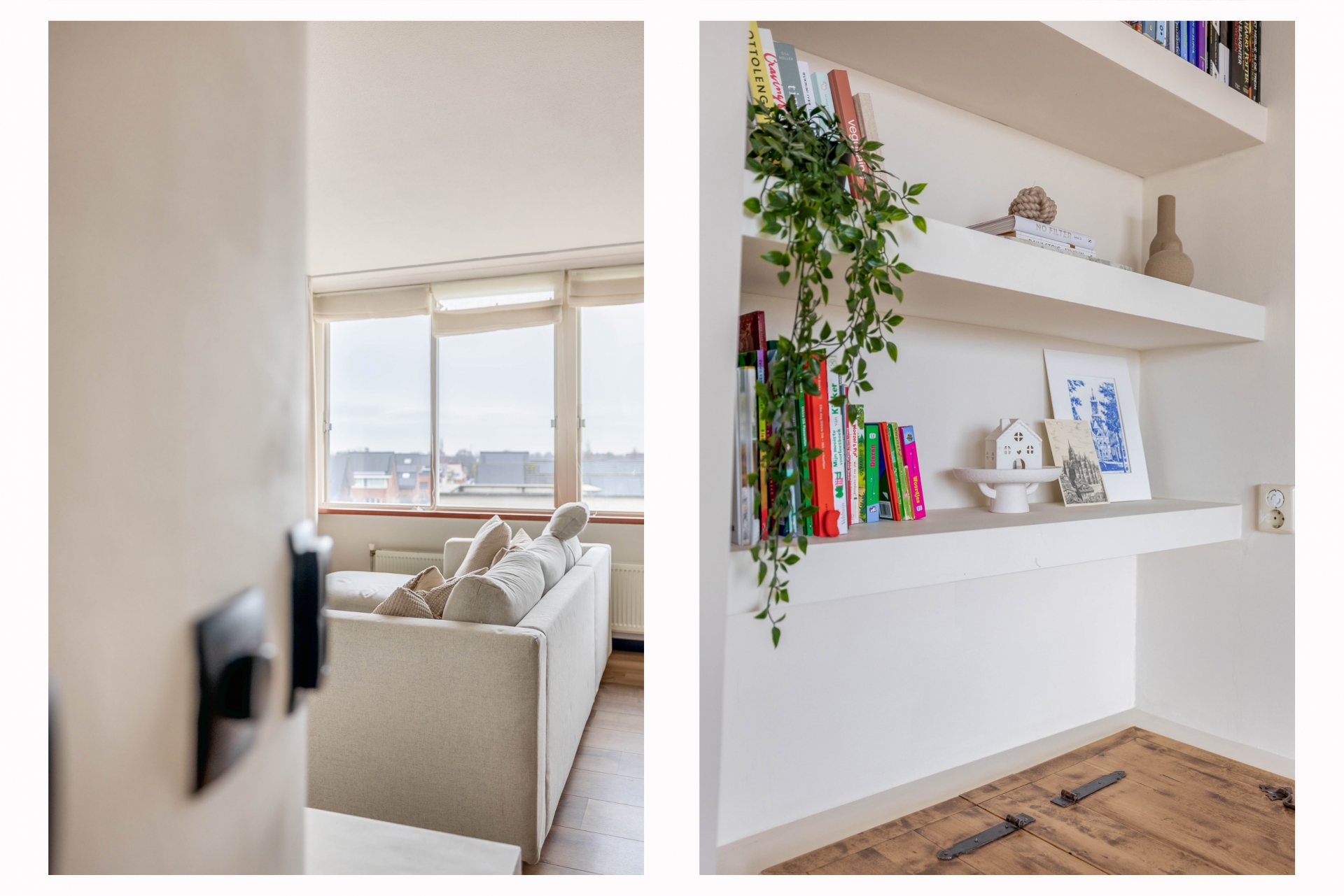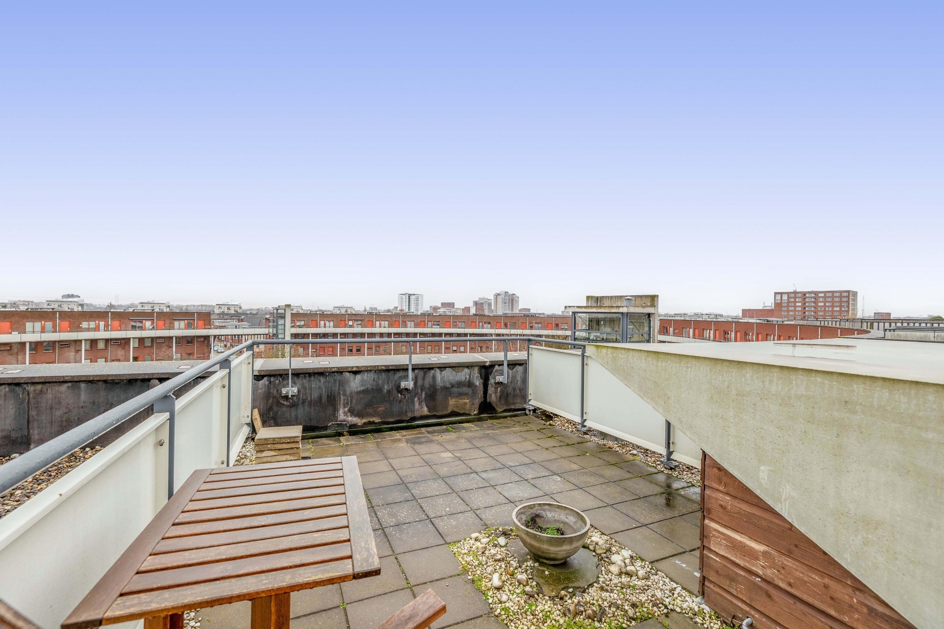 De keuken is uitgevoerd in een klassieke stijl met witte fronten en donker werkblad en is van alle gemakken voorzien. Dankzij het slimme ontwerp heb je hier veel werk- en opbergruimte. Vanuit de entree van de woning loop je via een trap door naar het ruime dakterras. Dit zonnige terras biedt de hele dag zon en is groot genoeg voor een loungeset – een heerlijke plek om buiten te eten of gewoon te genieten van de rust.