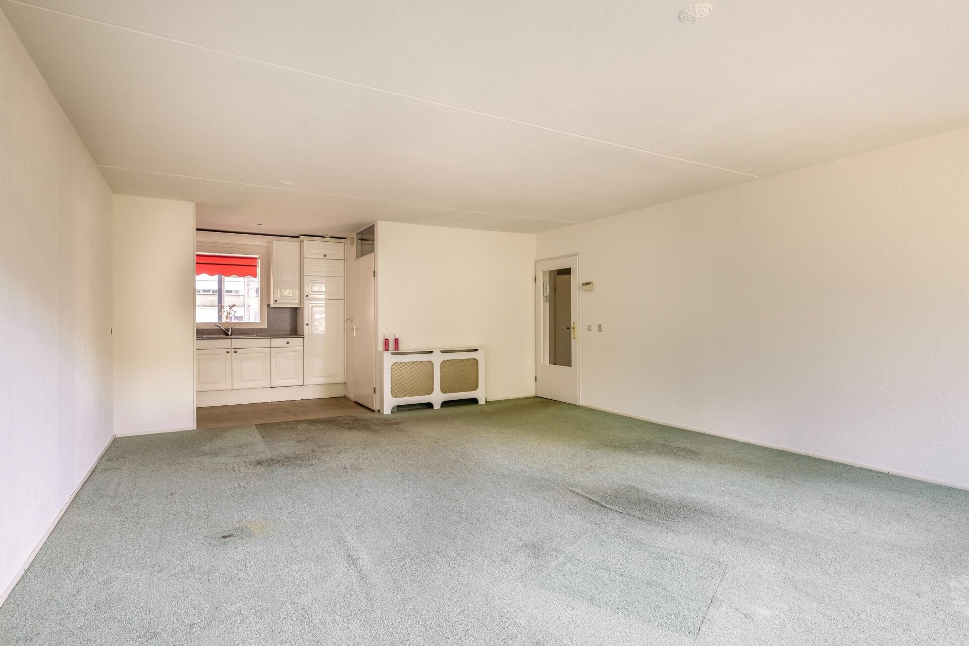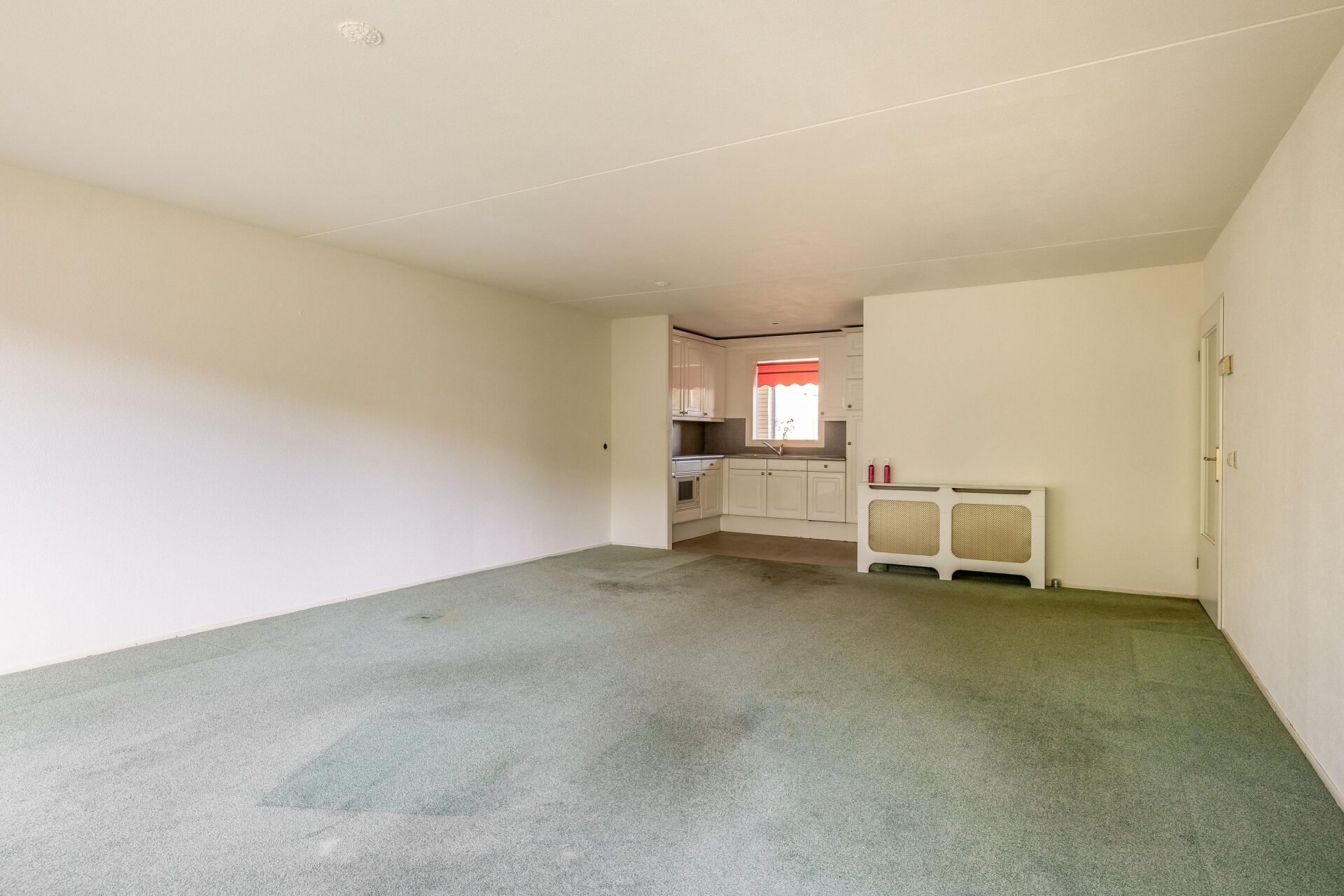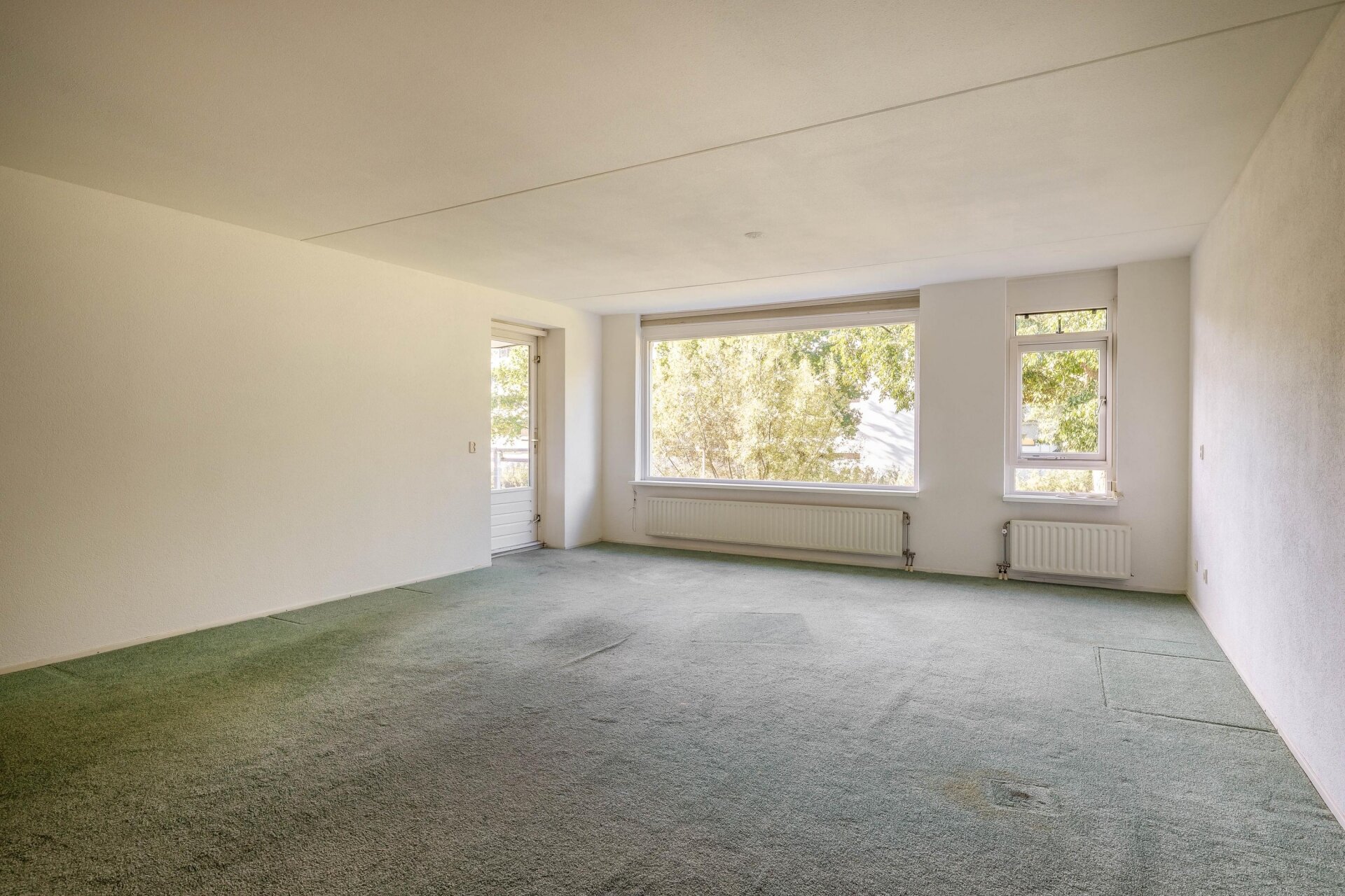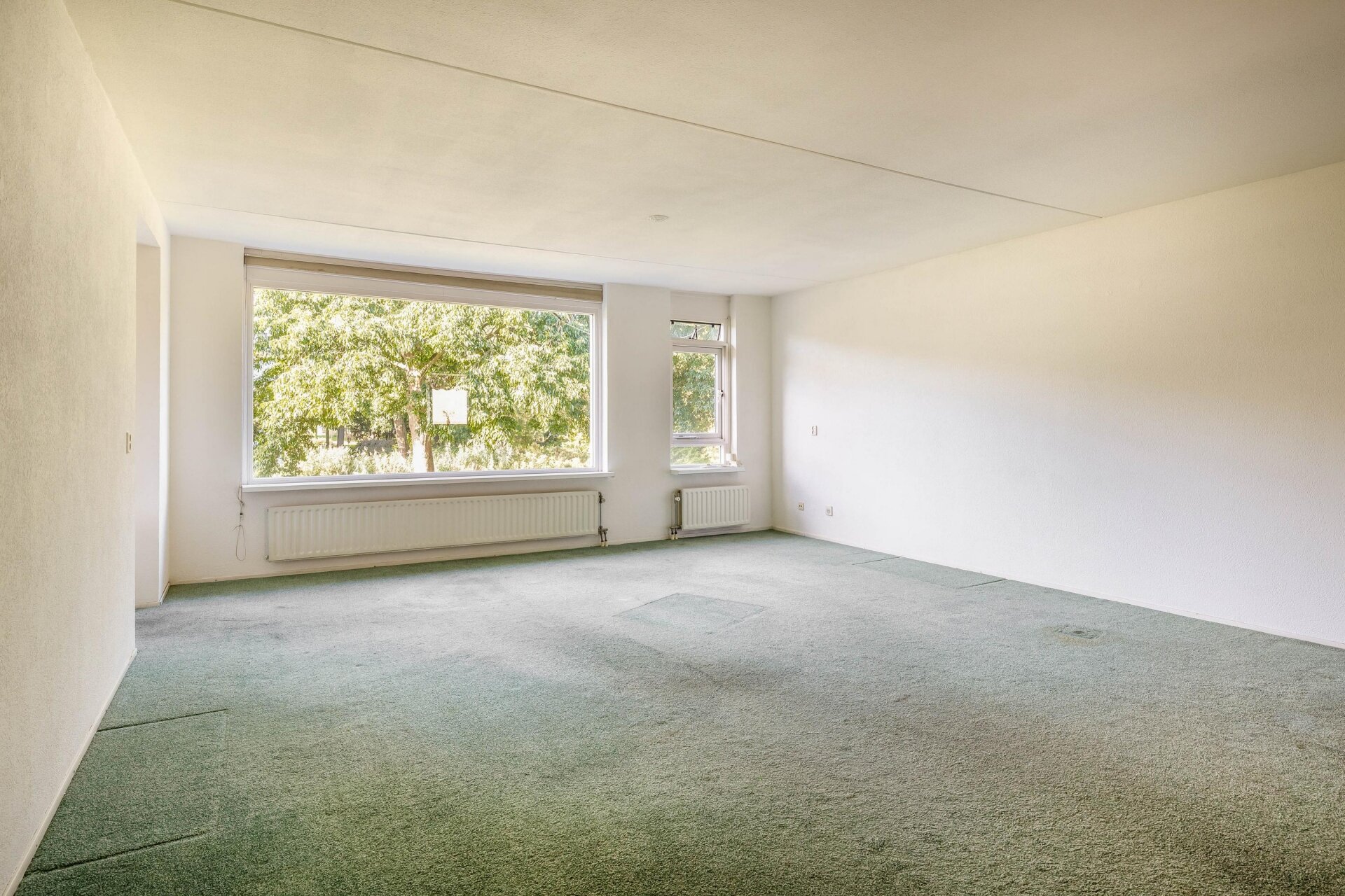 De royale woonkamer met grote raampartijen zorgt voor volop daglicht en zicht op het omliggende groen. Je hebt hier ruimte genoeg voor zowel een gezellige zithoek als een ruime eethoek. Vanuit de woonkamer stap je zo het balkon op: zonnig, beschut en gelegen op het zuidwesten.