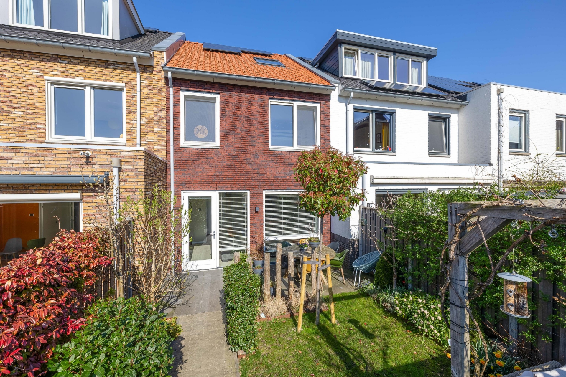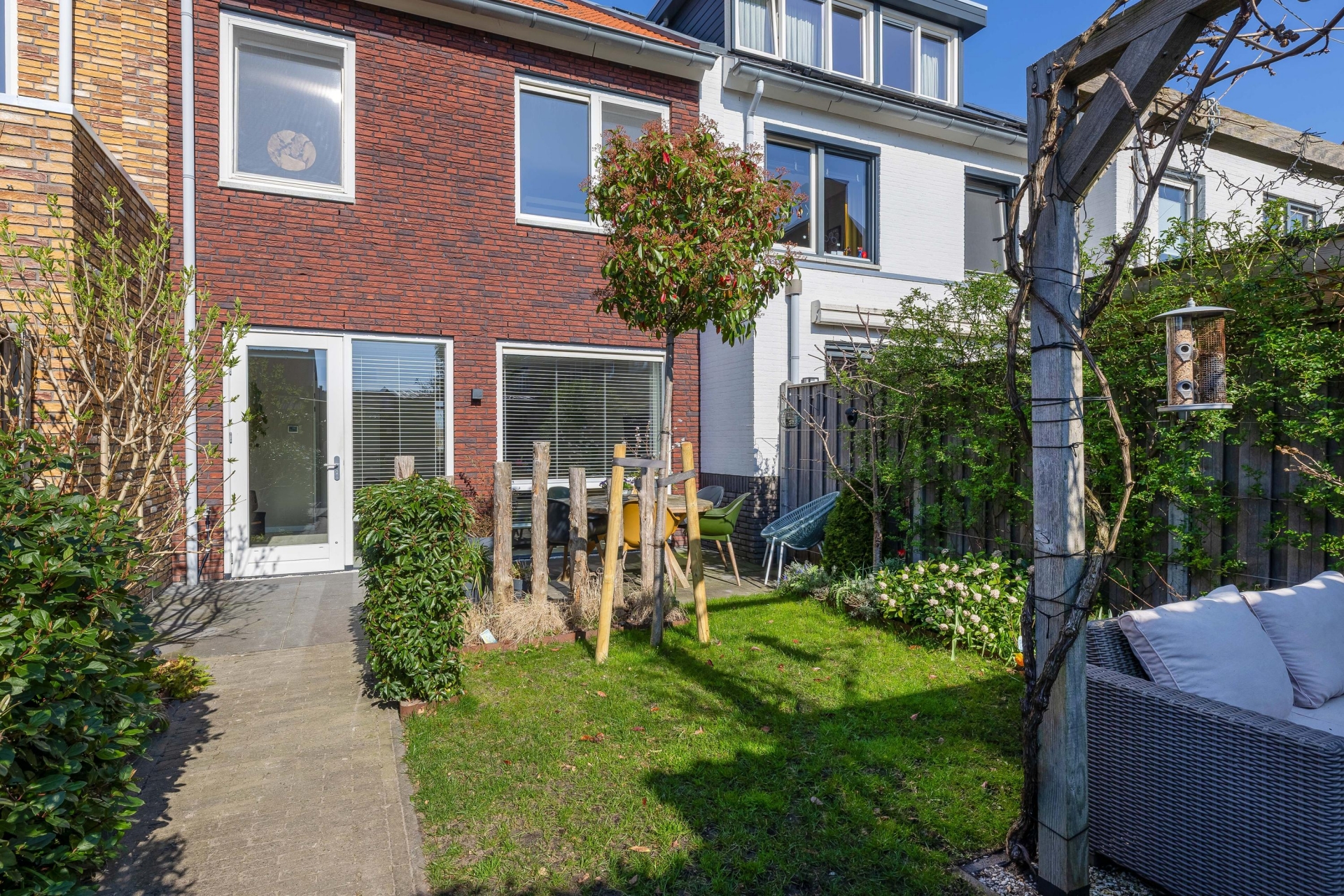 De tuin is onderhoudsvriendelijk aangelegd en ligt op het zuidoosten. Dat betekent dat je hier al vroeg op de dag van de zon geniet en dat deze gedurende de dag lekker doorloopt. Achterin de tuin staat een houten berging met voldoende ruimte voor fietsen en tuingereedschap. Via de achterom kom je gemakkelijk bij de parkeerplaatsen waar de privé parkeerplaats is.