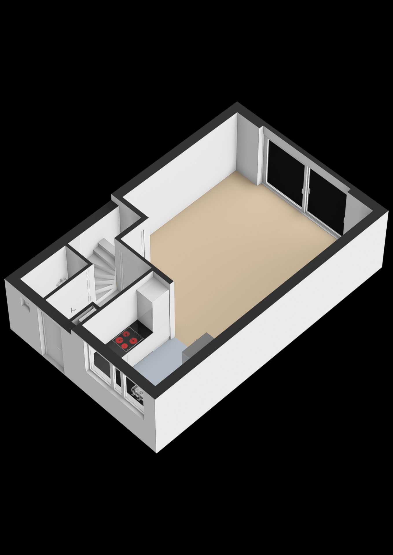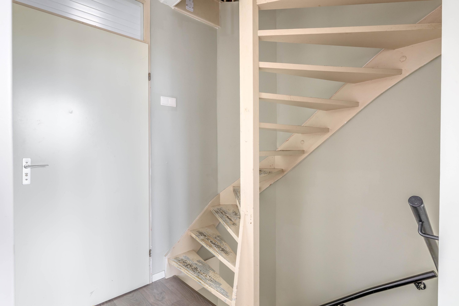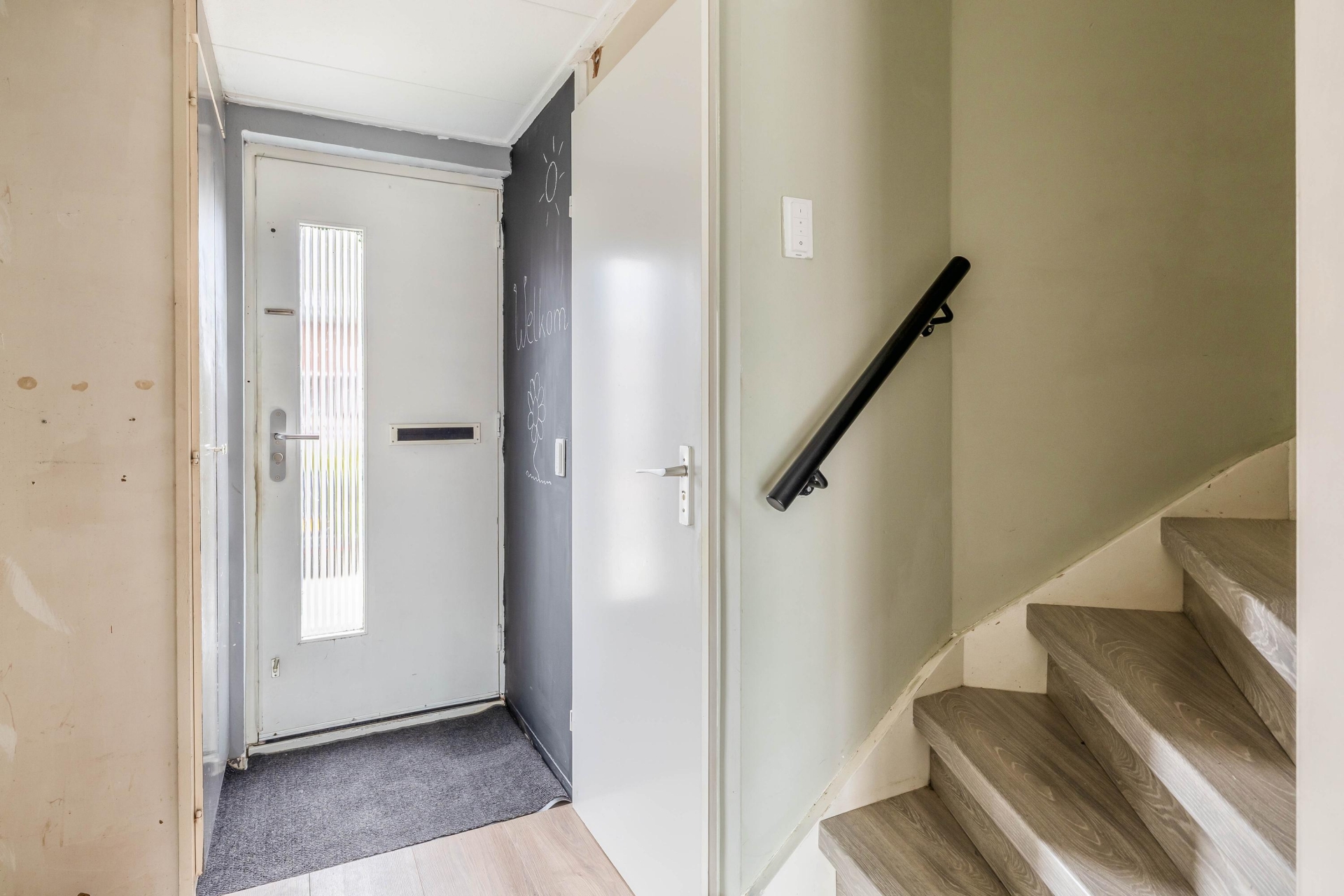 Bij binnenkomst kom je in de entree met toegang tot het toilet, de meterkast en de trap naar boven. Vanuit hier loop je door naar de woonkamer aan de achterzijde van het huis. Deze ruimte is prettig licht dankzij de grote schuifpui en biedt voldoende plek voor een ruime zithoek. Het contact met de tuin maakt dit een fijne leefruimte waar binnen en buiten moeiteloos in elkaar overlopen.