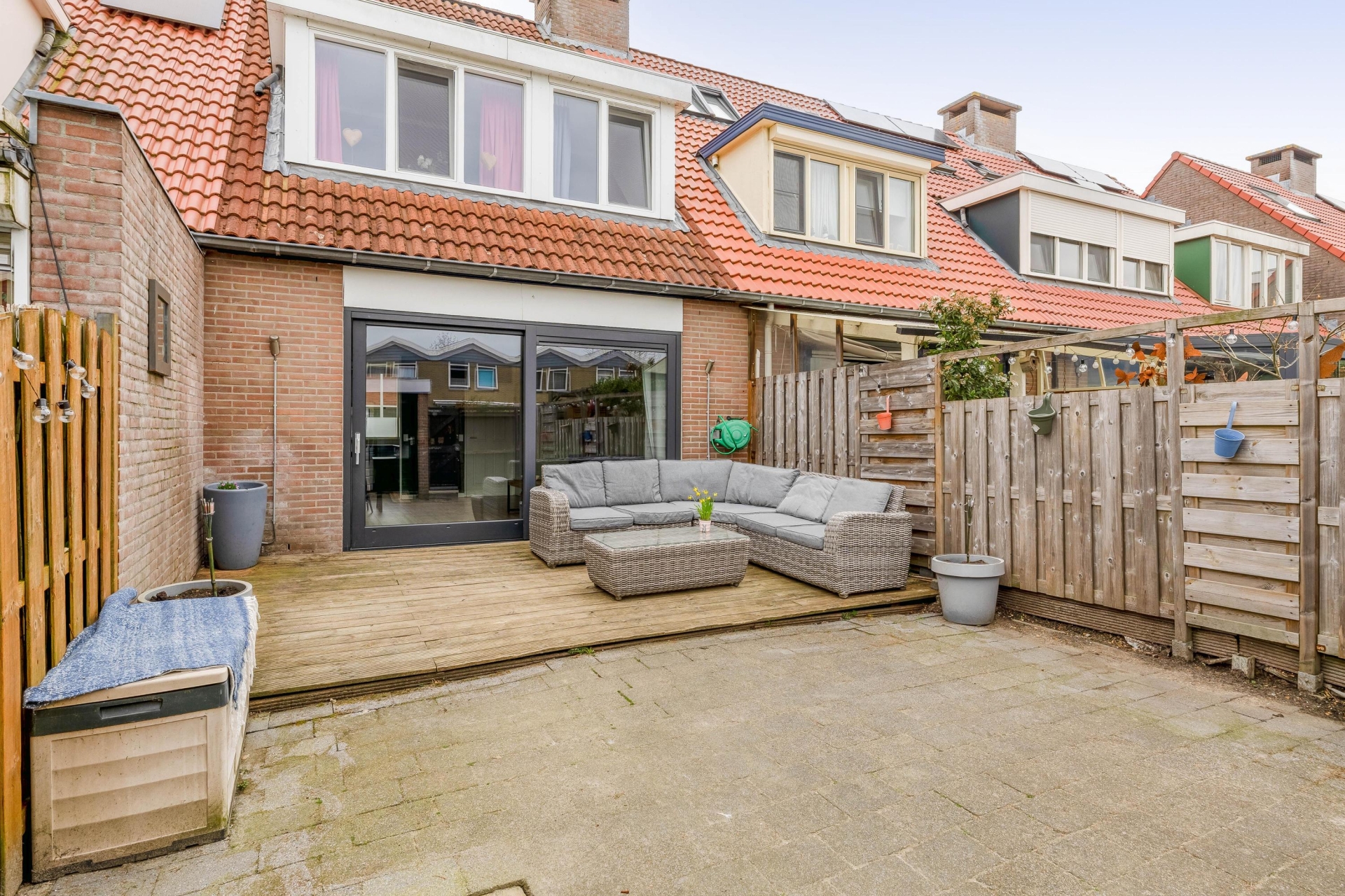 De achtertuin is gelegen op het oosten en biedt een fijne plek om de dag te starten met een kop koffie in de ochtendzon. De tuin is grotendeels bestraat en daardoor onderhoudsvriendelijk ingericht. Achterin staat een berging, ideaal voor fietsen en tuingereedschap. De tuin is diep genoeg om verschillende zitplekken te creëren en biedt voldoende ruimte voor zowel ontspanning als spelende kinderen.