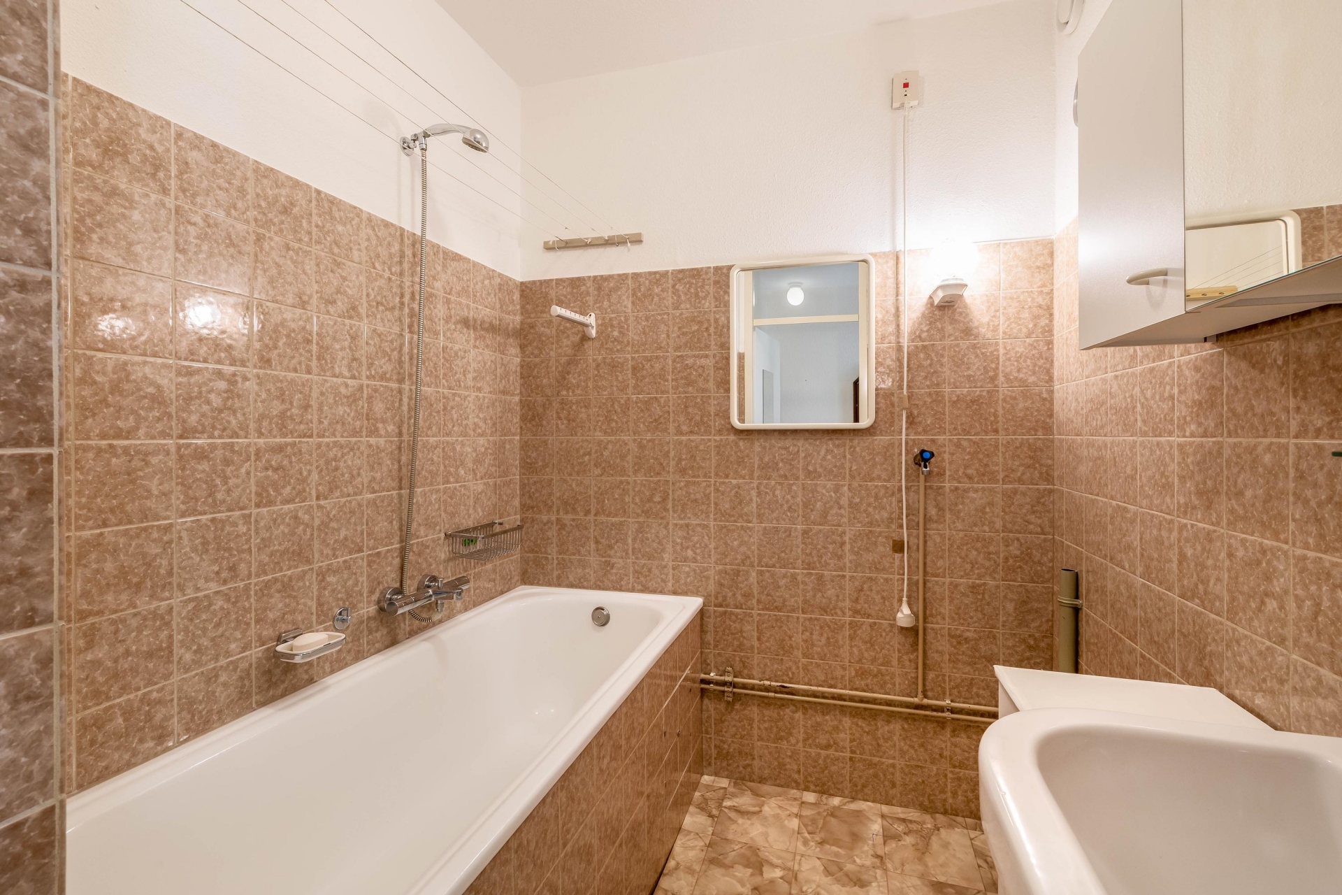 Aan de linkerzijde bevindt zich de badkamer, voorzien van een bad-douchecombinatie, een wastafelmeubel en een aansluiting voor de wasmachine. Direct naast de badkamer is een separaat toilet met fonteintje.