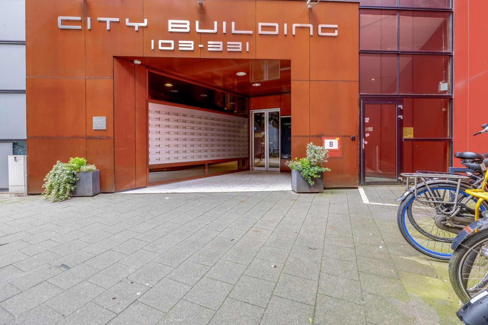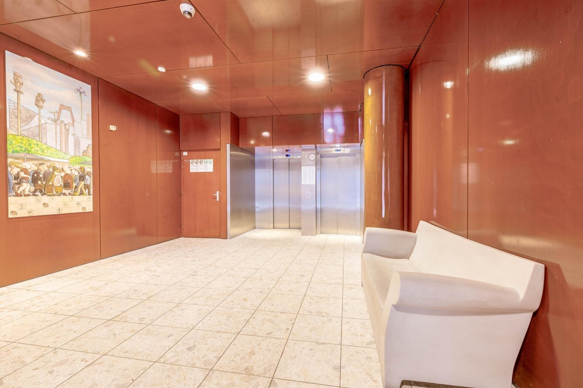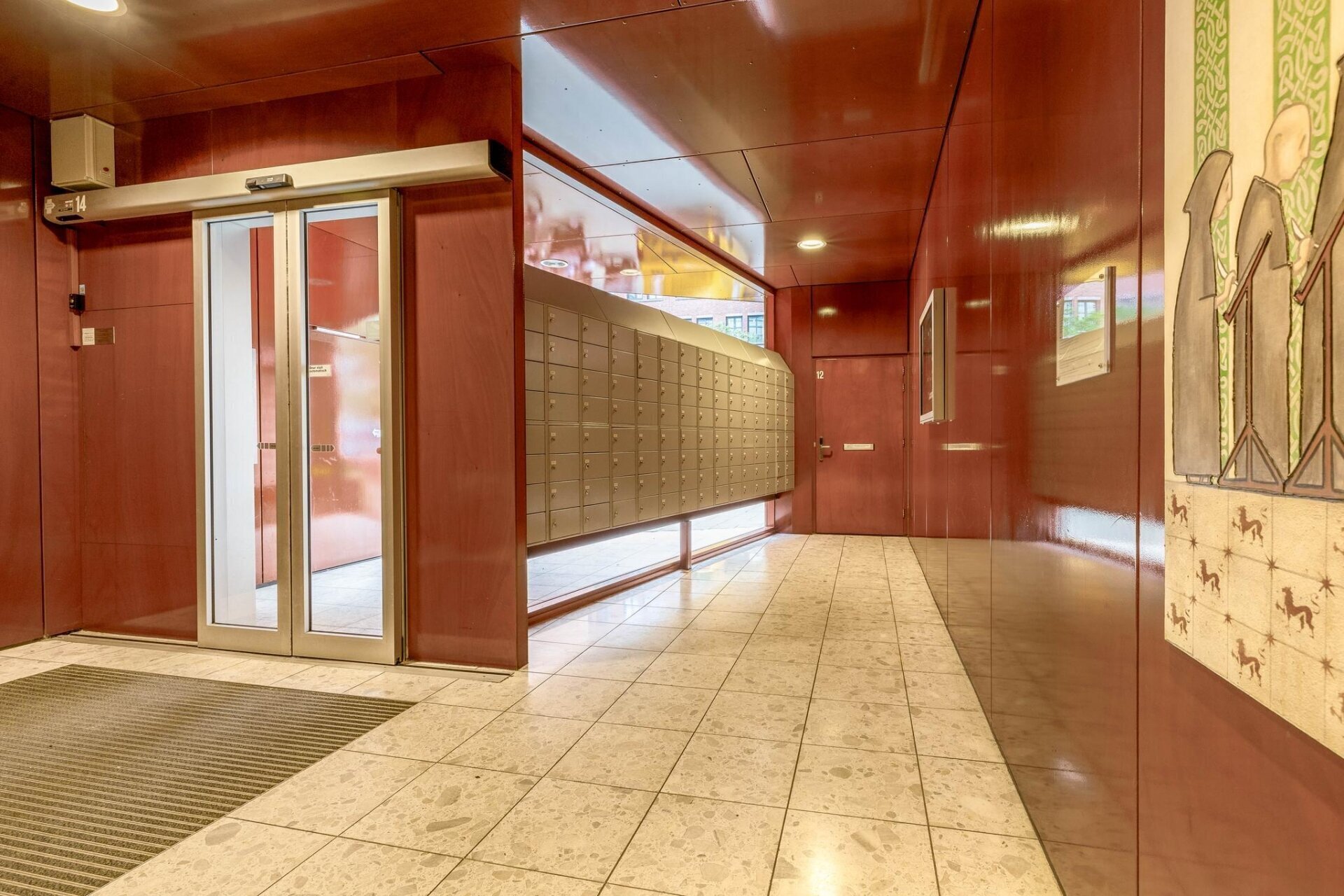 Afgesloten entree met videofoon, brievenbussen en toegang tot een ruime hal met twee liften.