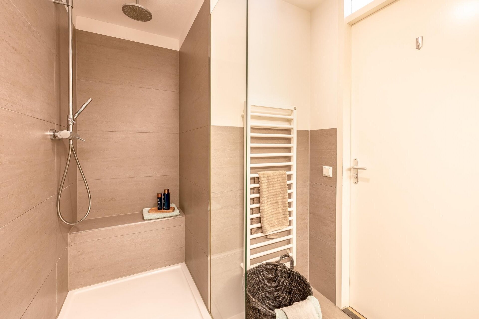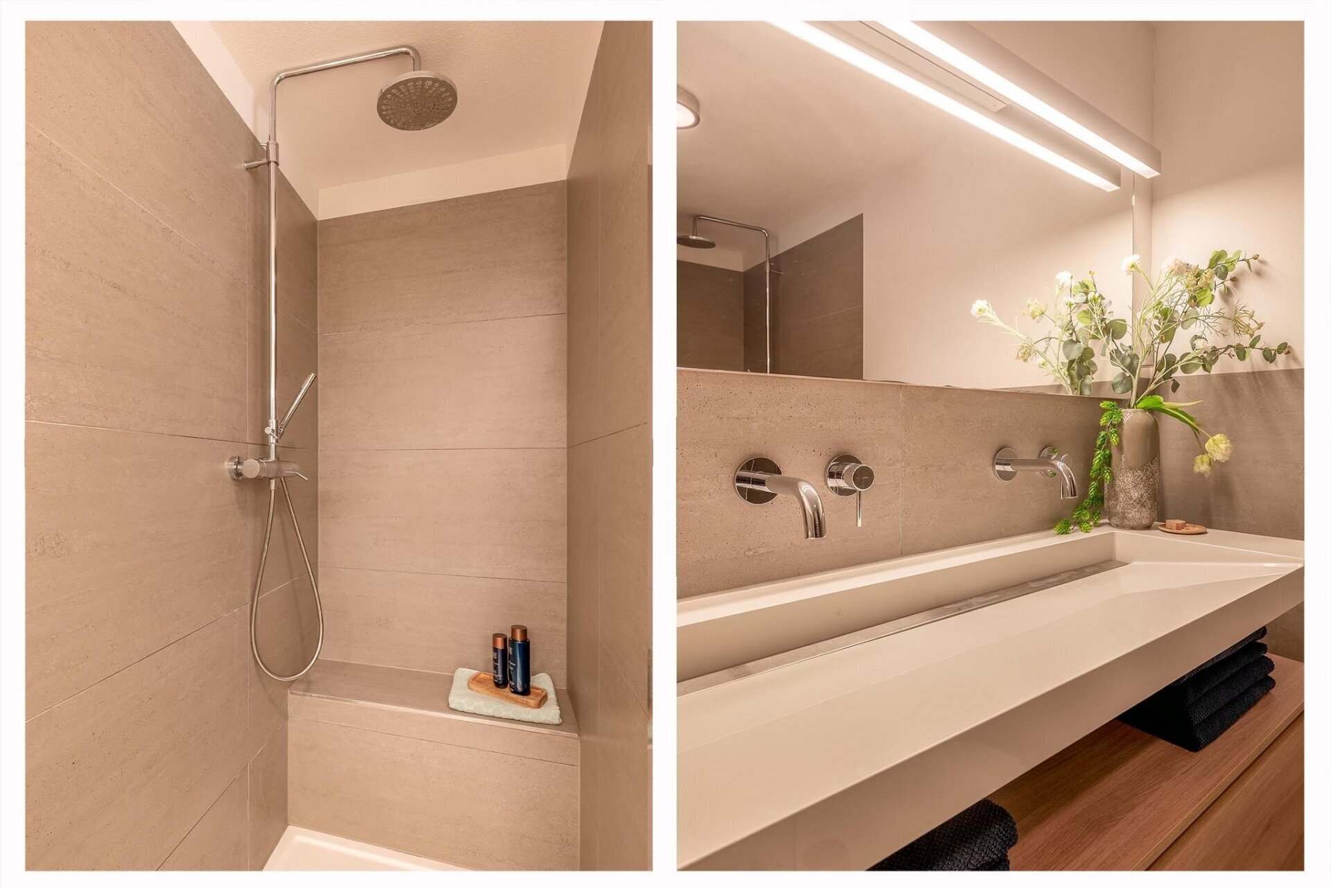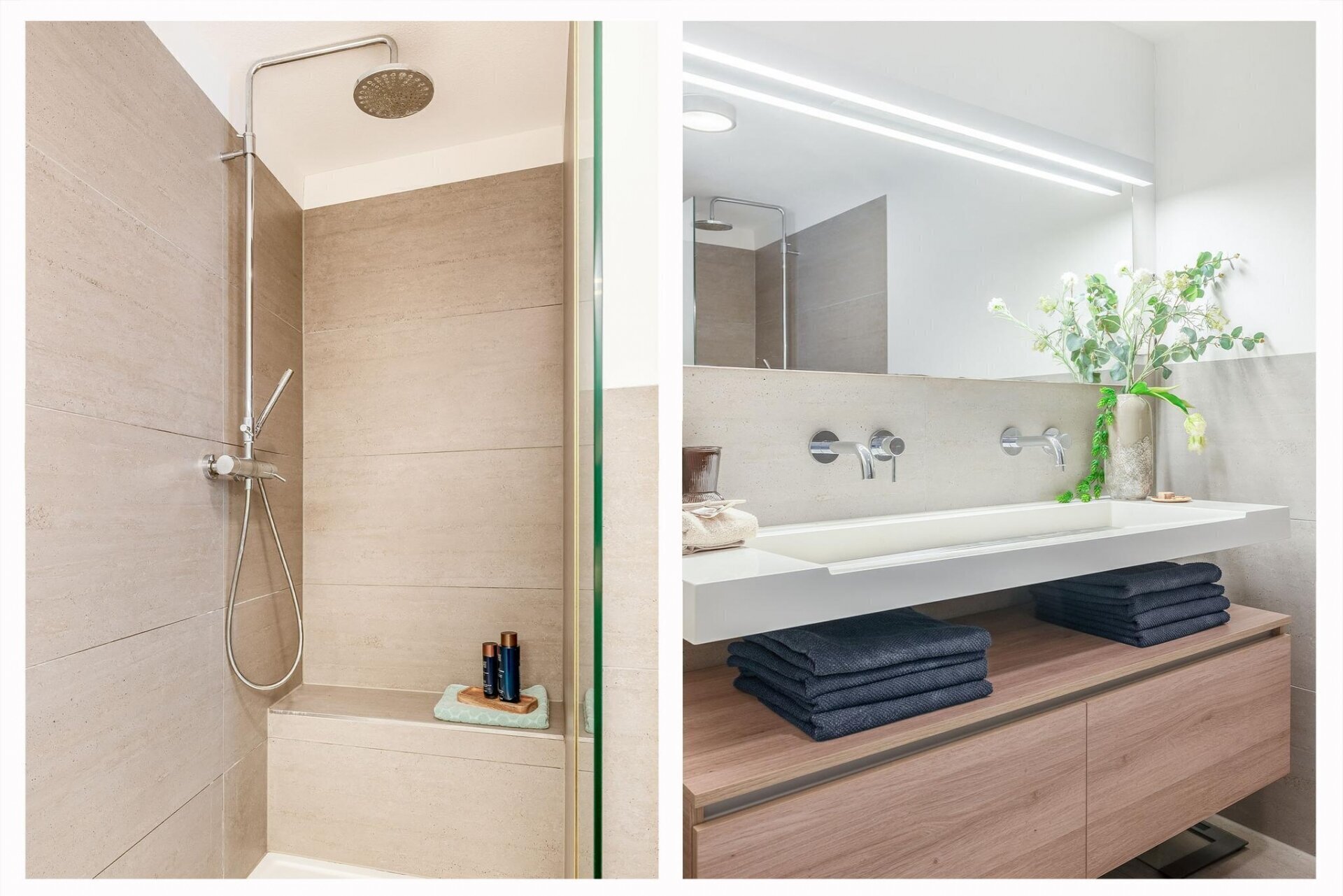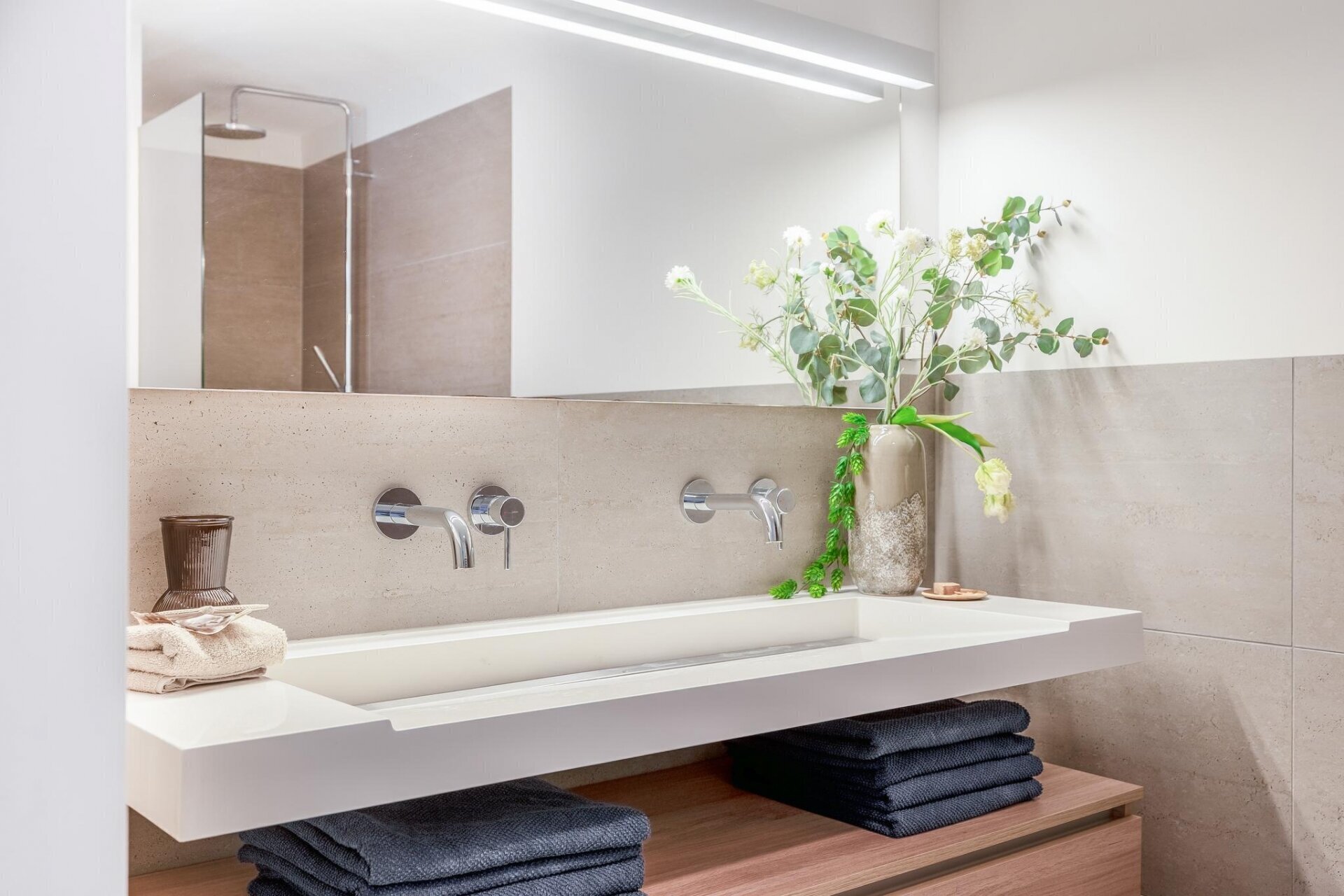 - Moderne badkamer met inloopdouche en dubbele wastafel;