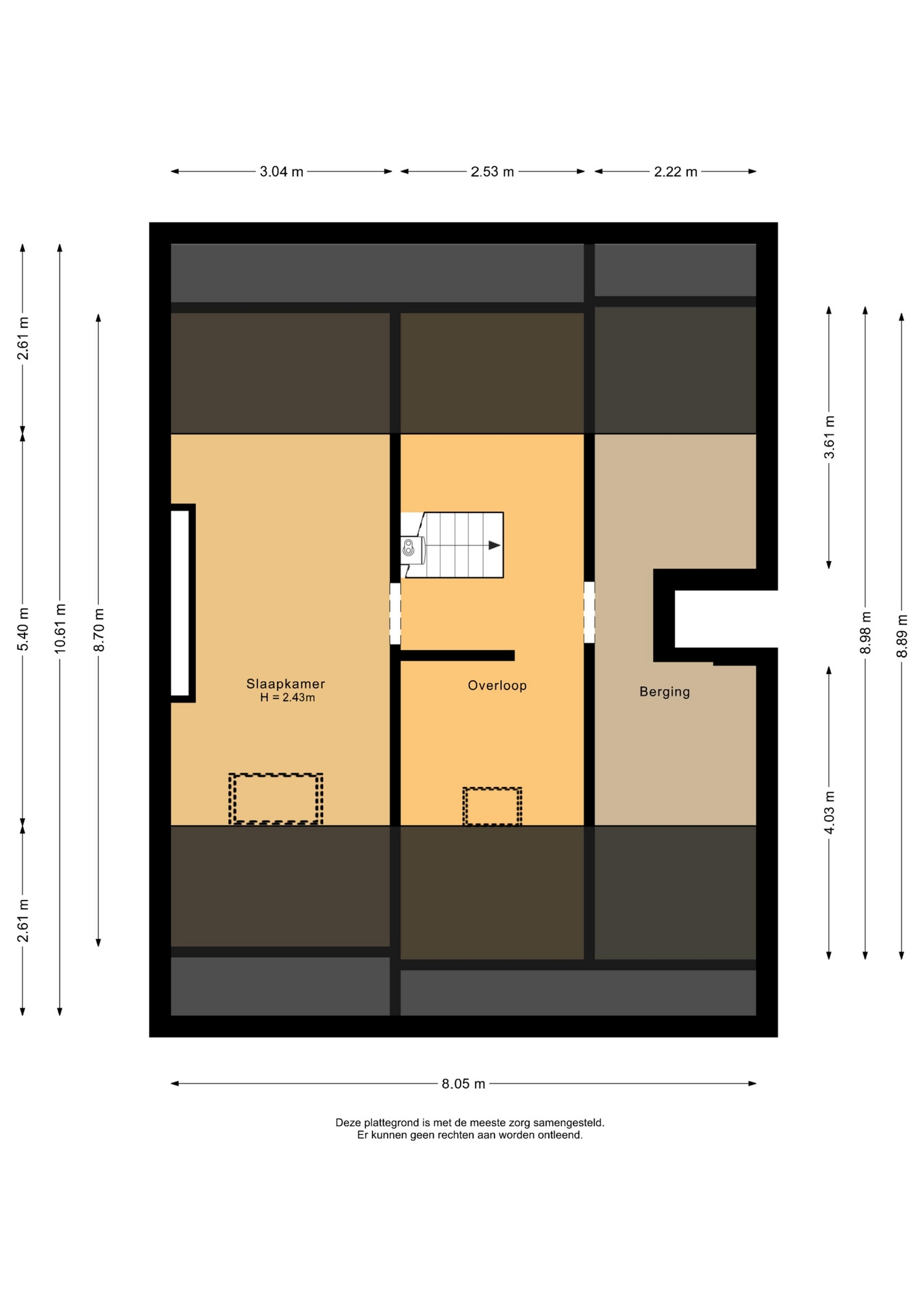 Via de trap bereikt u de bovengelegen verdieping met een ruime slaapkamer, een tweede kamer (ideaal als extra slaapkamer of werkkamer) en een overloop met CV-opstelling. De zolderverdieping biedt volop kansen: hier kan eenvoudig nog een volwaardige slaapkamer én eventueel een werk- of wasruimte worden gerealiseerd. Dit maakt de woning bijzonder geschikt voor gezinnen of thuiswerkers.