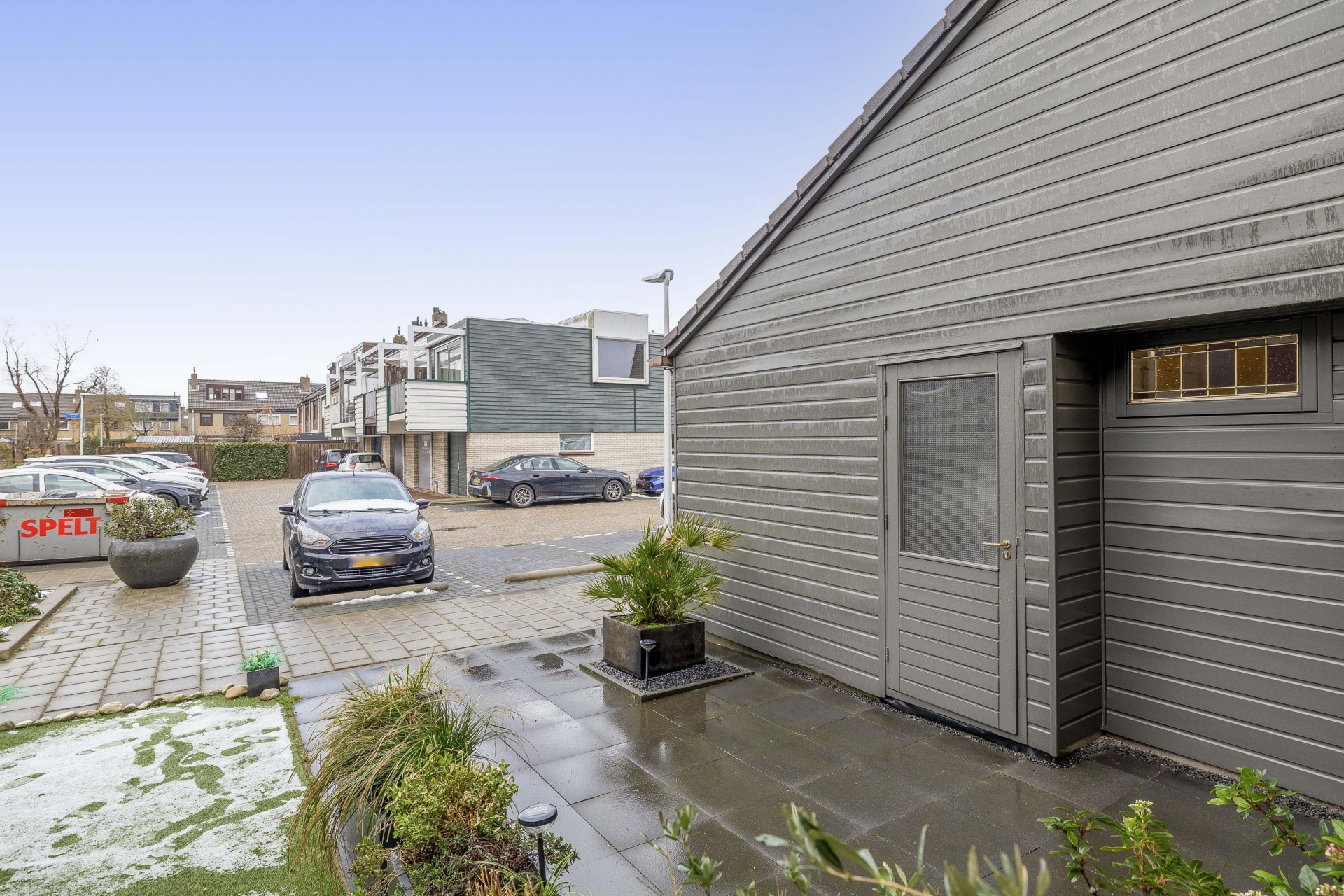 Ruime voortuin met toegang tot zowel de grote berging als de woning.