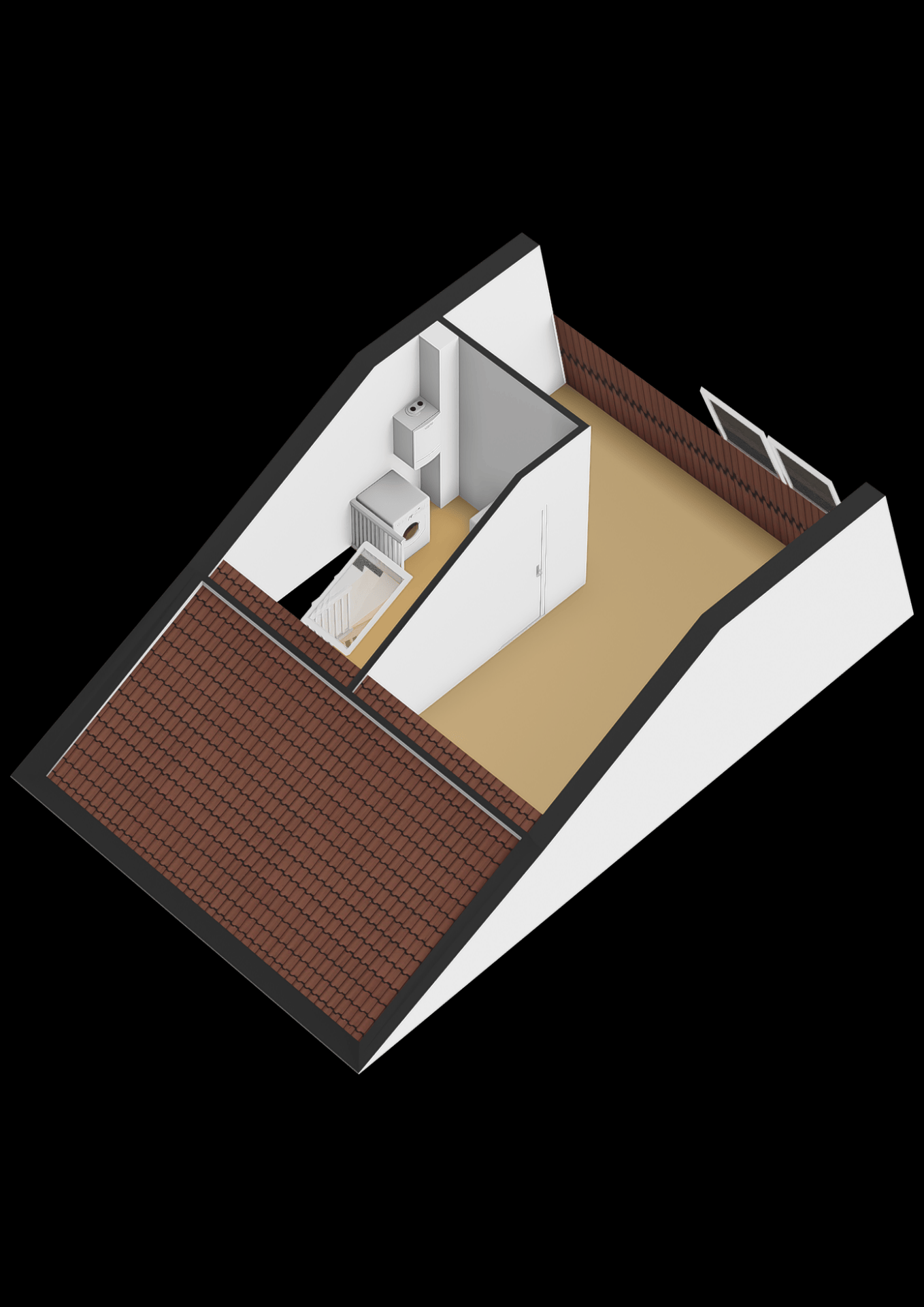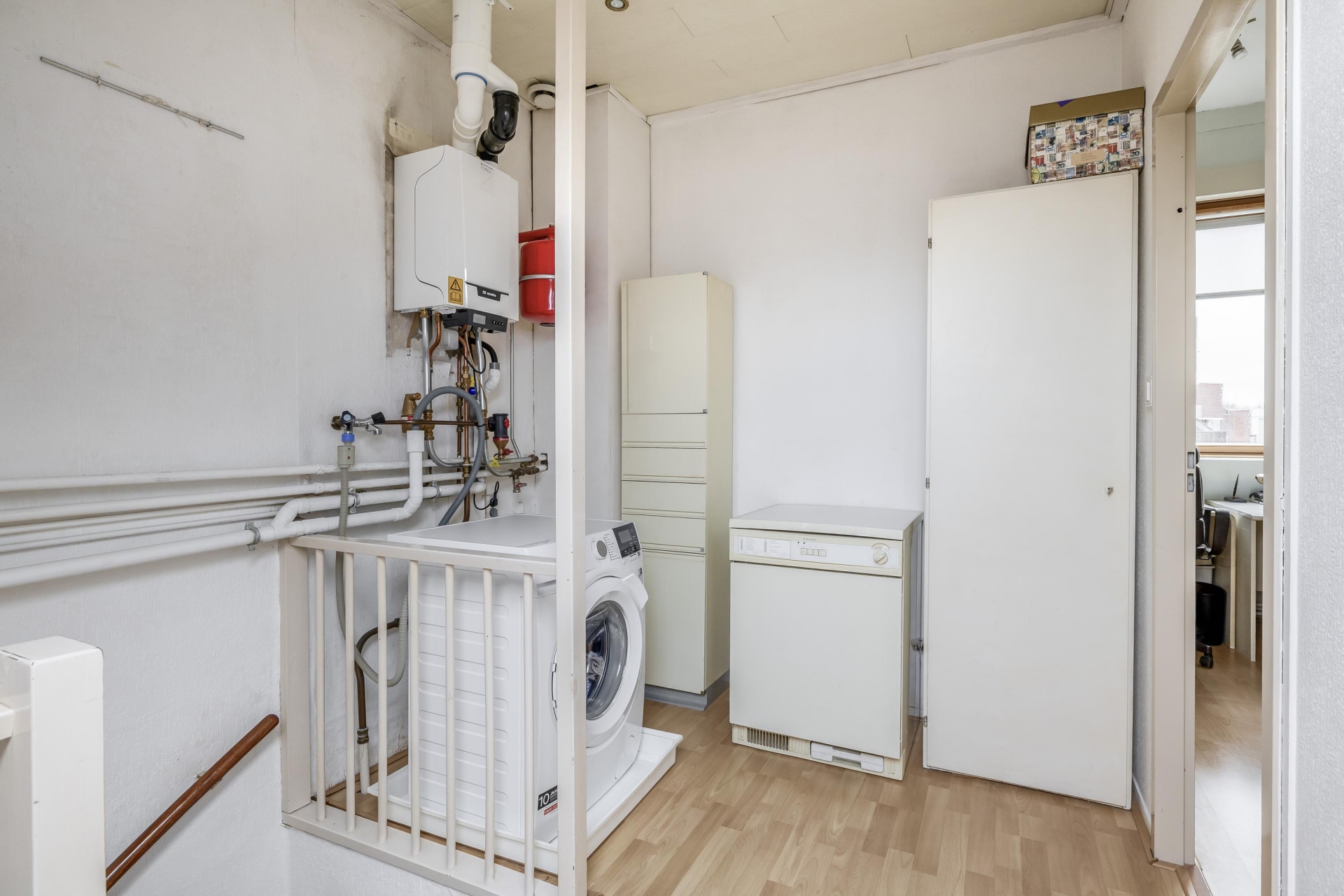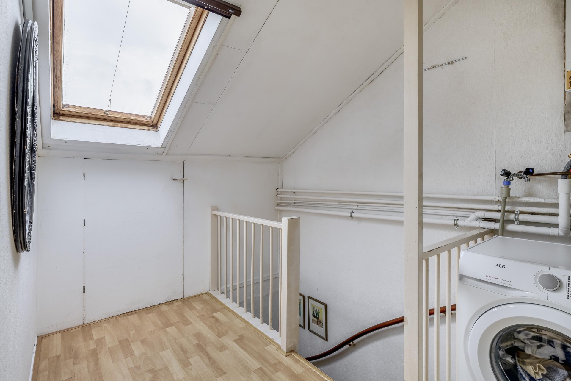 Voorzolder met aansluiting voor de wasmachine en opstelplaats voor de CV ketel (Remeha bouwjaar 2021). Dankzij de knieschotten is er extra bergruimte aanwezig.