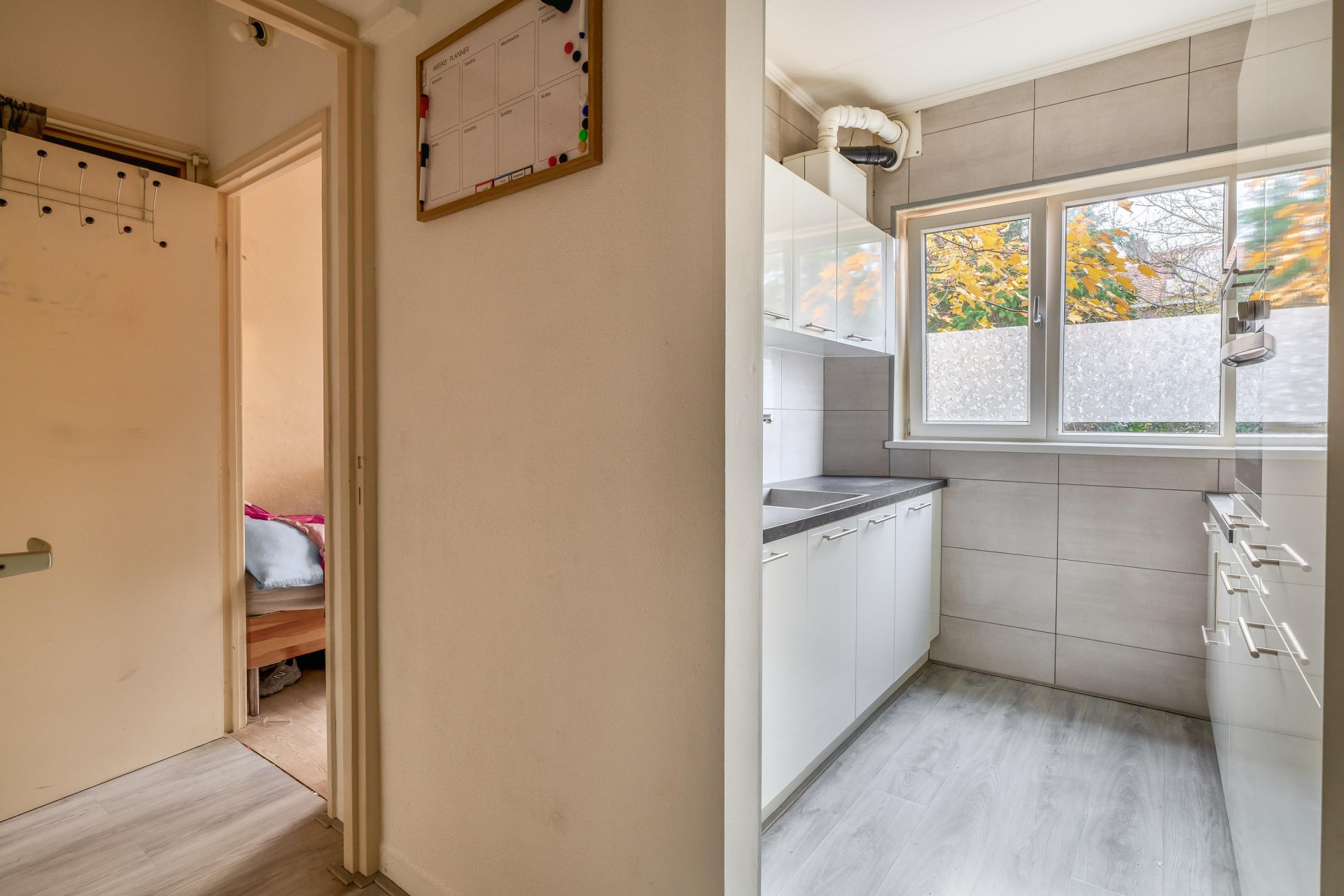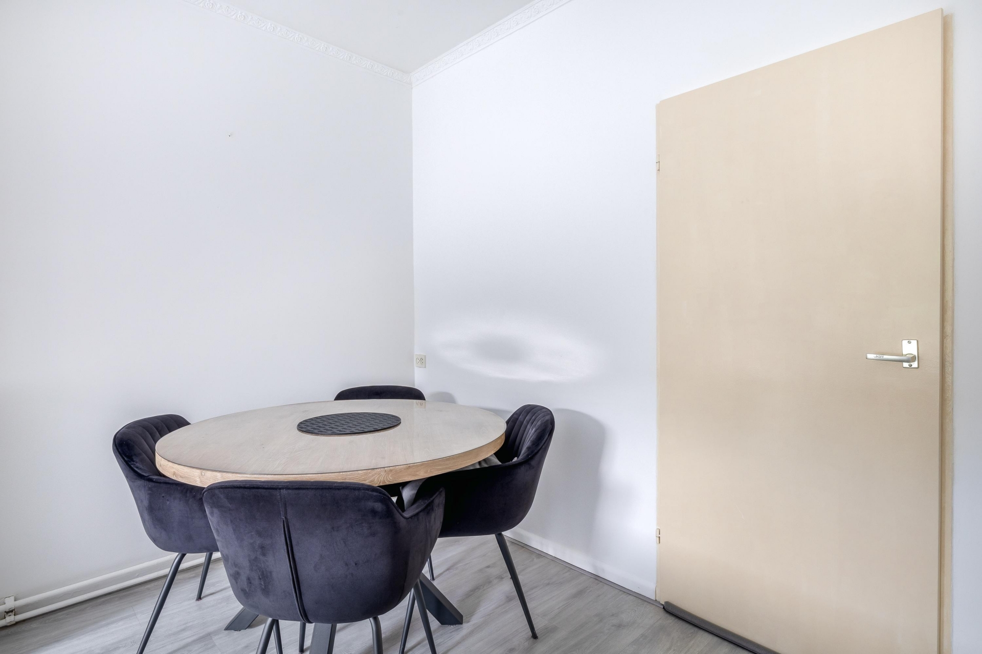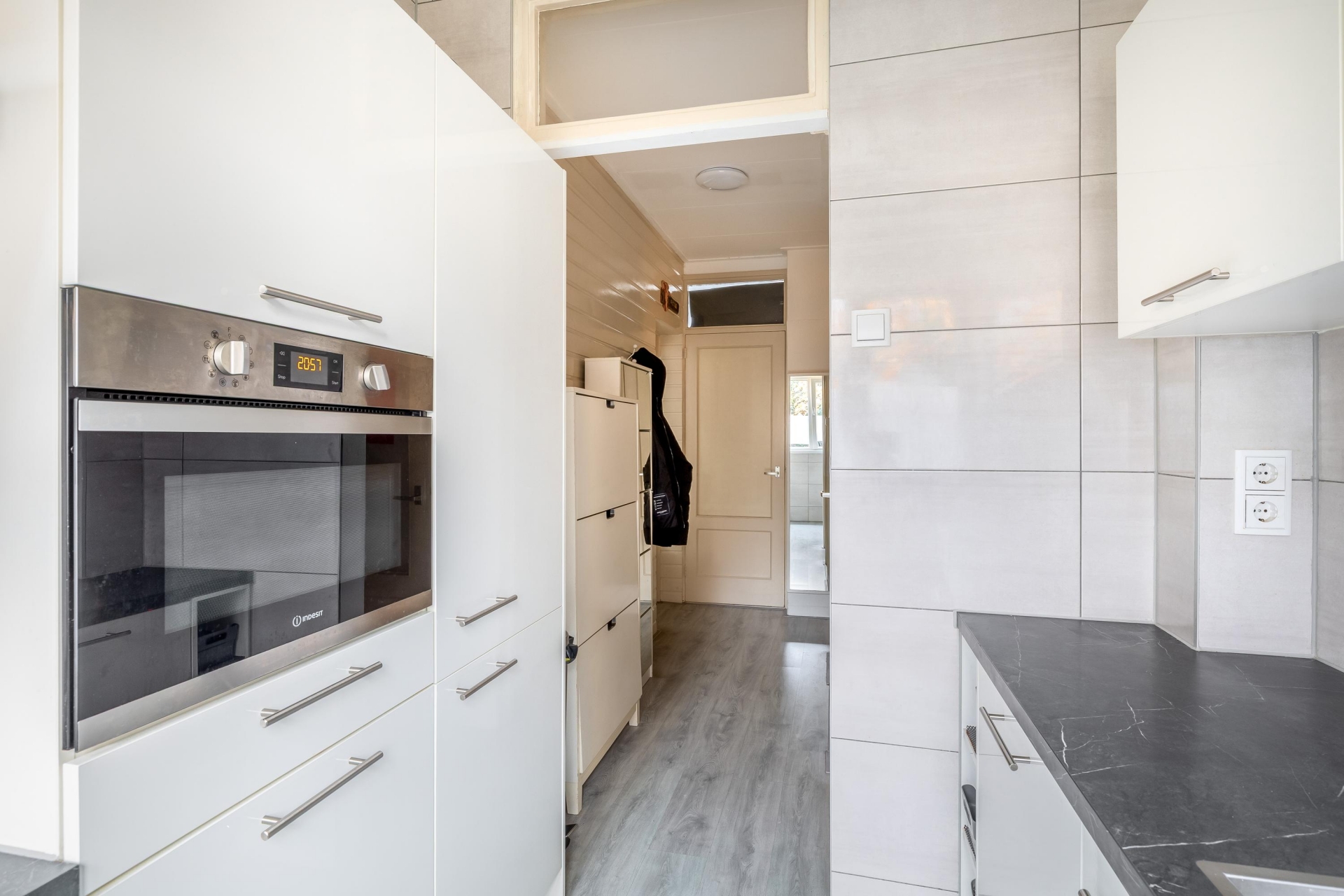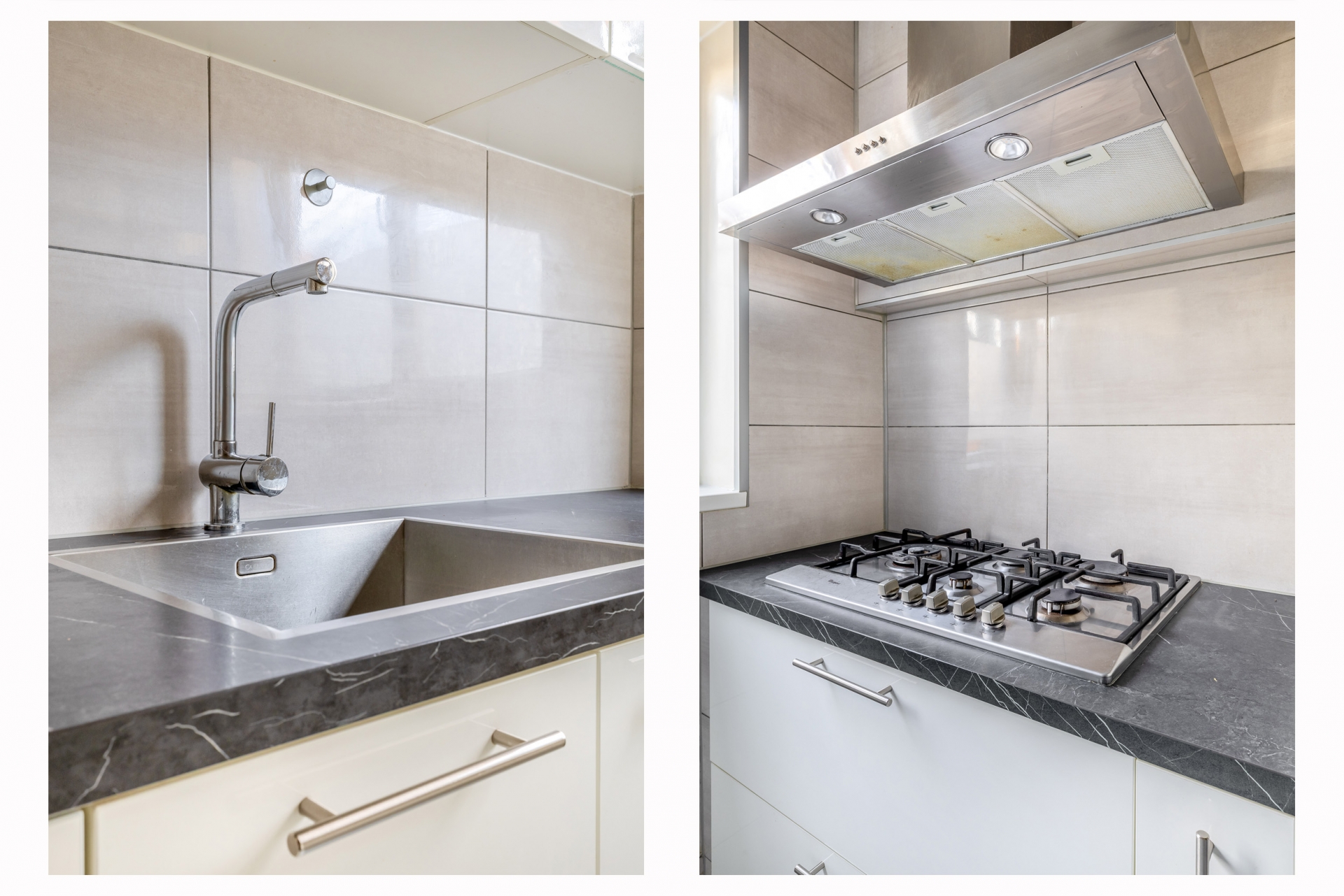 De keuken is in 2021 vernieuwd en dat zie je terug in de uitstraling en afwerking. Hoogglans witte kasten, een donker werkblad en een strakke wandafwerking zorgen voor een moderne look. Natuurlijk is er gedacht aan de benodigde inbouwapparatuur, zodat je hier moeiteloos je maaltijden bereidt. Door het raam kijk je uit op de groene binnentuinen aan de achterzijde van het complex, wat zorgt voor rust en privacy tijdens het koken.