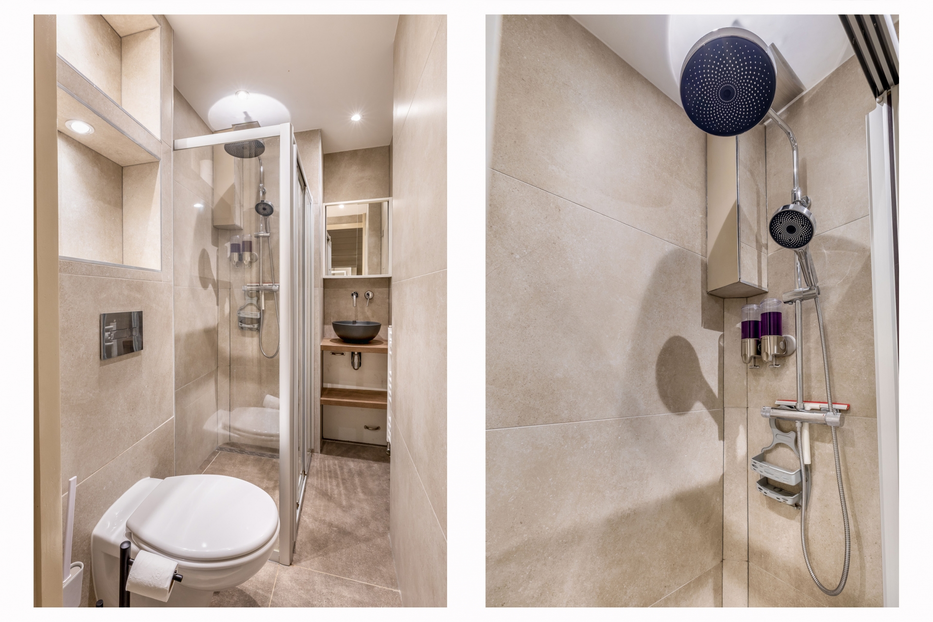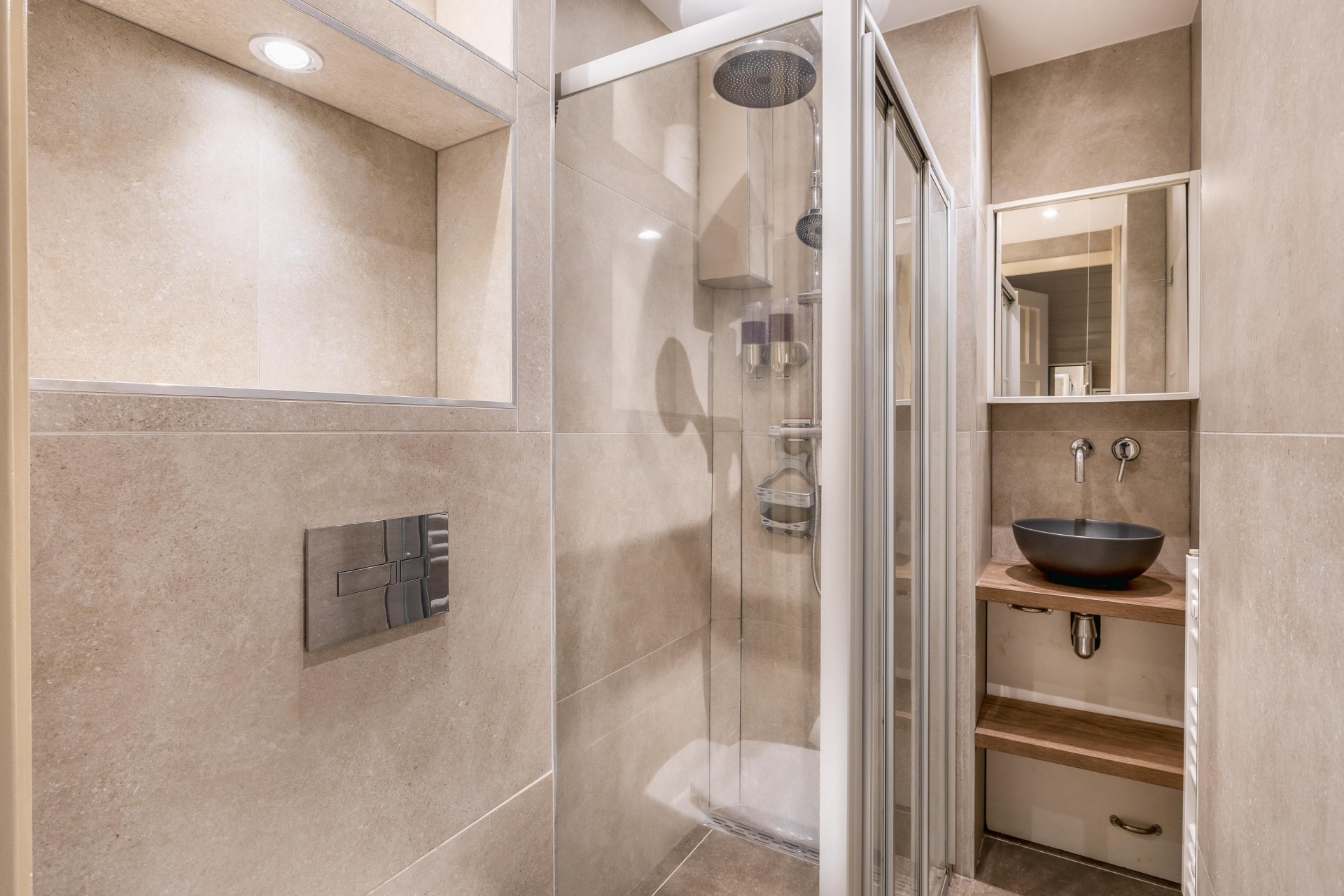 De badkamer is in 2023 volledig vernieuwd en uitgevoerd in moderne beige tegels met een stijlvolle afwerking. Je vindt hier een inloopdouche met glazen wand, een hangend toilet en een modern wastafelmeubel. Dankzij de slimme indeling is deze compacte ruimte toch verrassend compleet én comfortabel.
