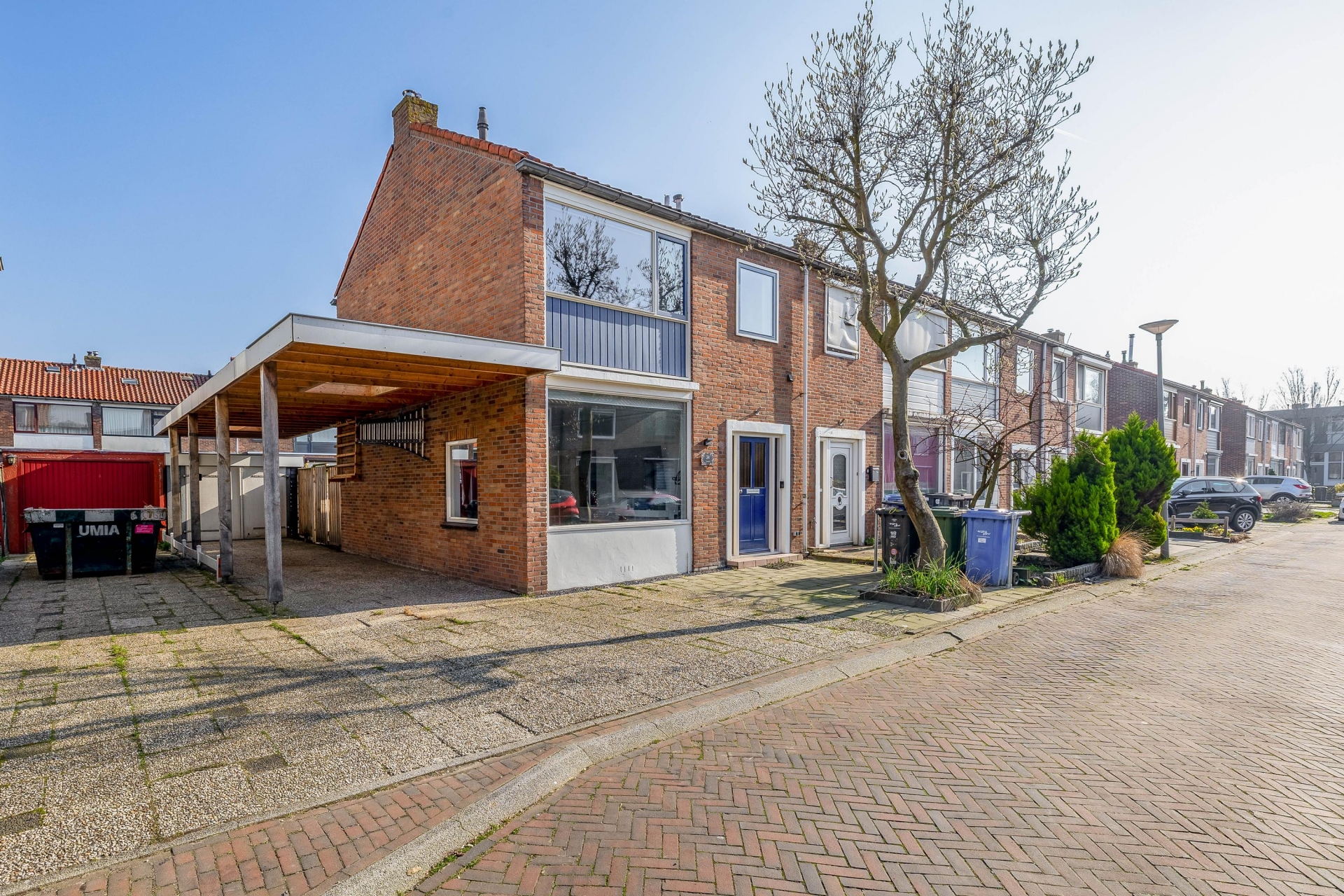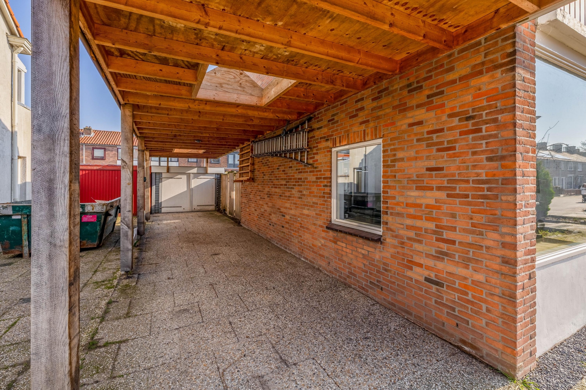 Langs de zijkant van het huis ligt de lange oprit met carport, waar meerdere auto’s op eigen terrein kunnen worden geparkeerd. Dit maakt het huis extra aantrekkelijk voor mensen die graag hun auto op eigen grond parkeren.