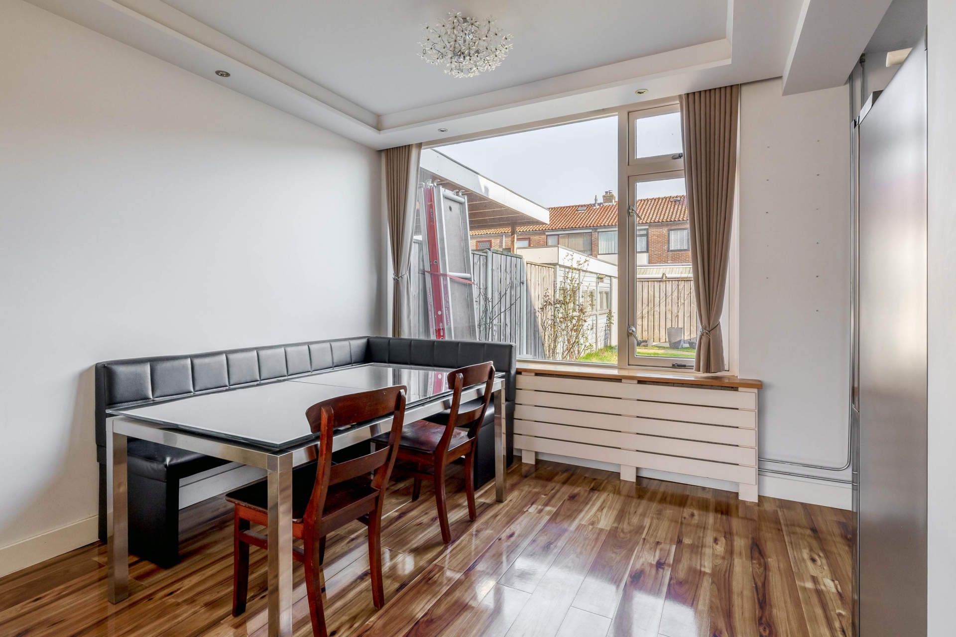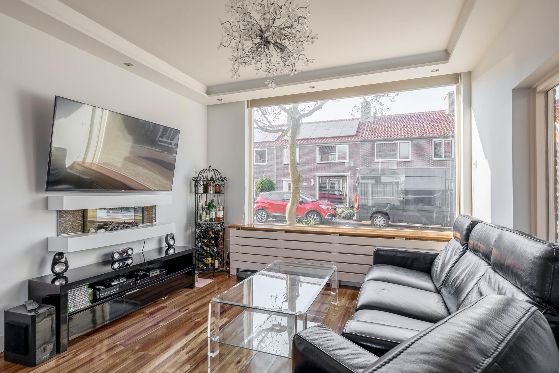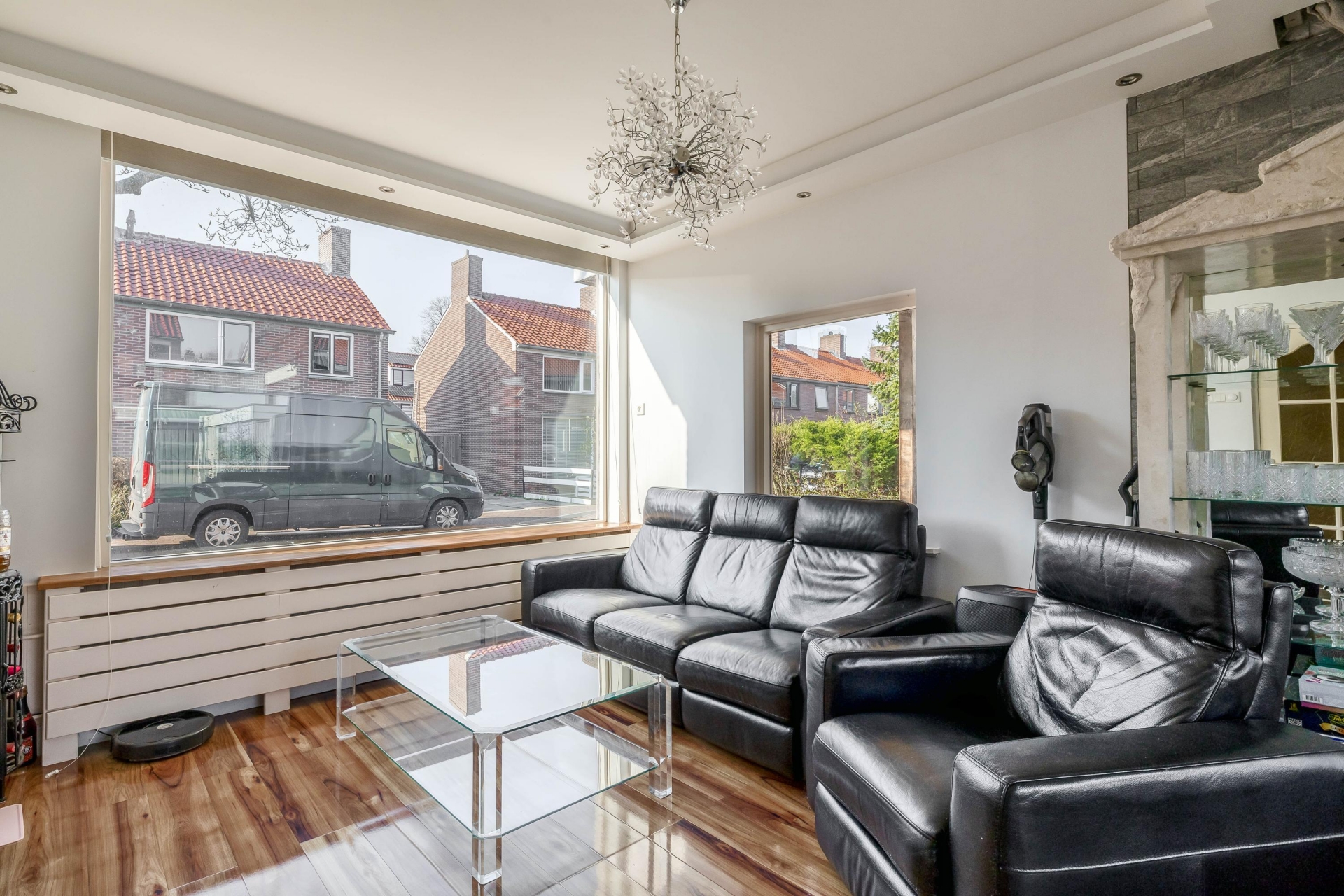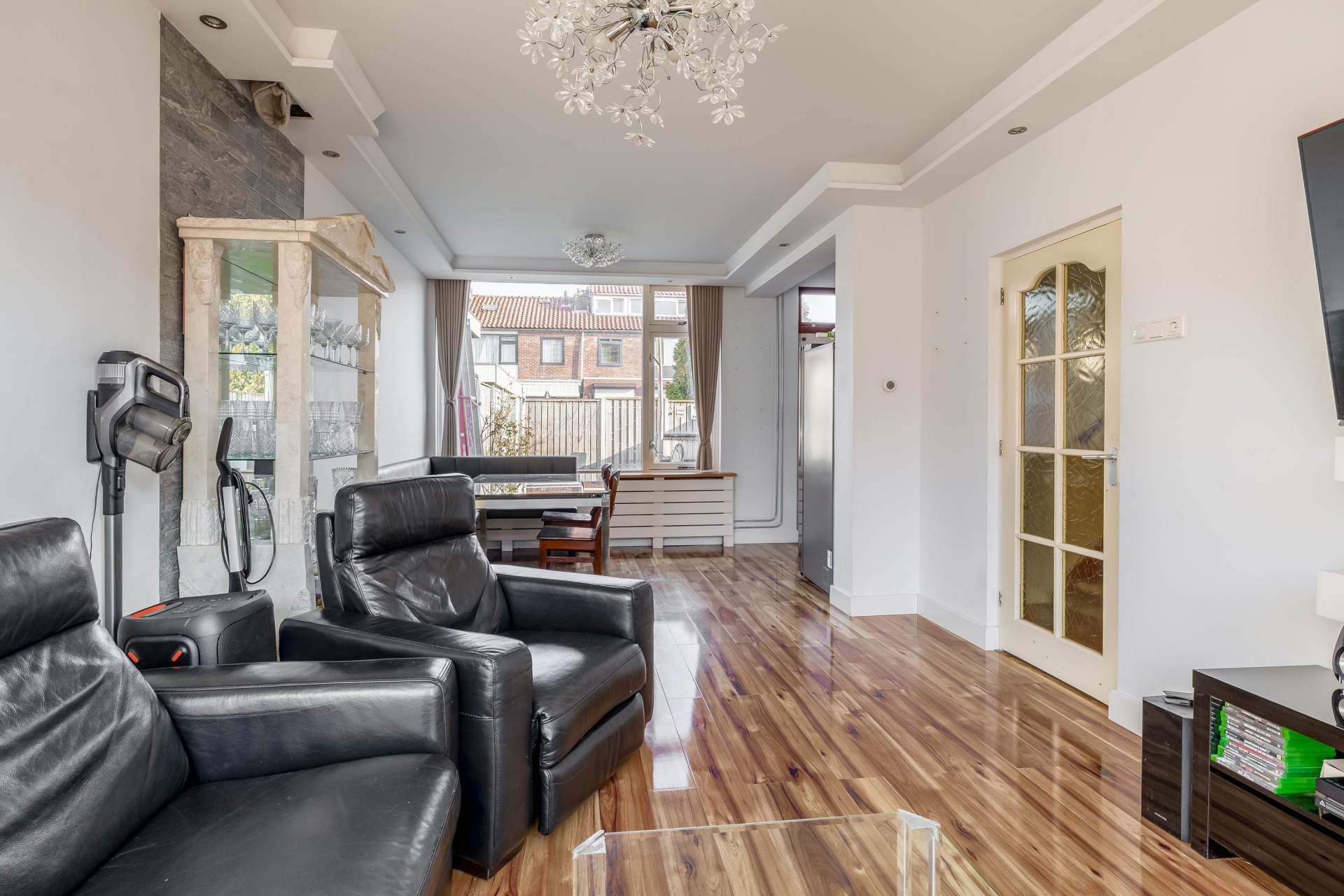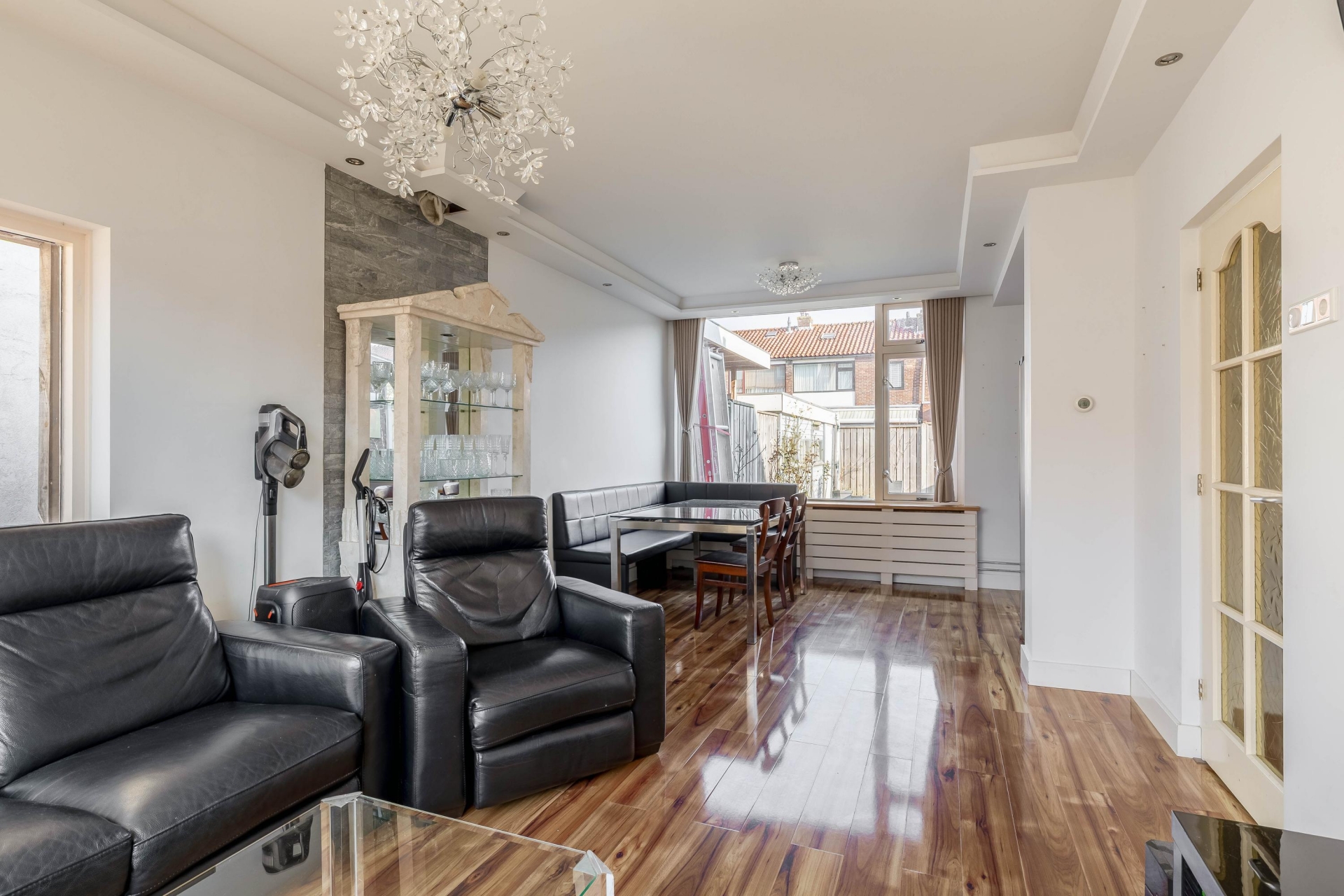 De woonkamer is een fijne en lichte ruimte dankzij de grote raampartijen aan zowel de voor- als achterzijde. Hierdoor komt er gedurende de dag veel natuurlijk licht binnen. De ruimte biedt volop mogelijkheden om een comfortabele zithoek te creëren aan de voorzijde en een gezellige eethoek richting de tuin.