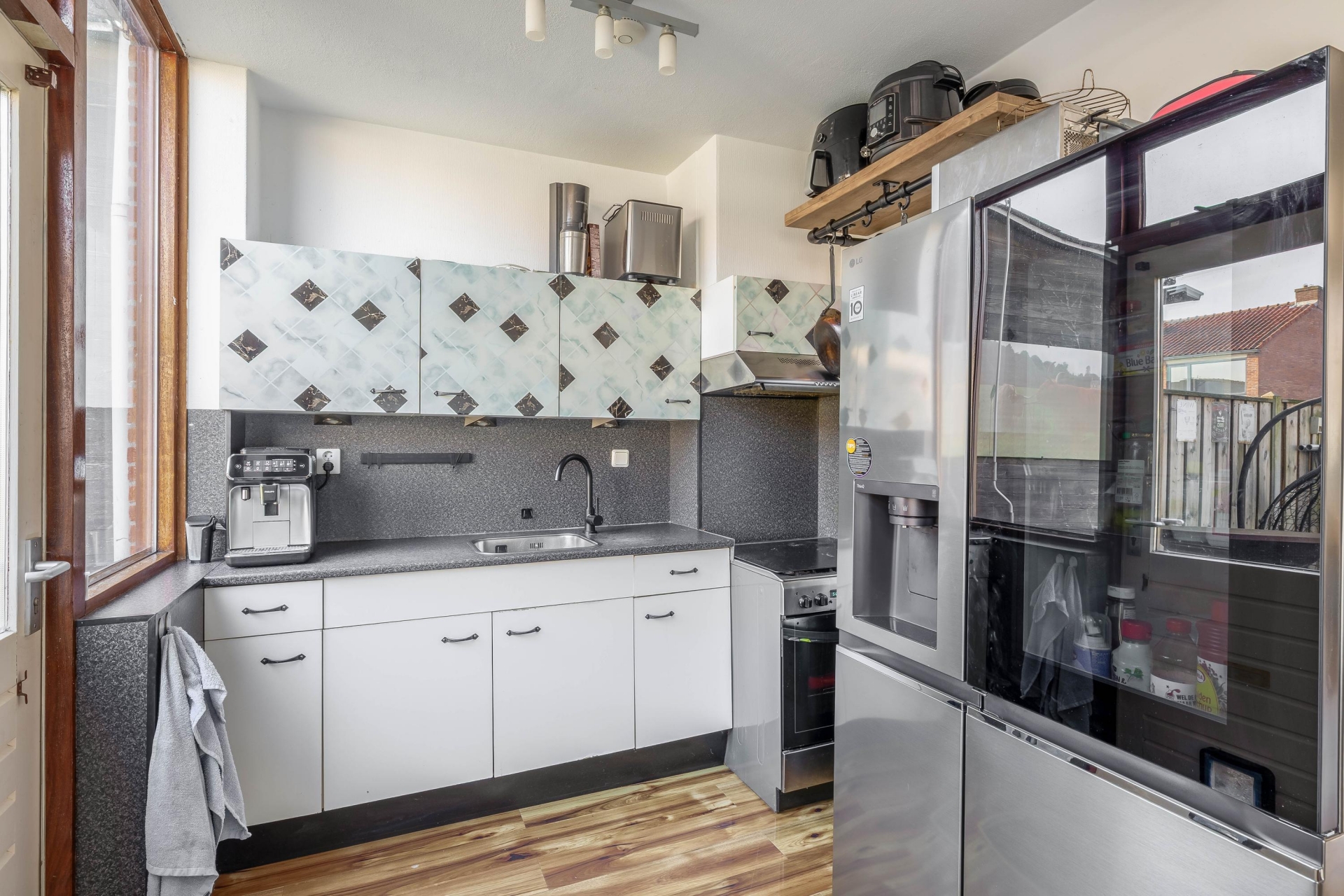 De keuken is praktisch ingericht en voorzien van diverse kastruimte en werkblad. Vanuit de keuken heb je direct toegang tot de achtertuin.