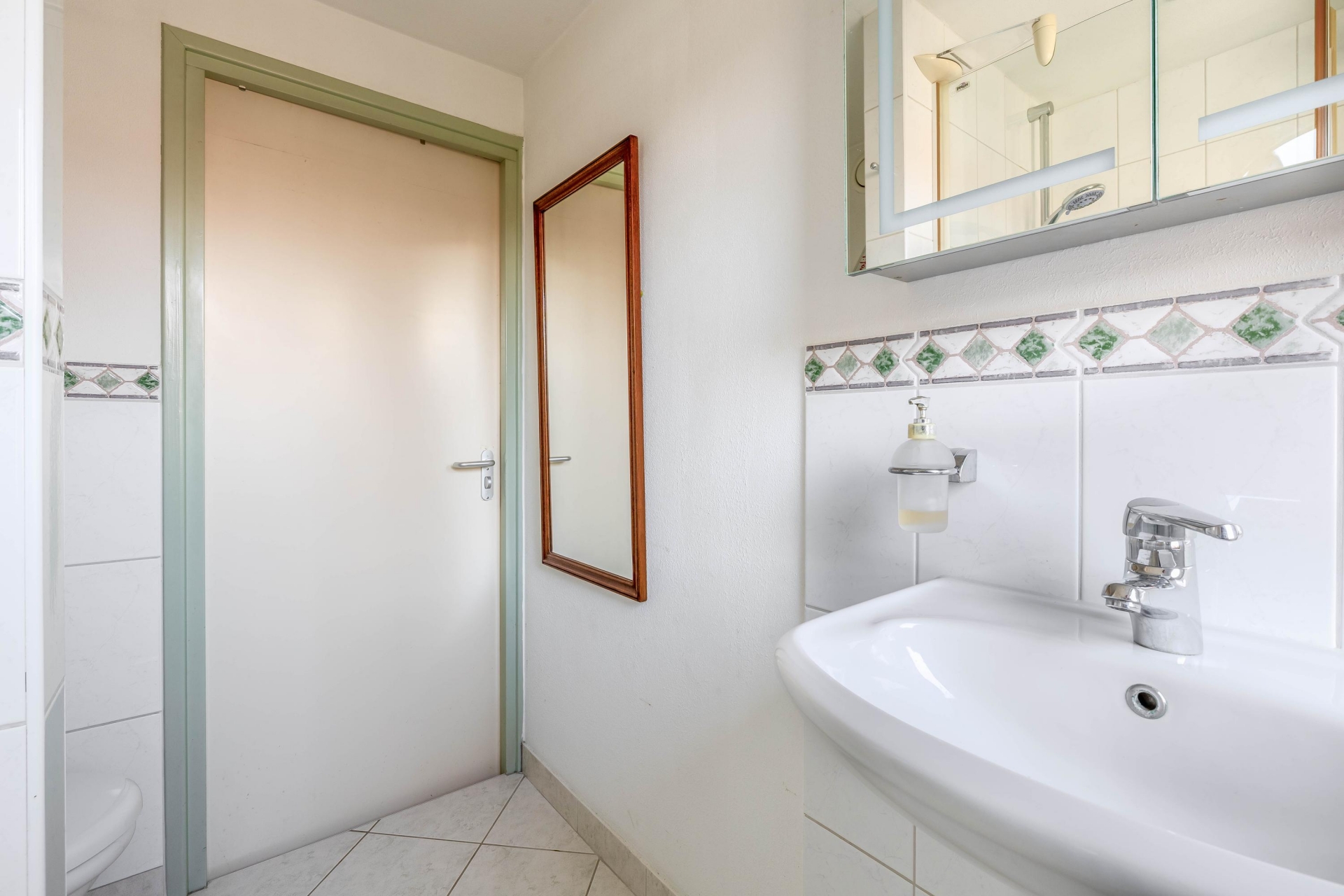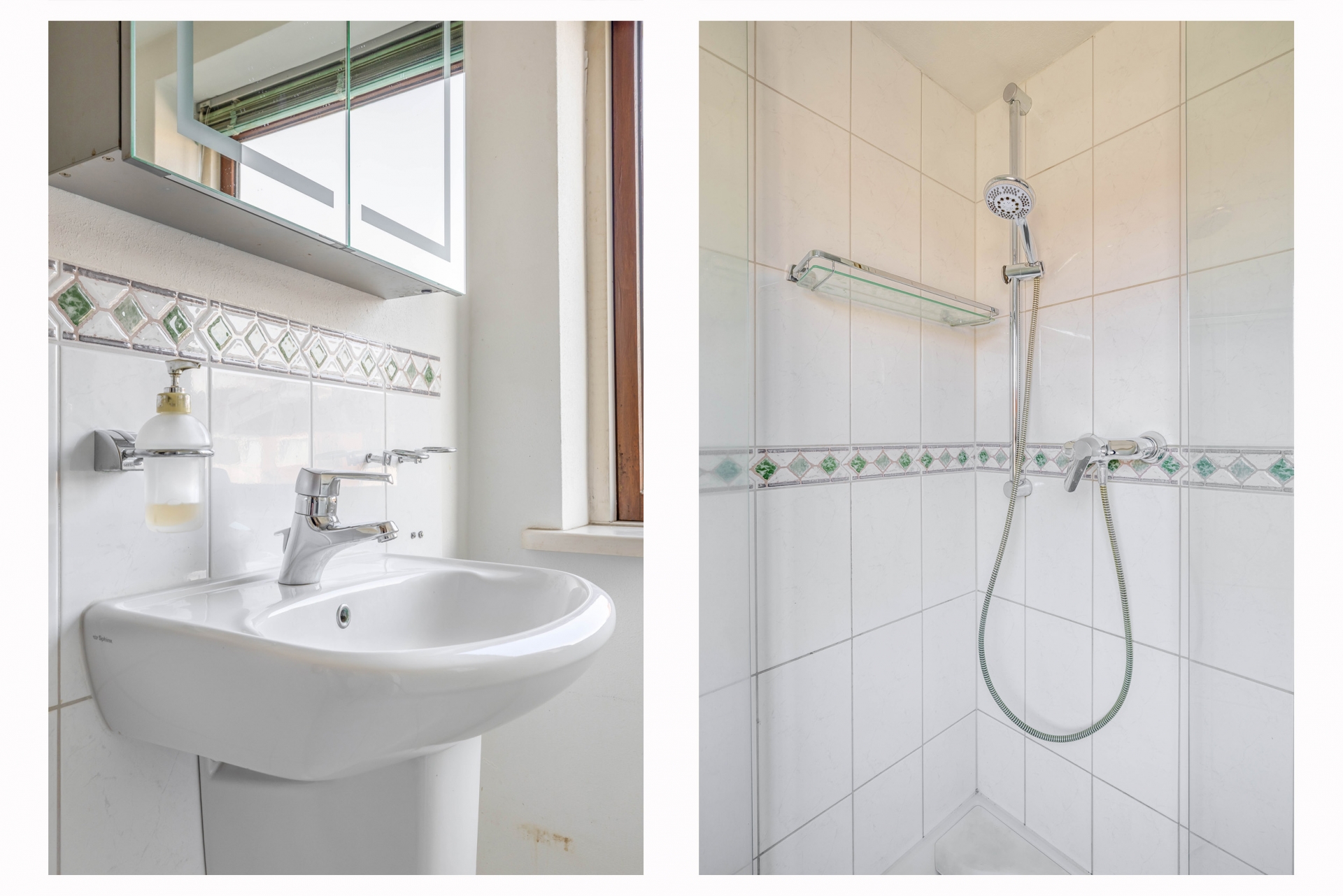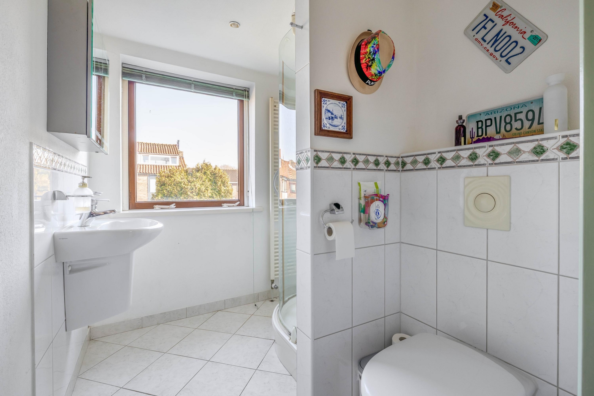 De badkamer is praktisch ingericht en voorzien van een douche, wastafel en een tweede toilet. Dankzij het raam is er natuurlijk daglicht en ventilatie aanwezig.