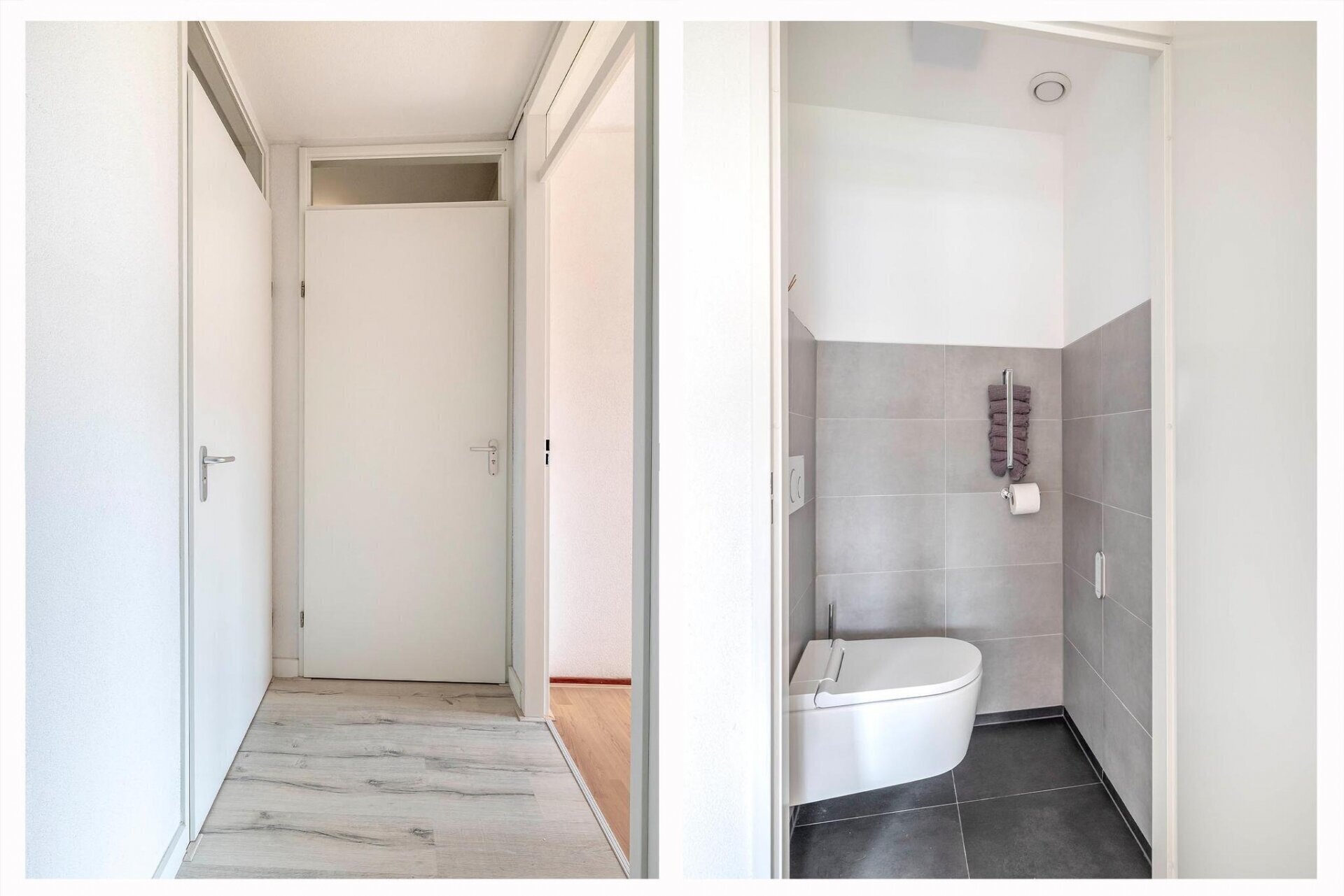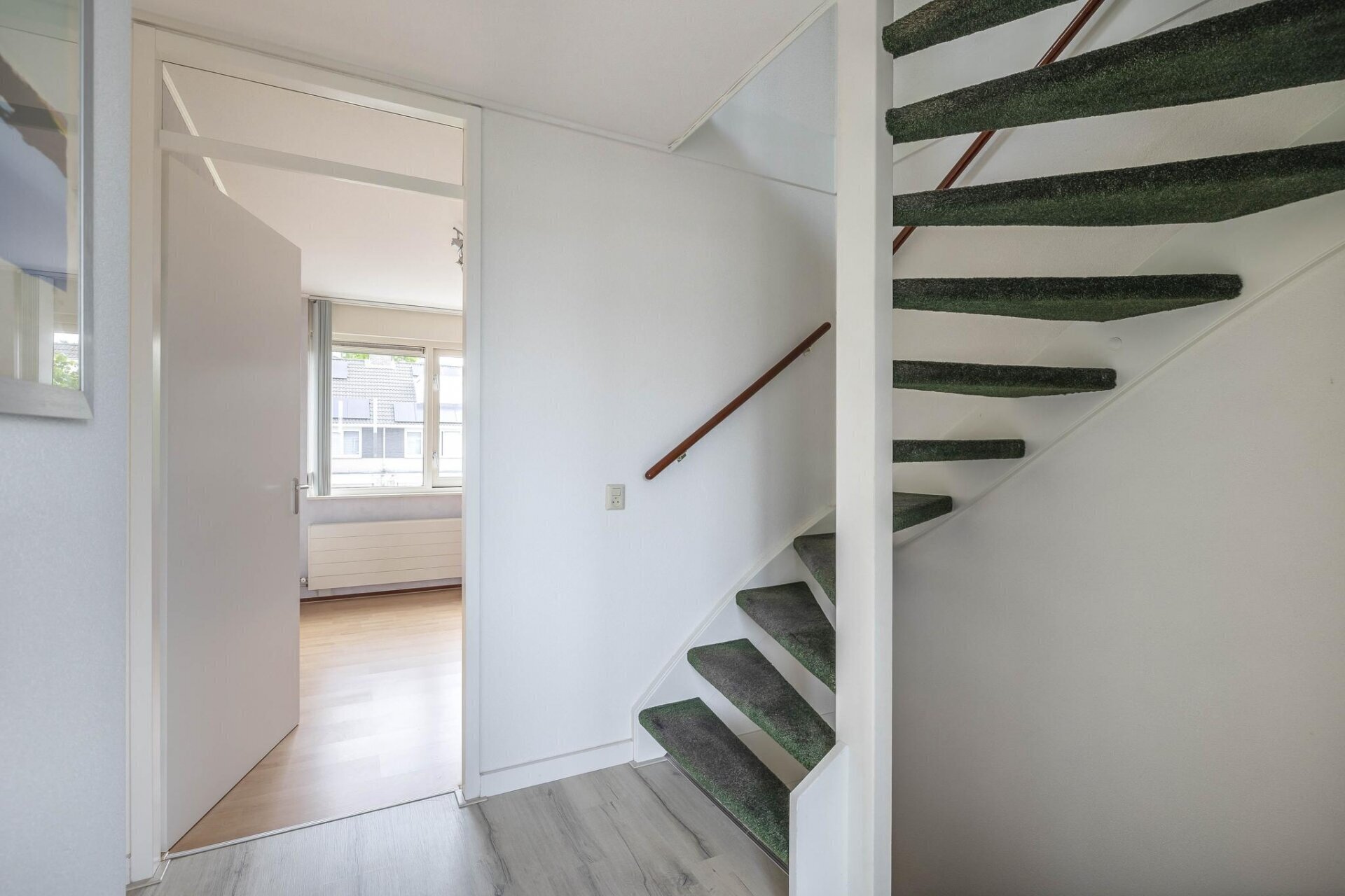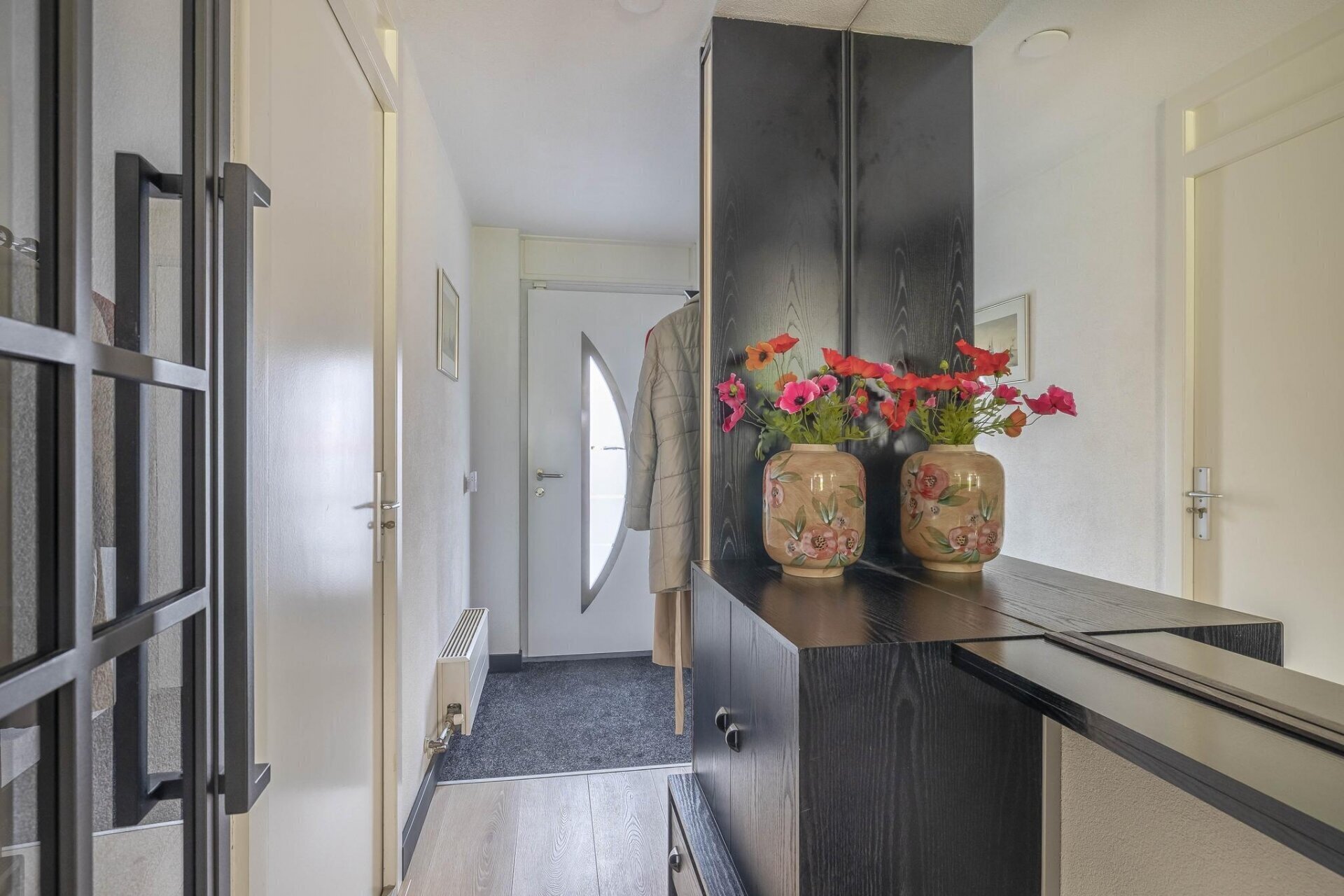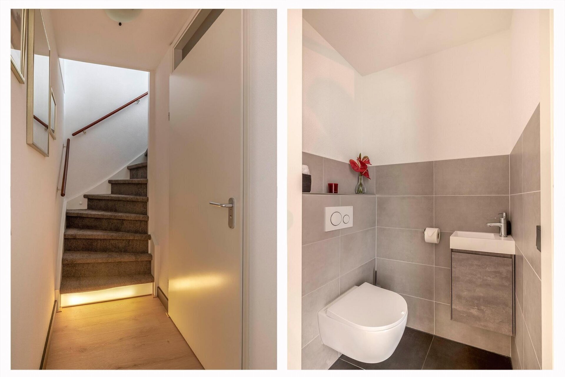 De woonkamer biedt toegang tot een tussenhal, hierin bevindt zich het toilet met fonteintje en de trapopgang naar de eerste verdieping.