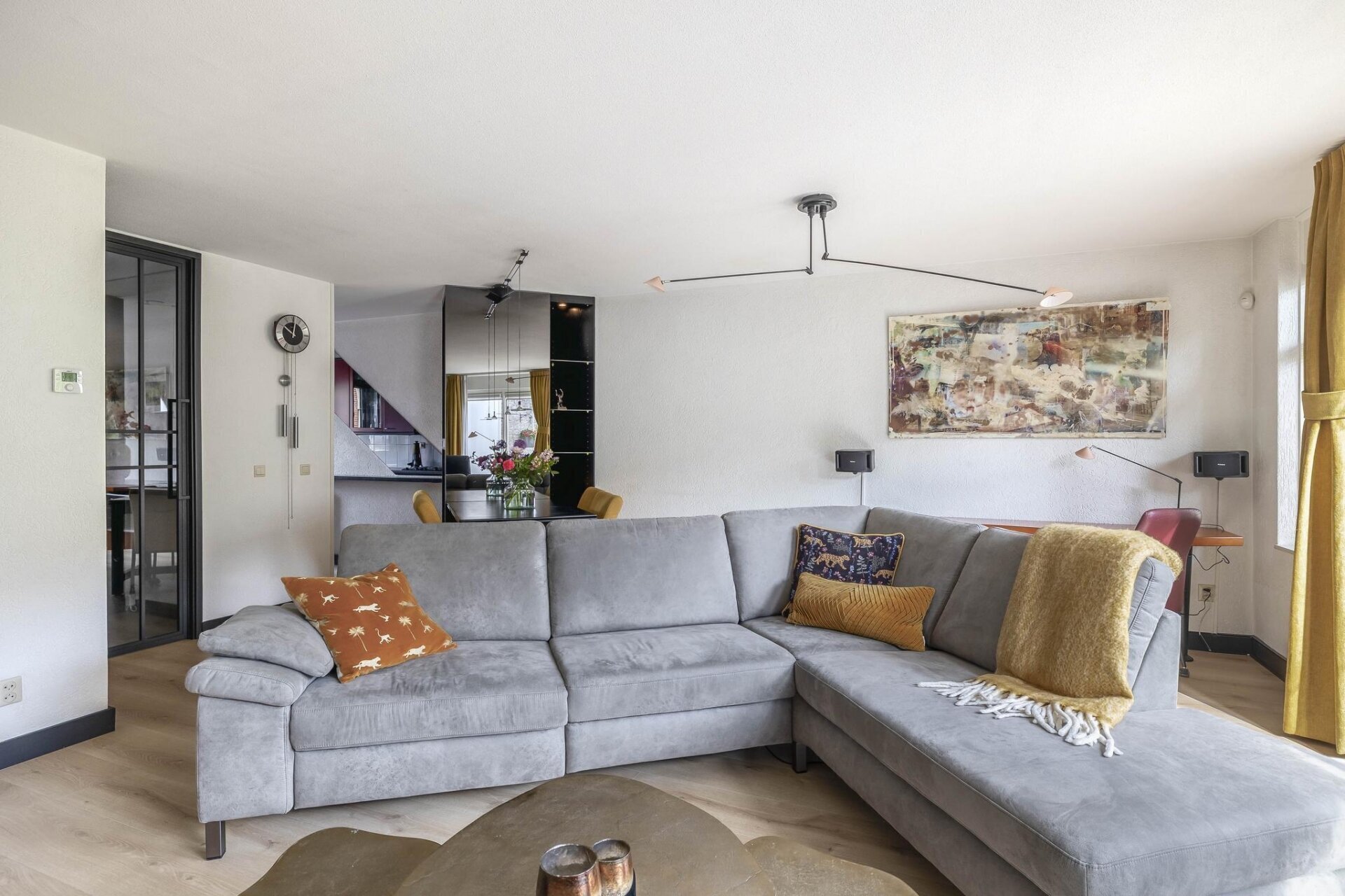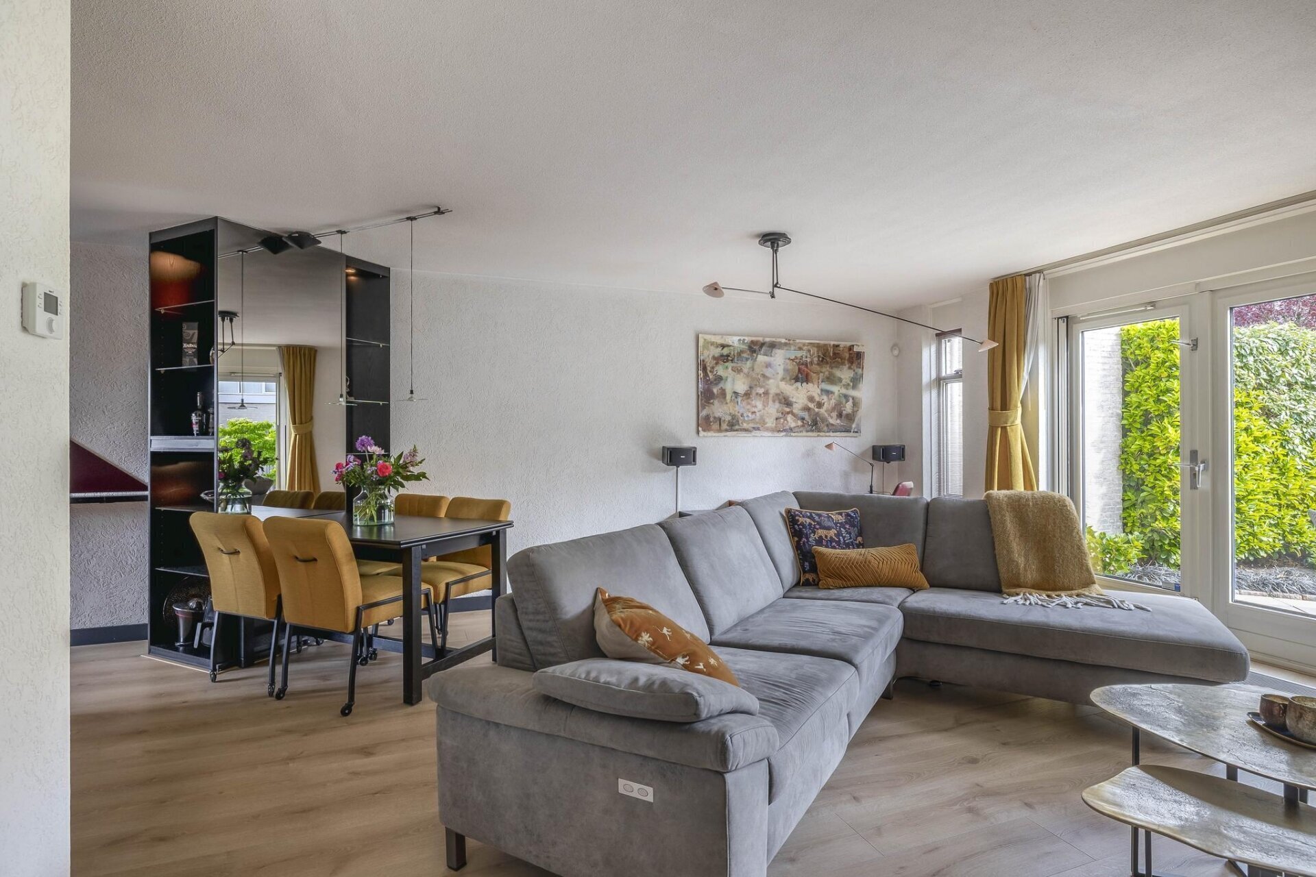De woonkamer aan de achterzijde van de woning is voorzien van een convectorput en openslaande deuren naar de zonnige achtertuin.