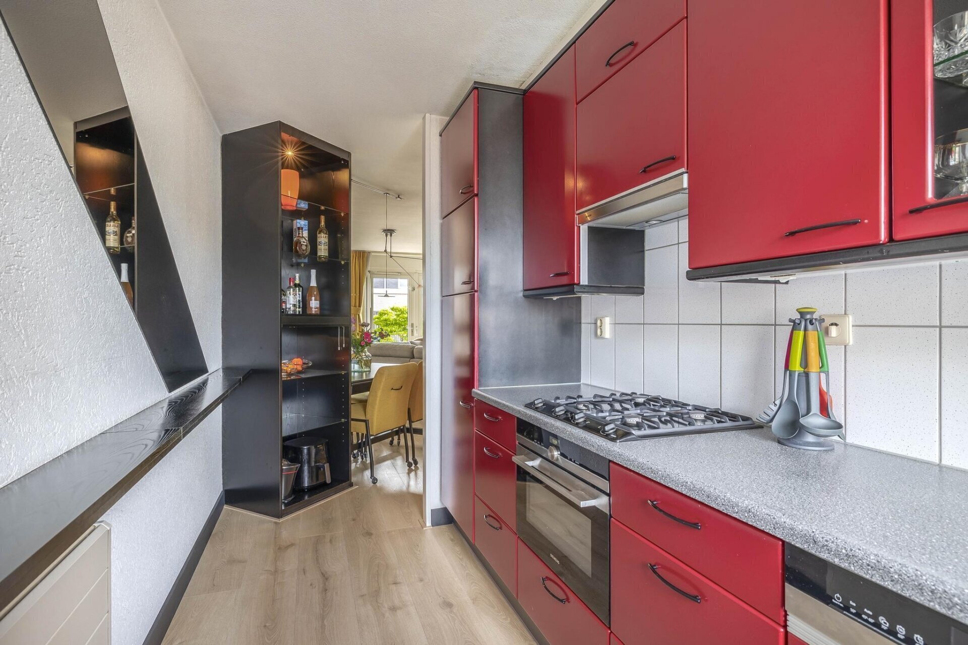 Aan de voorzijde van de woning bevindt zich de keurige keuken in een speelse opstelling. De keuken is onder meer voorzien van een 4 pits gaskookplaat, koelkast met vriesvak, vaatwasser en combimagnetron. Het keukenraam is voorzien van een rolluik.